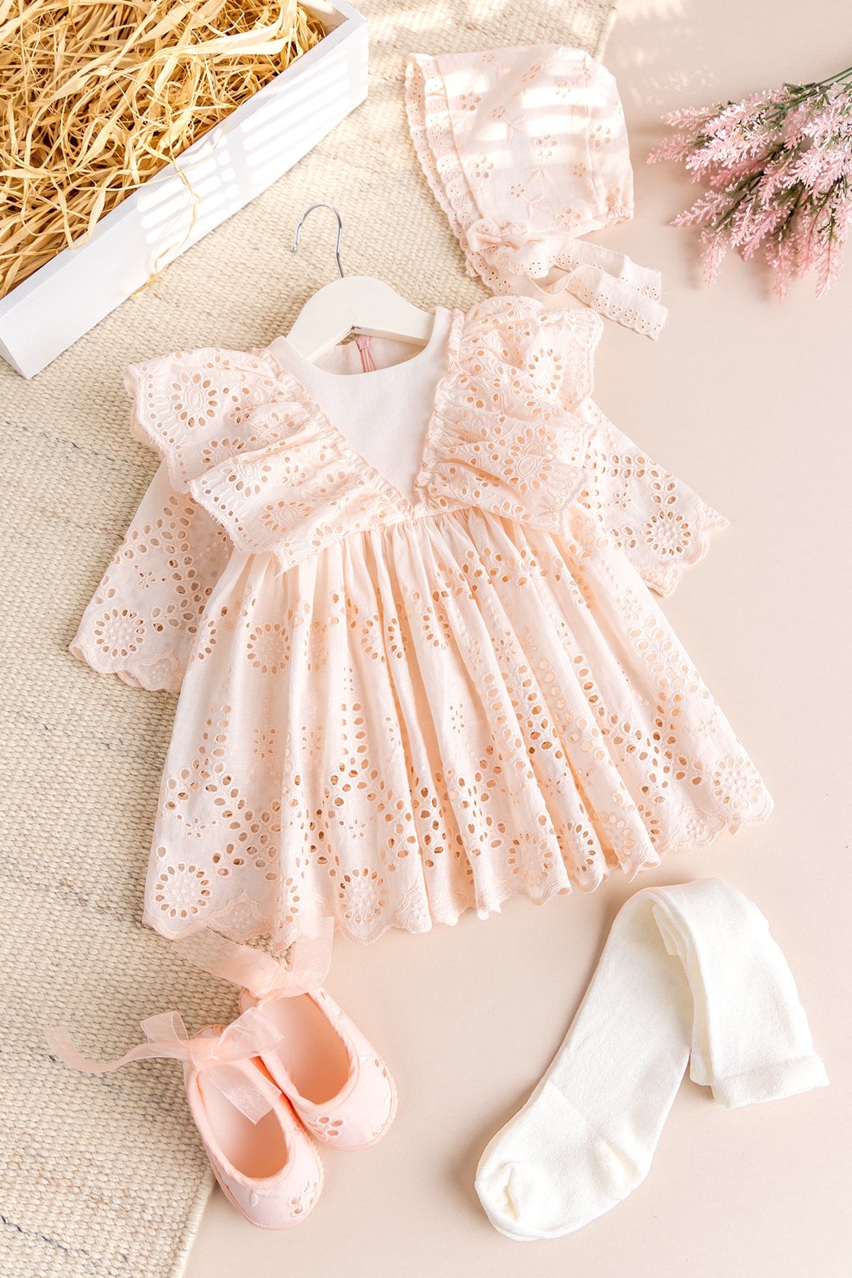 This 100% Cotton 4-Piece Girl Baby Mawlud Dress Set, produced with completely natural and healthy materials, offers both comfort and elegance to your little princess. With its skin-friendly cotton fabric structure, breathable texture and elegant details, this set is an ideal choice for mawlud, hospital discharge, birthday, special invitations and studio photo shoots.