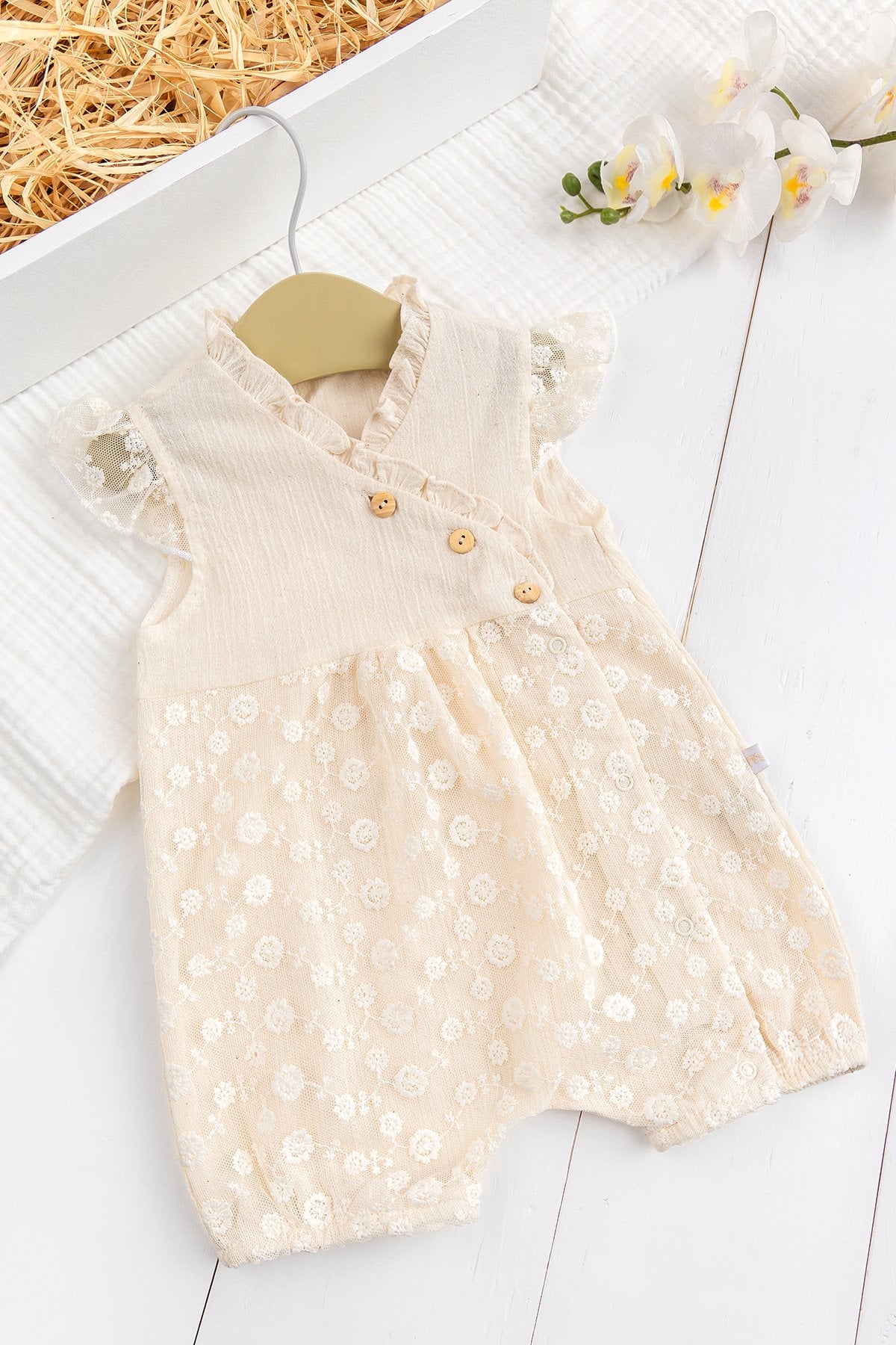 %100 Pamuk Tüllü Fırfrlı Yazlık Kız Bebek Müslin Tulum Krem