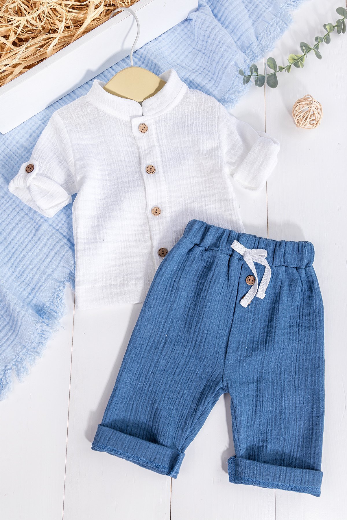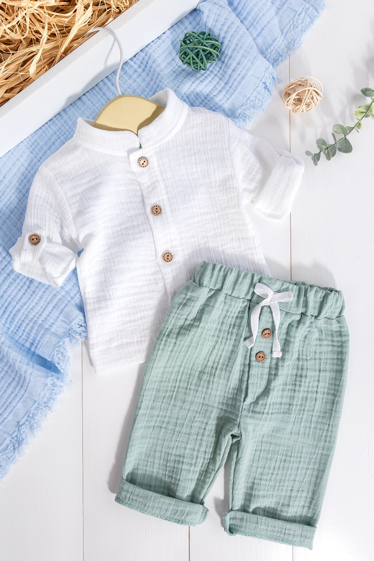 %100 Pamuklu Müslin Düğmeli Alt Üst Erkek Bebek Takımı