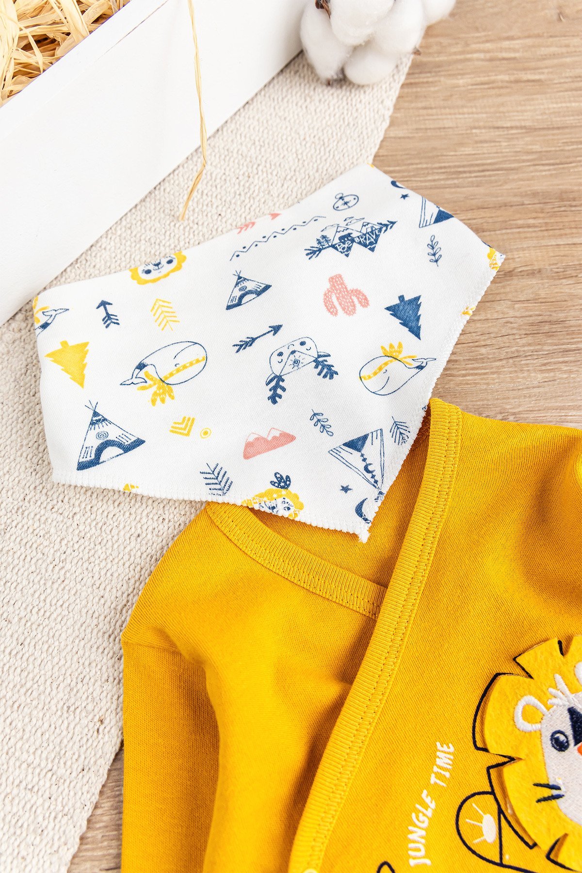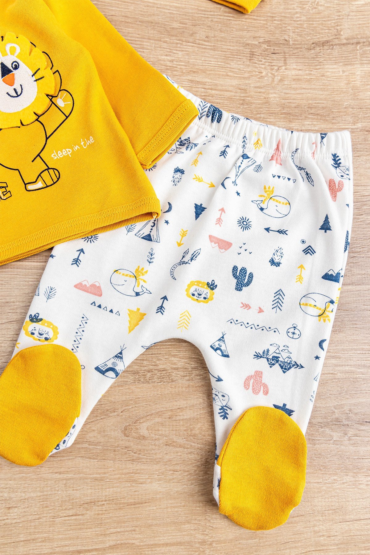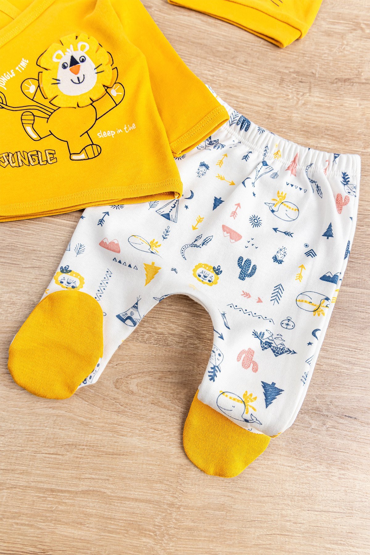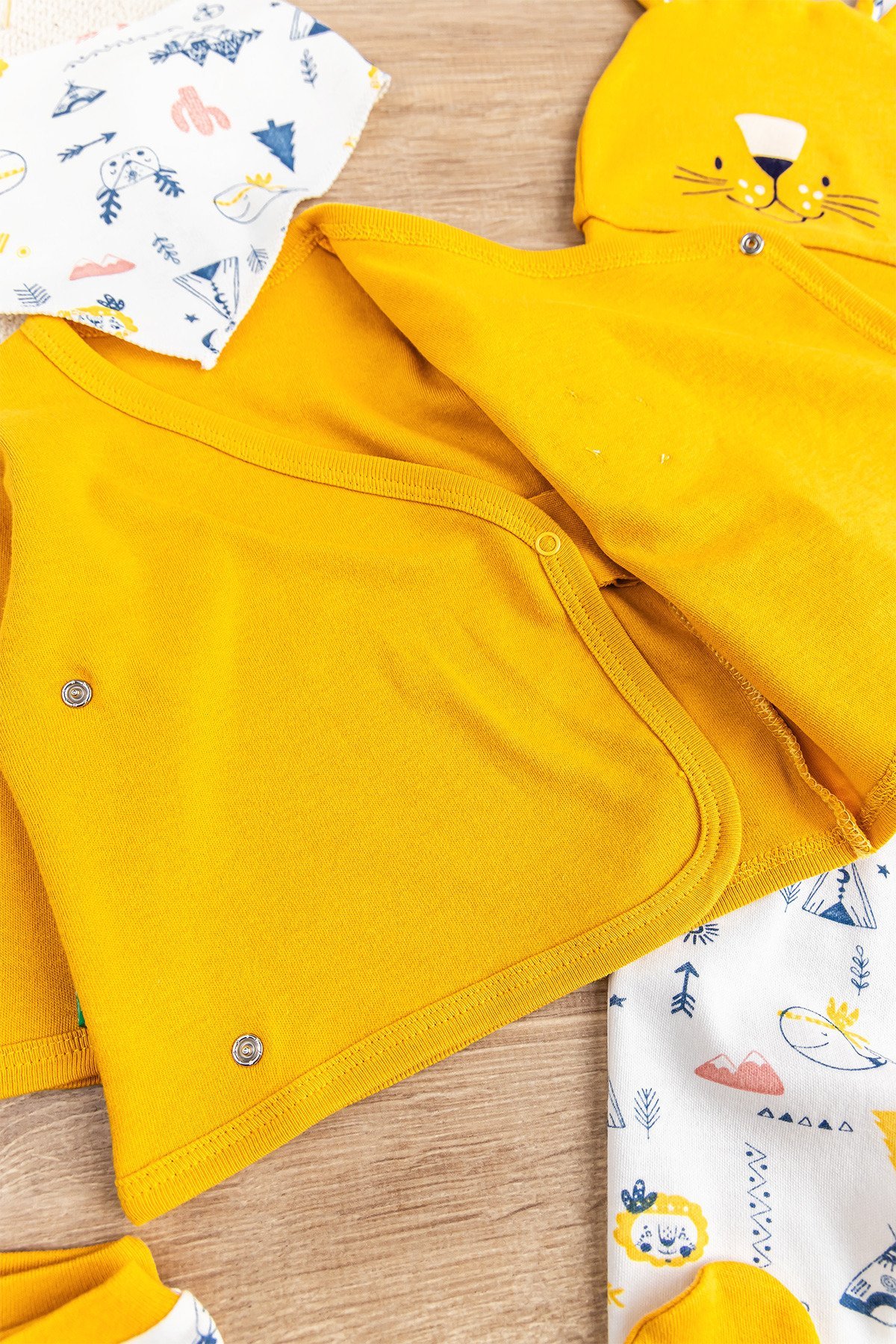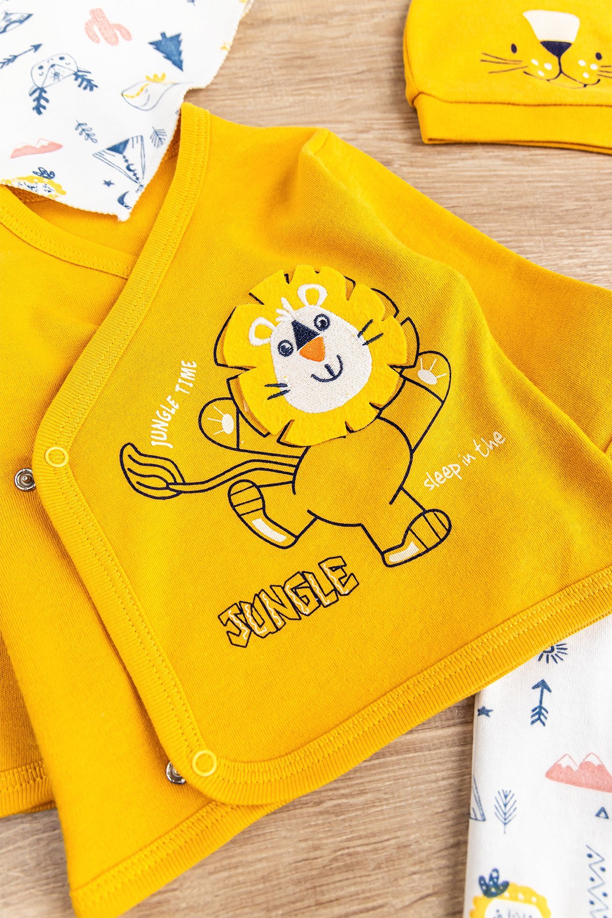 Aslan Figürlü Pamuklu 5 Parça Erkek Bebek Hastane Çıkışı Bebek Takımı Hardal Sarısı - 0-3 AY