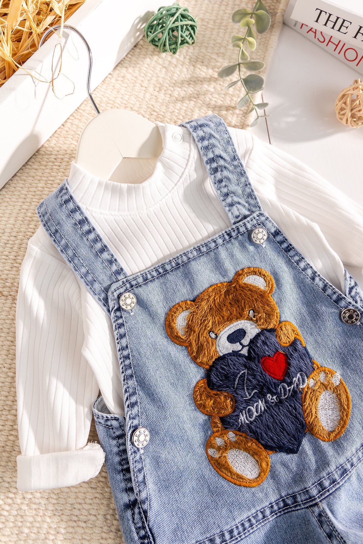 - Sevimli ayıcık figürü ile süslenmiş bu 2’li erkek bebek kot salopet tulum takımı, minik bebekleriniz için hem şık hem de konforlu bir günlük giyim seçeneğidir.