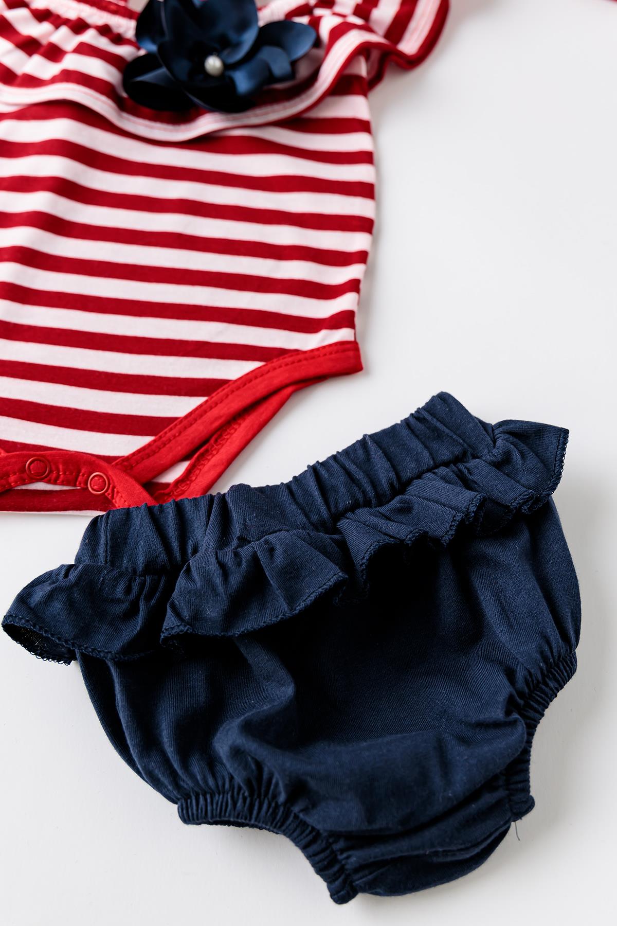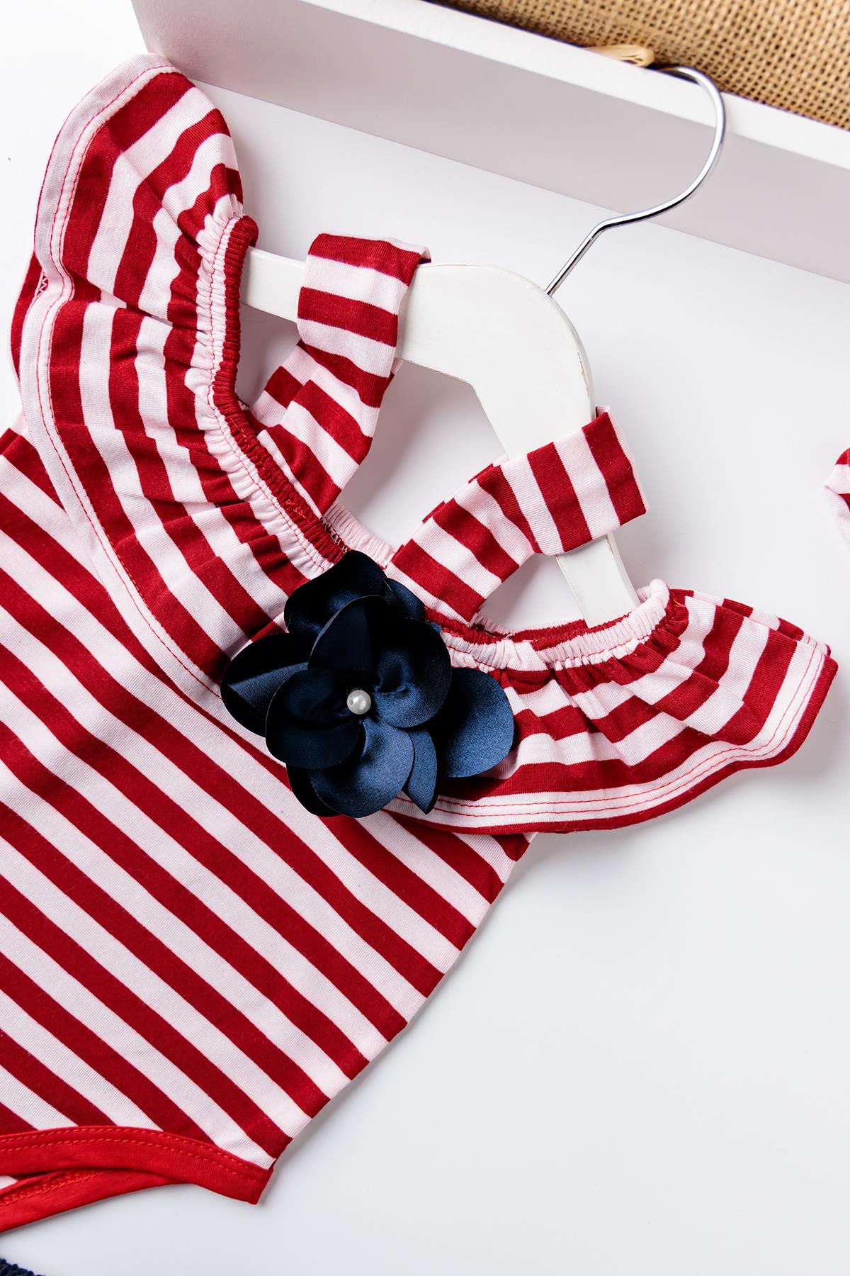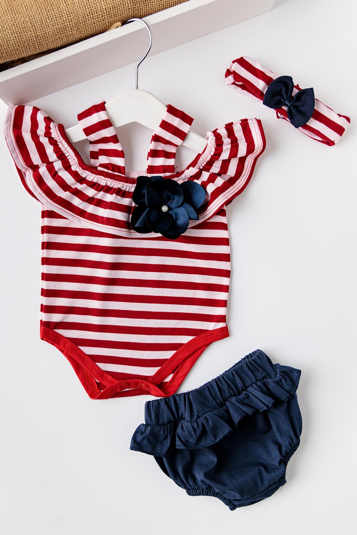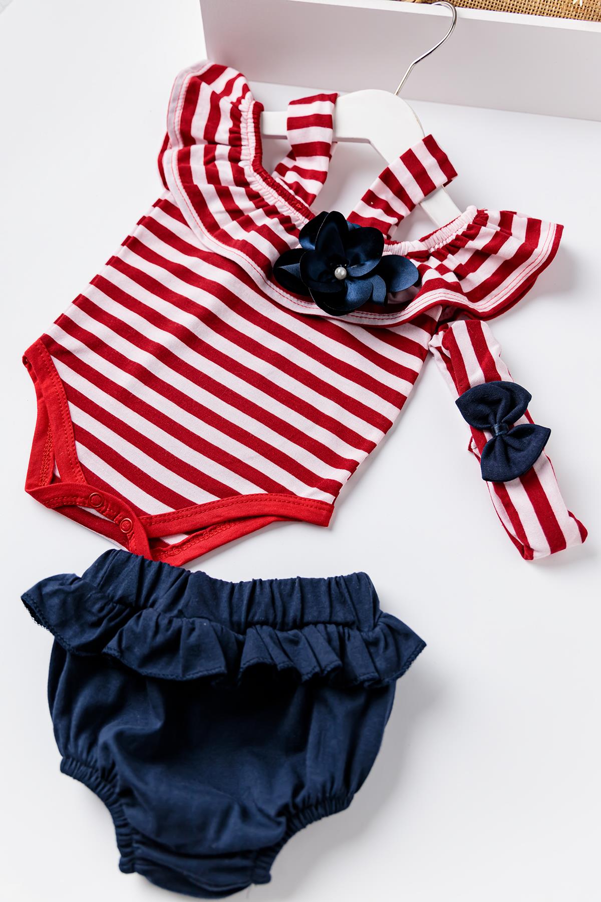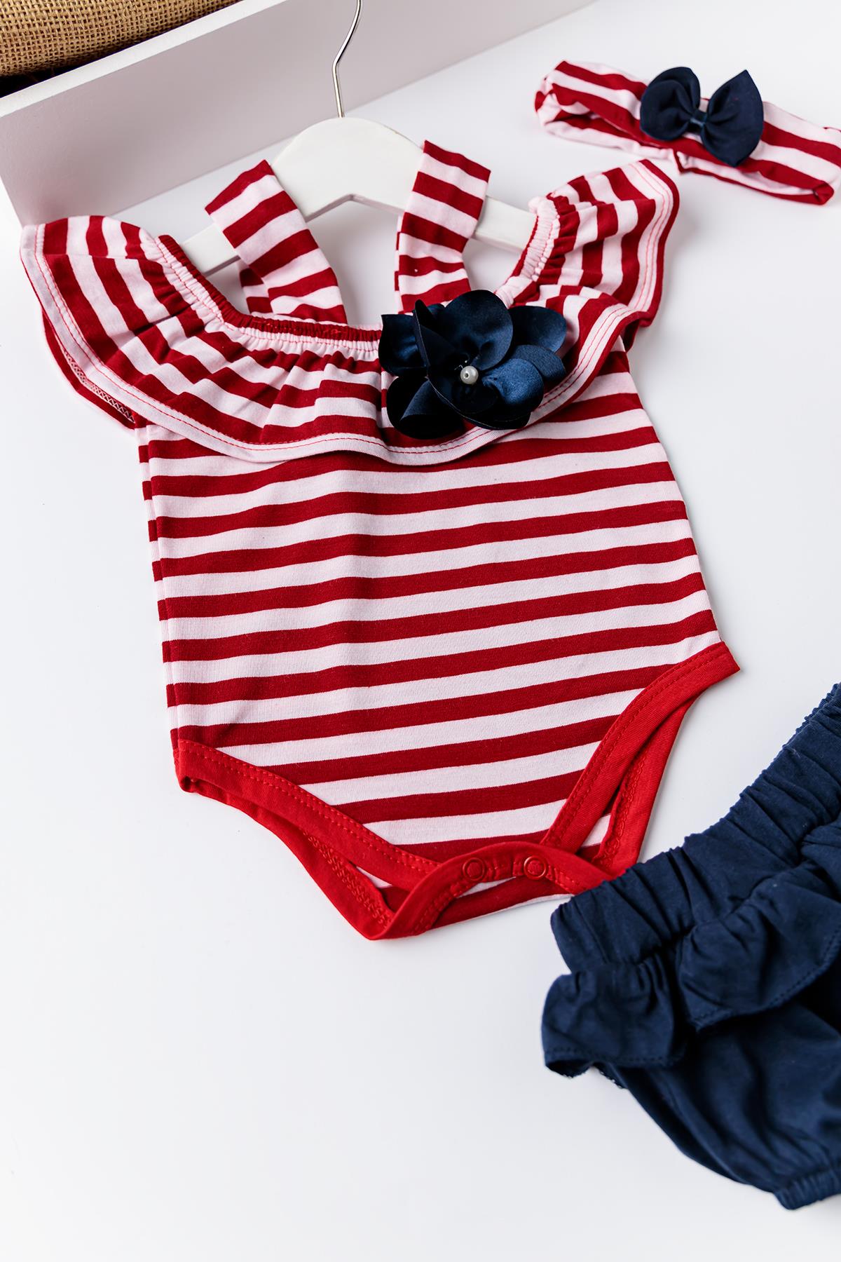 Babymod Kız Bebek Kırmızı Çizgili Bandanalı TulumluTakım
