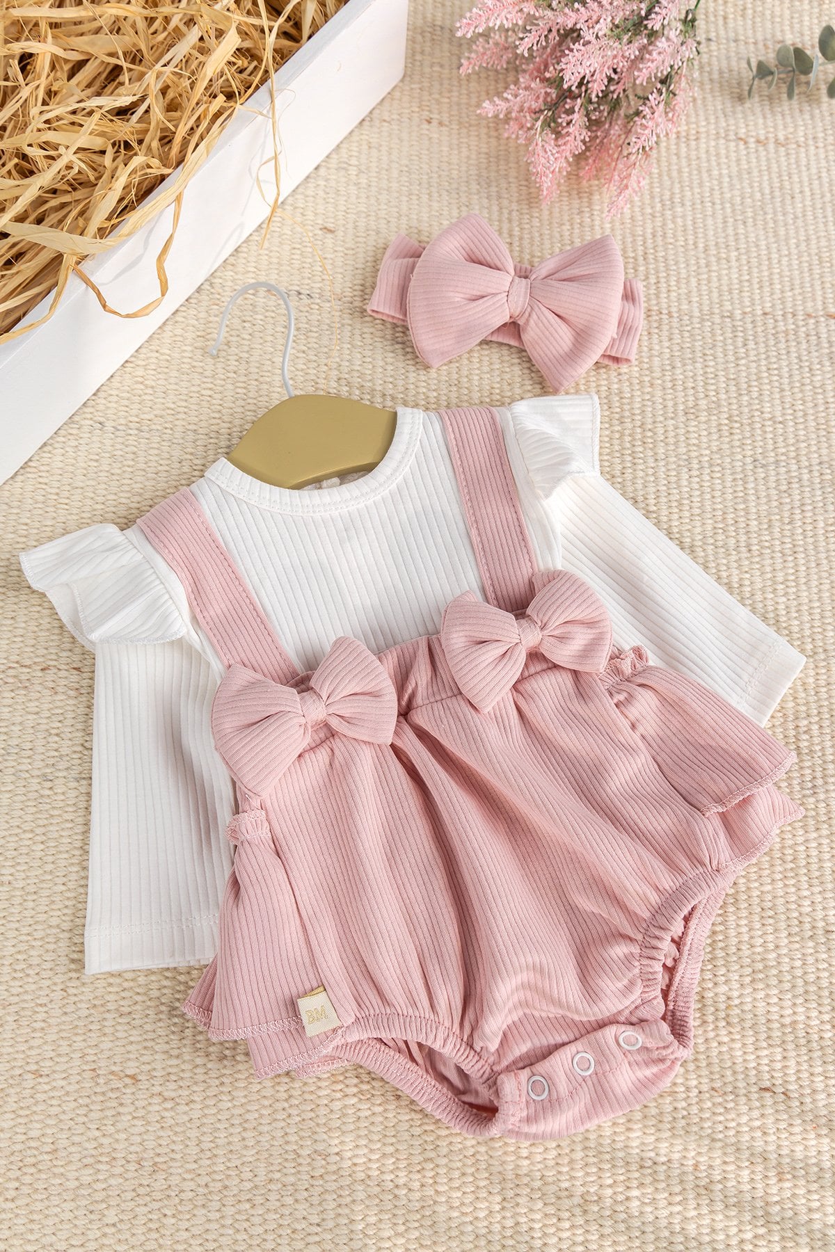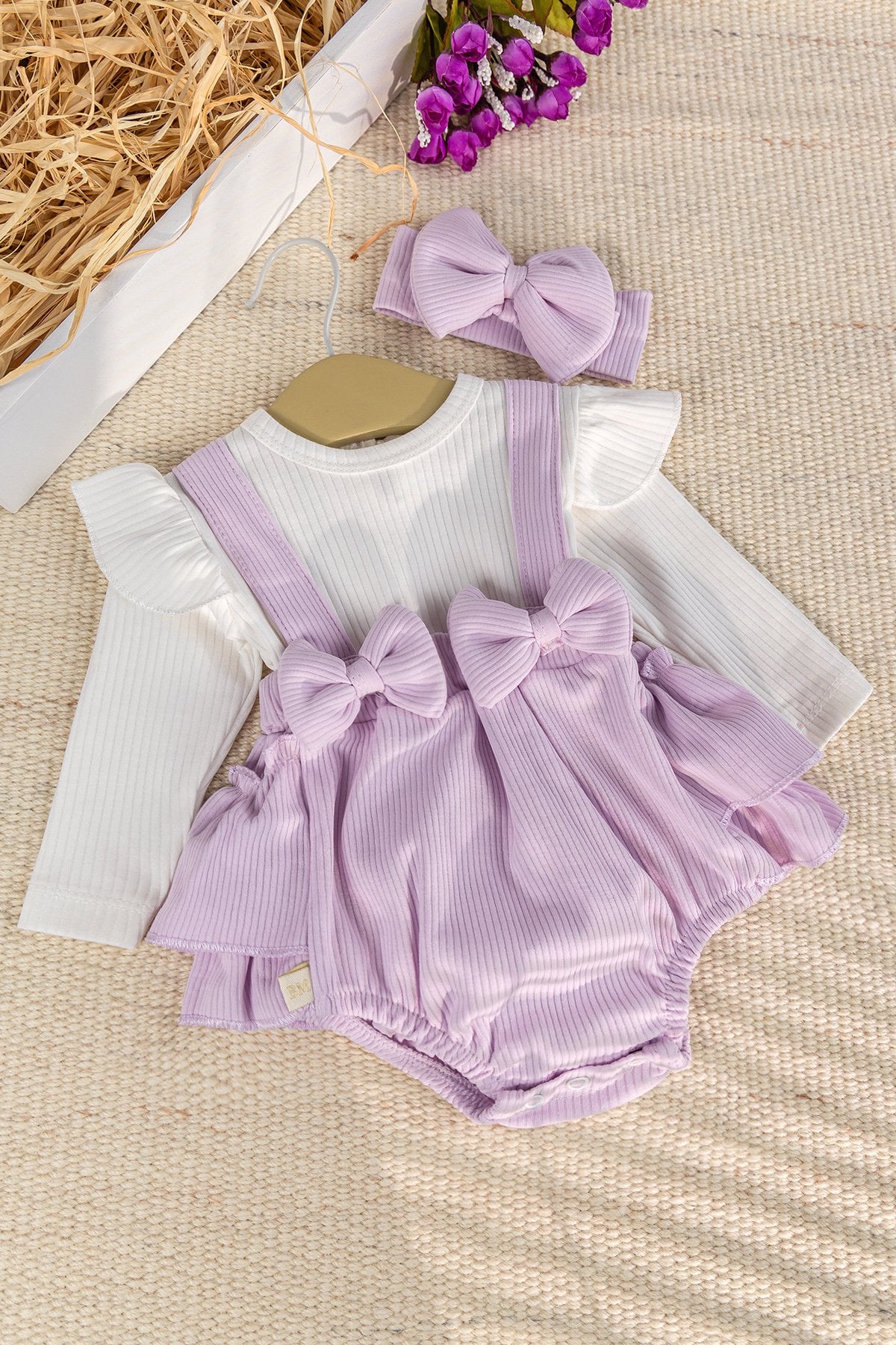 - Bebek tulumun önün de fiyonk süsleme vardır
