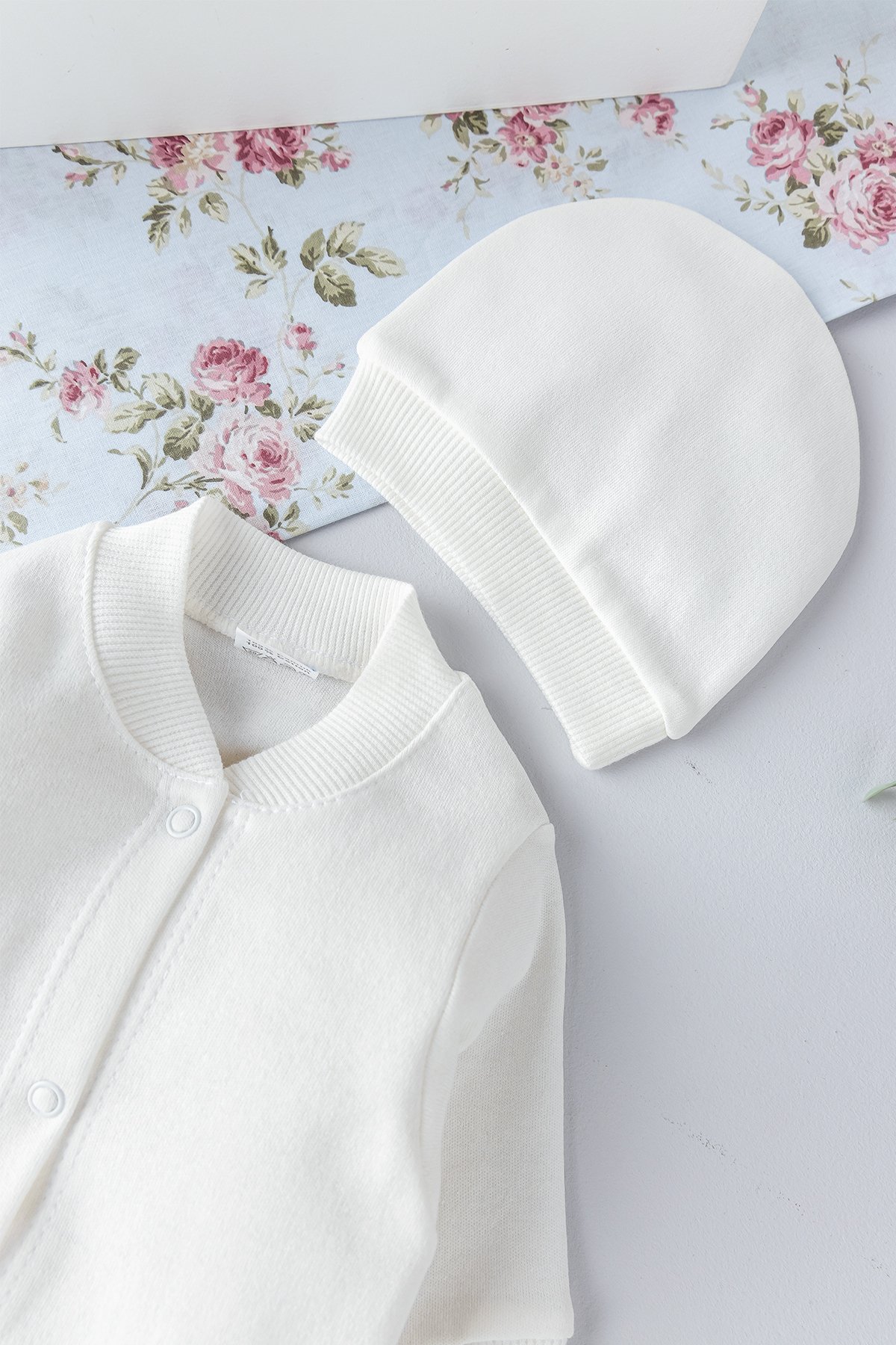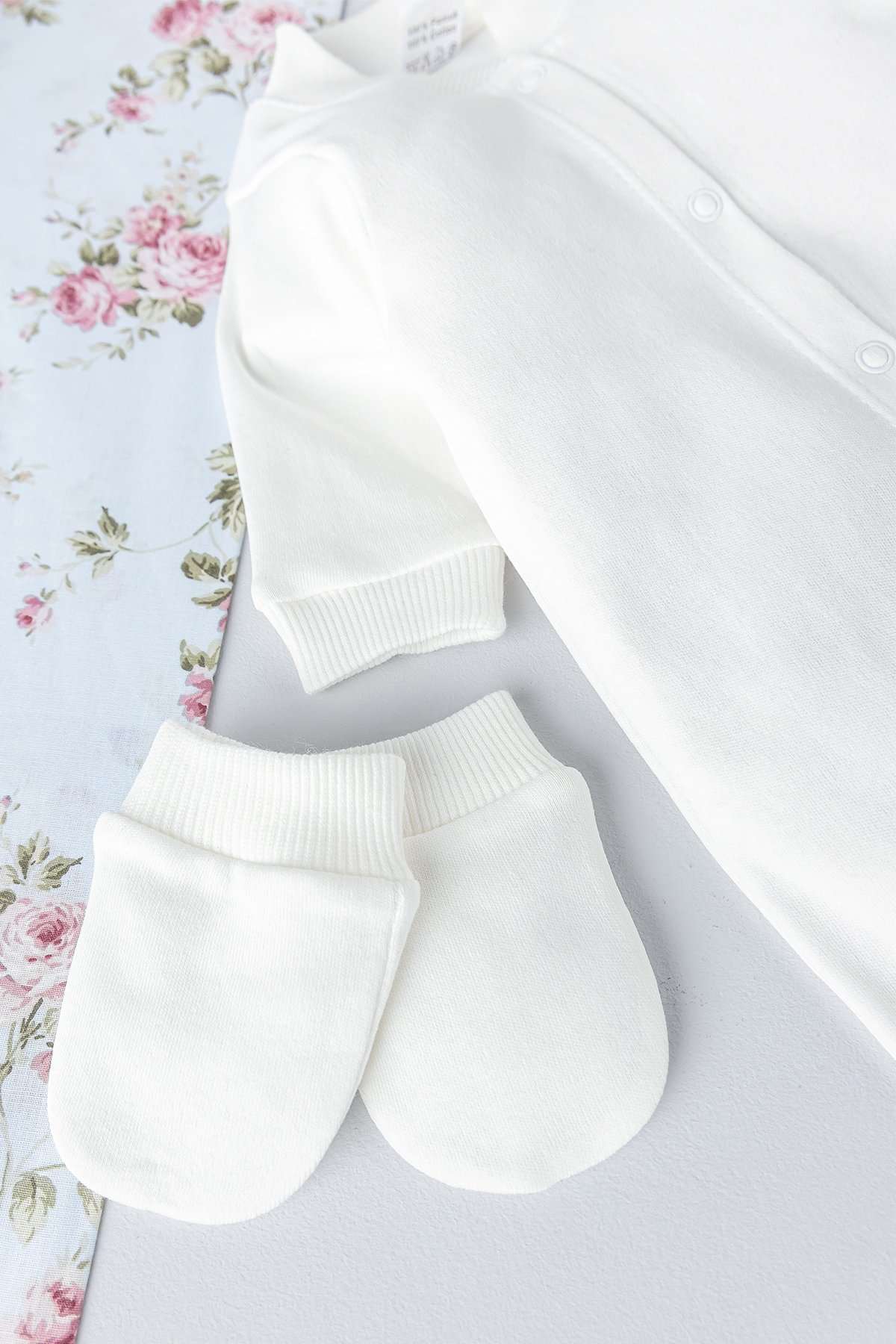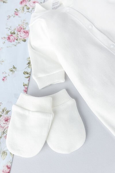 - Bebek eldiveni, Bebek şapkası ve penye tulumdan oluşan bebek tulum seti