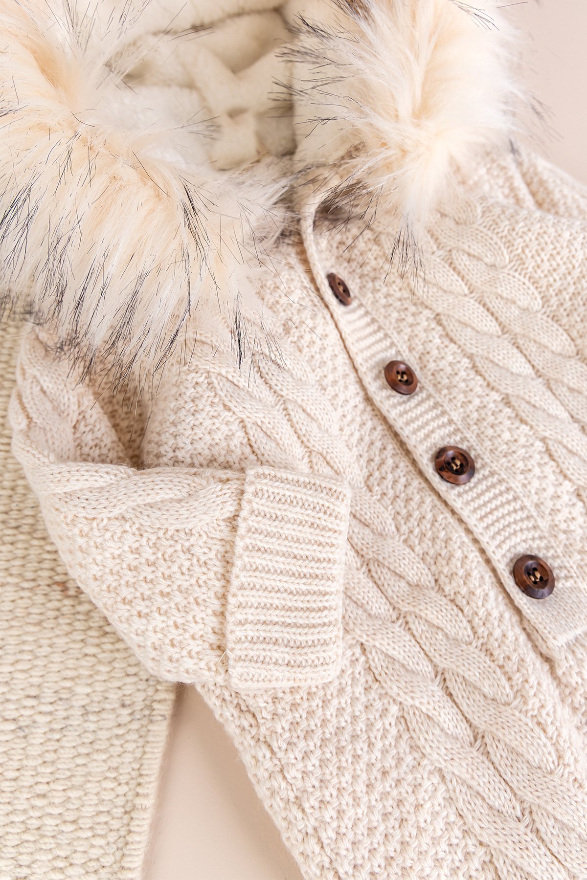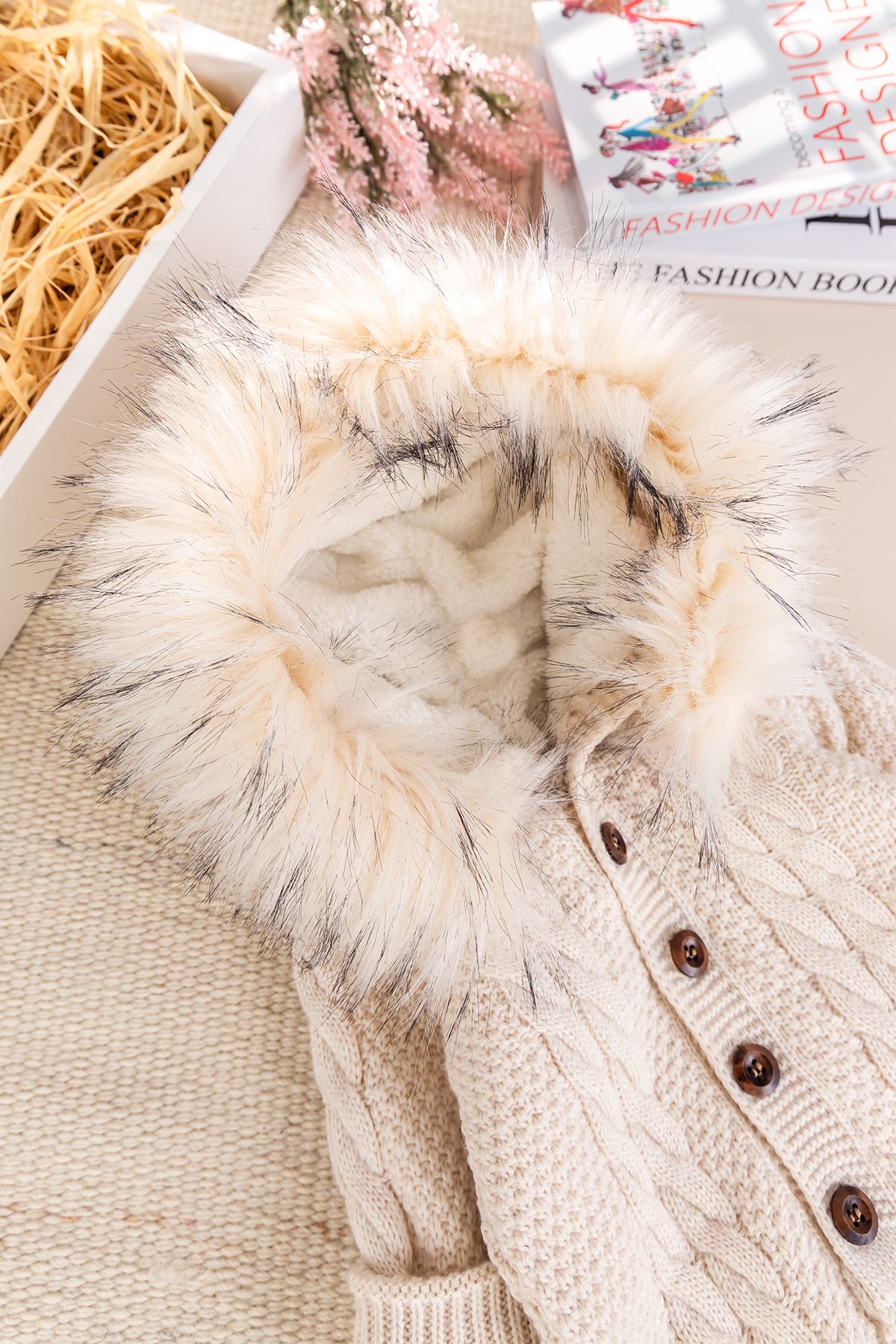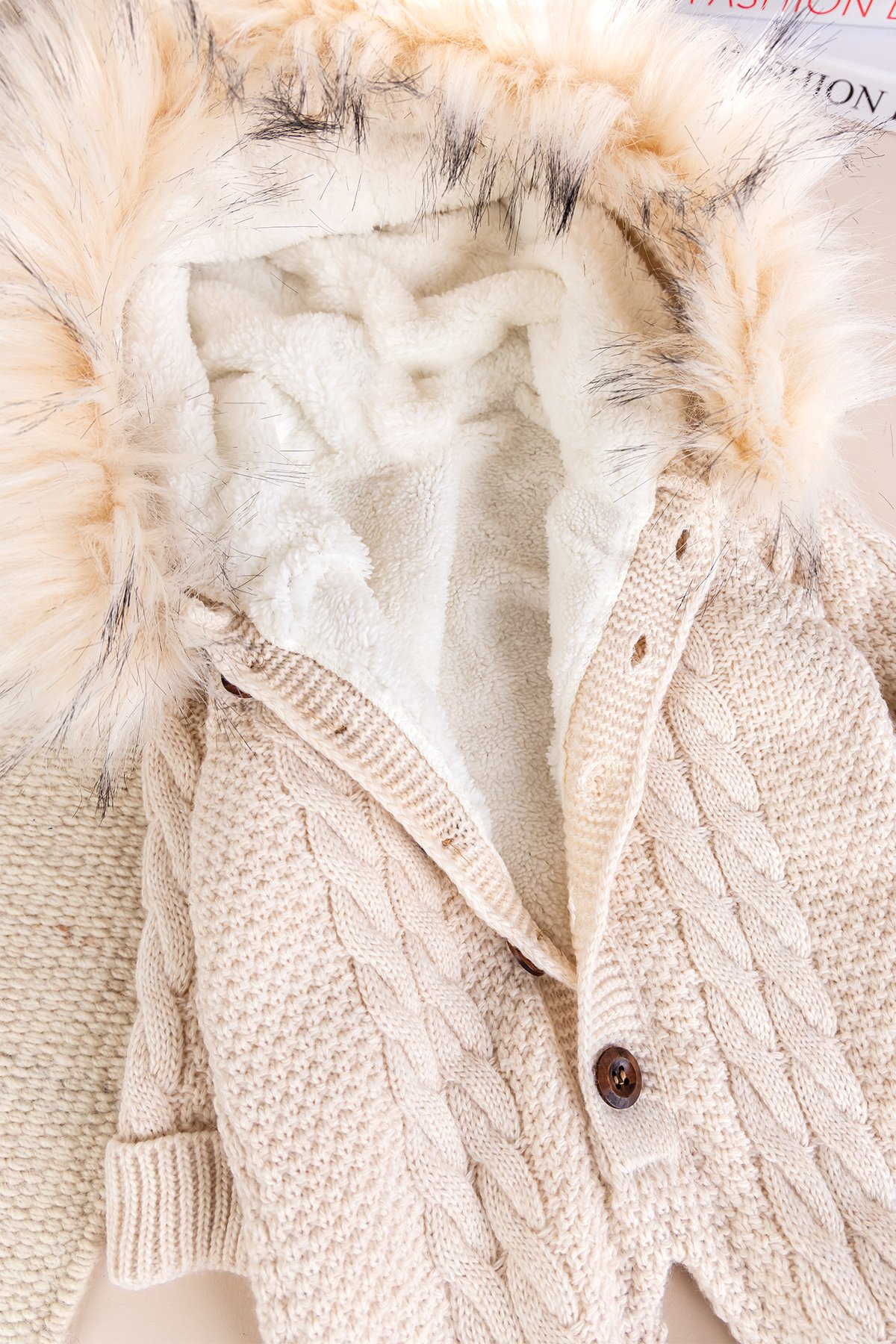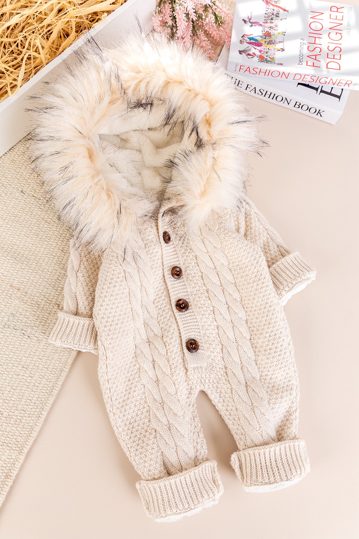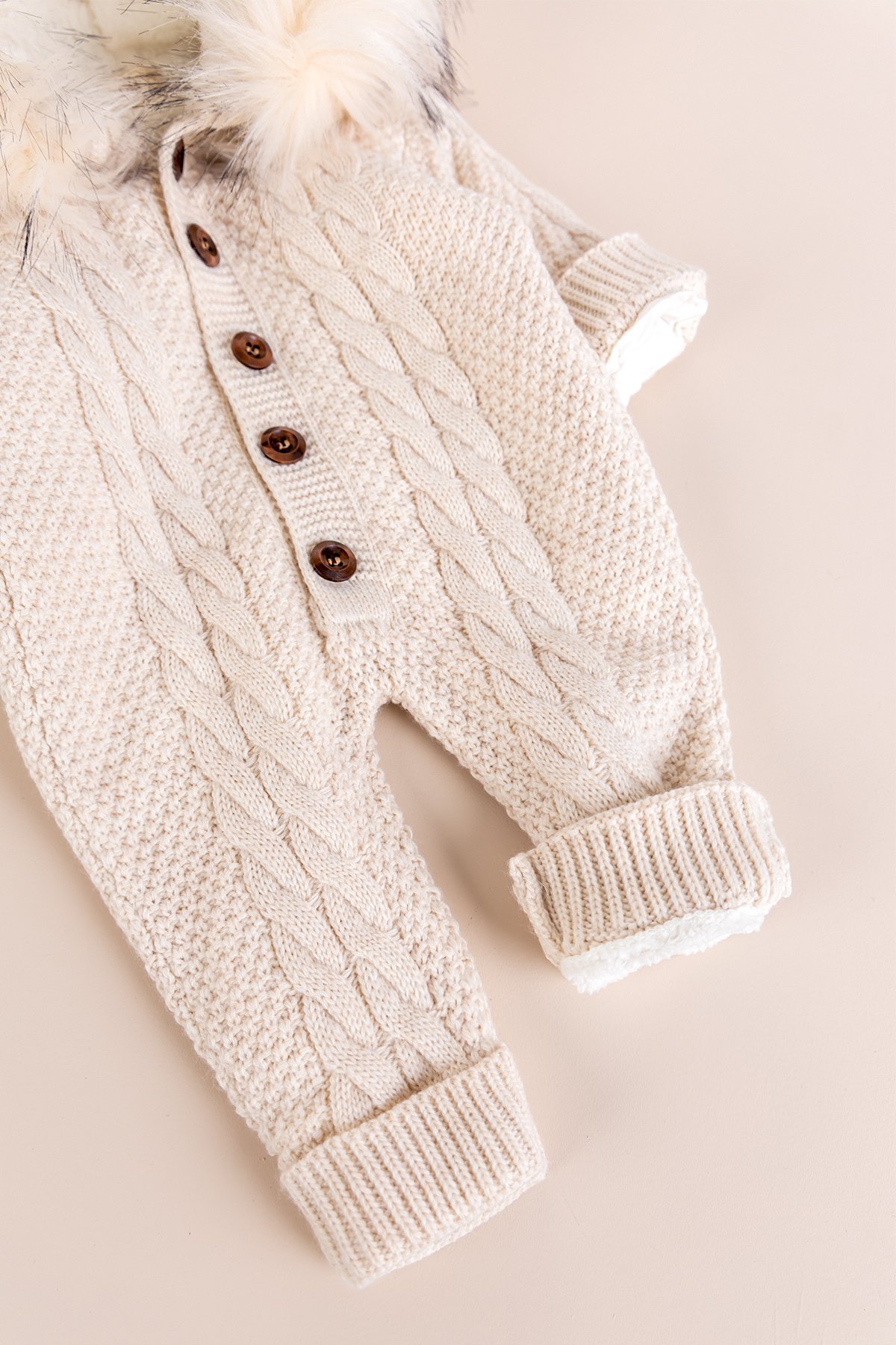 Triko Örgü Kışlık İçi Welsoft Astarlı Kapüşonlu Kız/Erkek Bebek Tulum BEJ - 3-6 AY