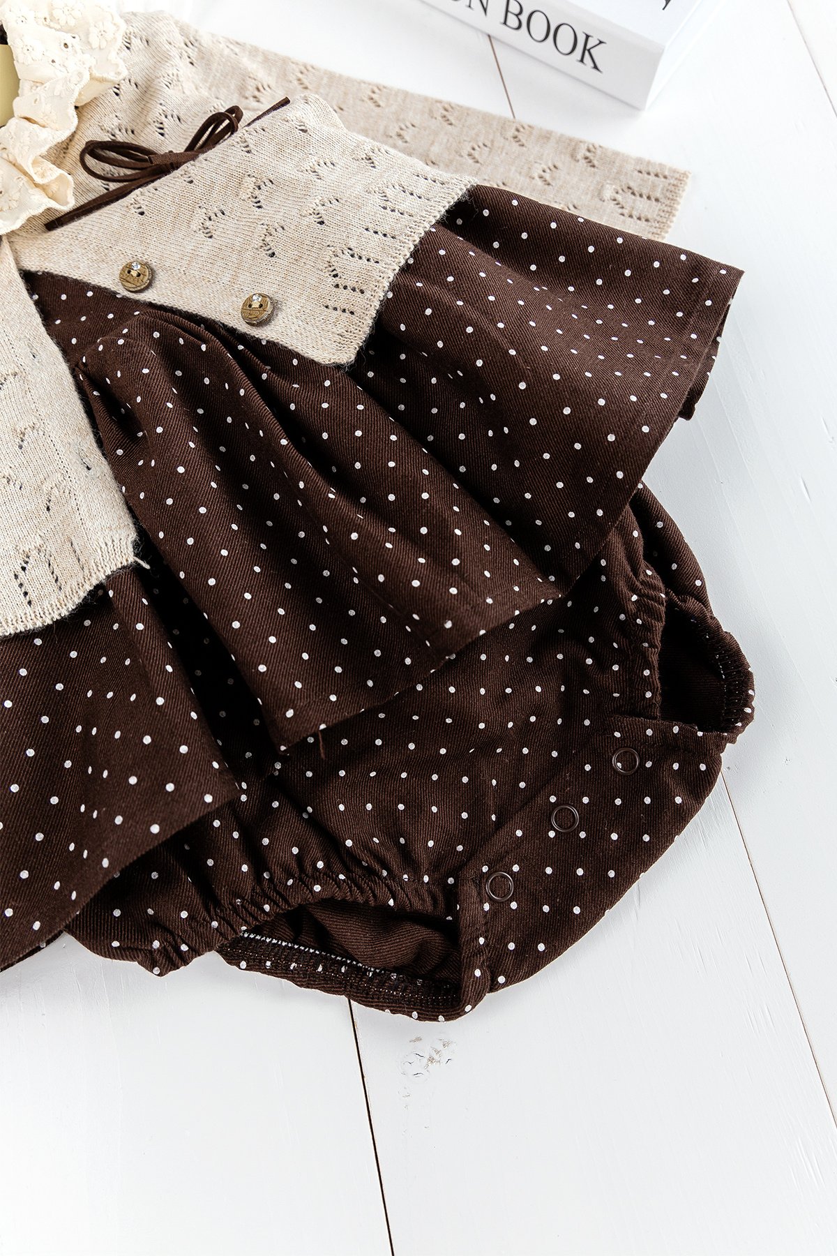 - The crotch of the baby romper has a snap fastener.