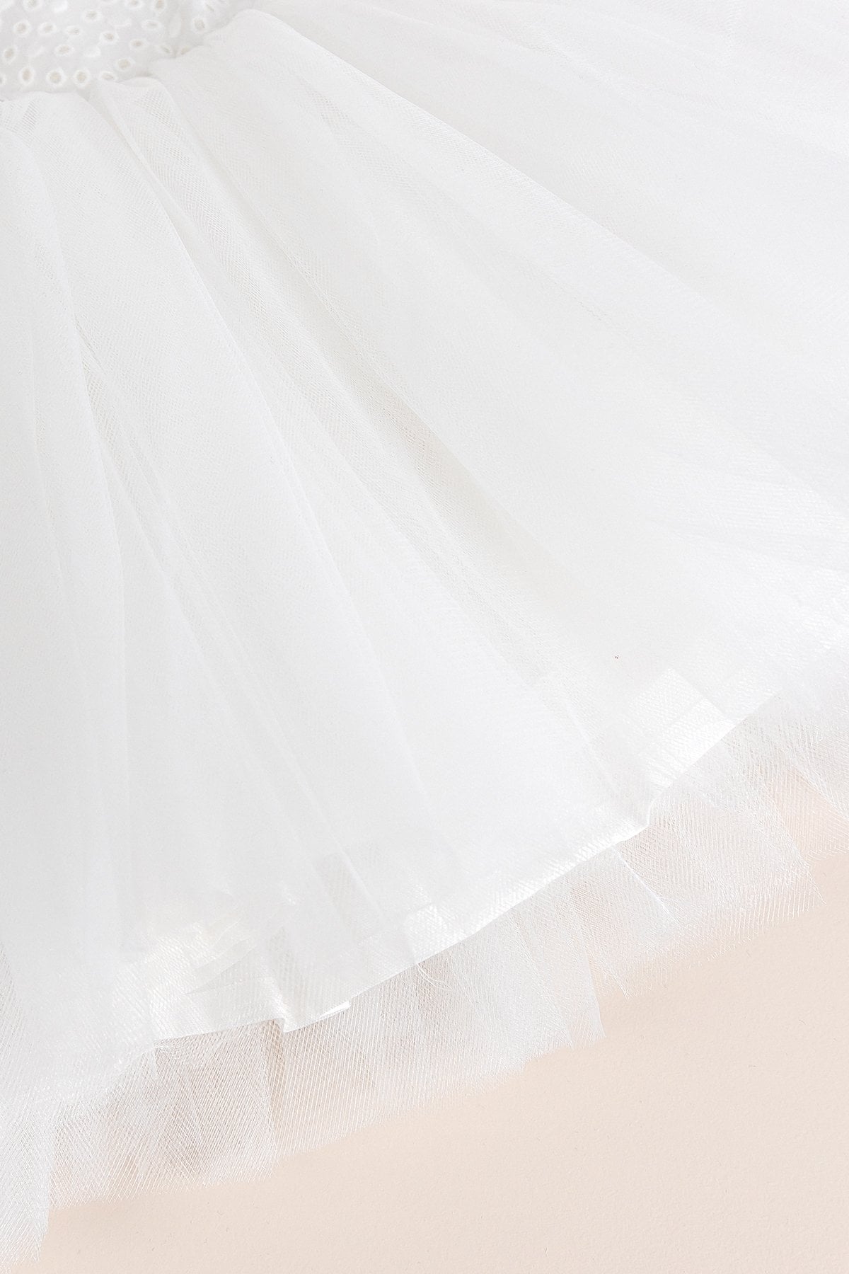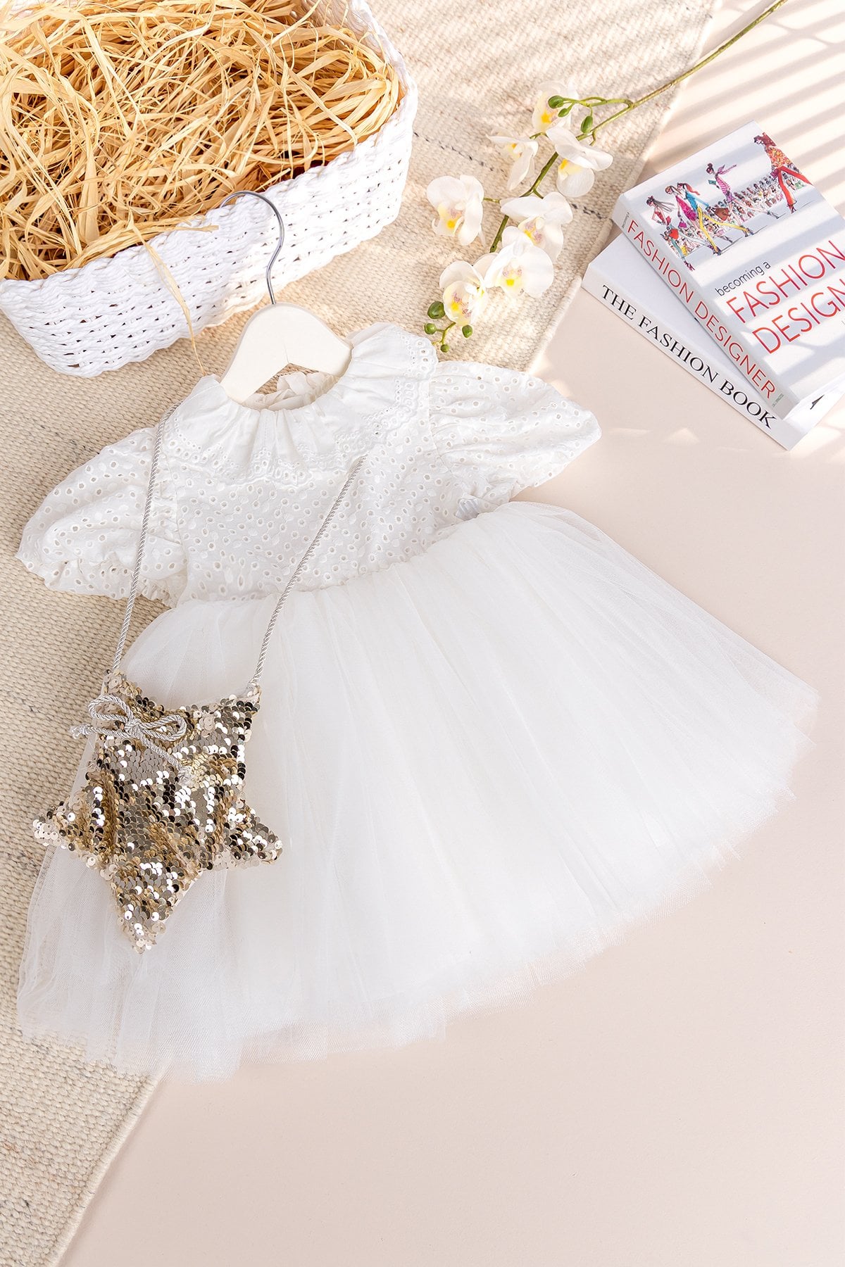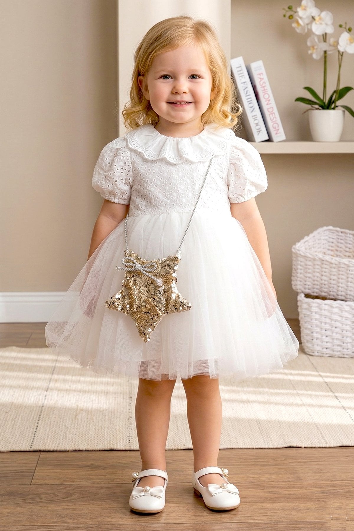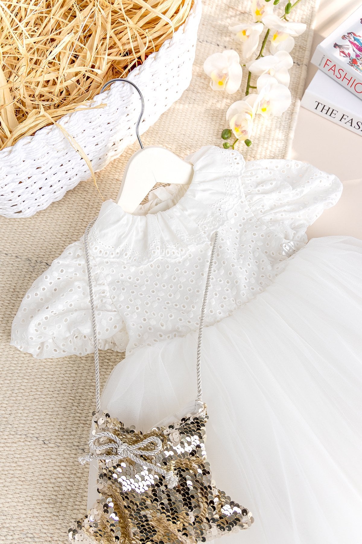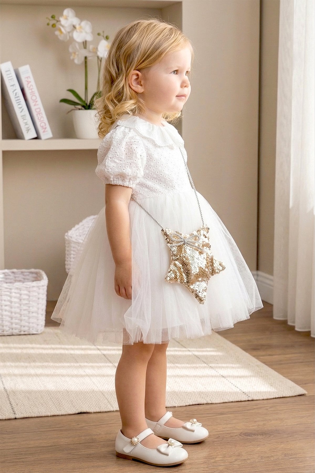 Elbisenin yaka kısmında yer alan vintage esintili fisto detaylar, tasarıma romantik, rustik ve modern bir hava katıyor. Payetli kumaşından üretilen sevimli uyumlu mini çantası ile miniklerin tarzını bir bütün olarak tamamlarken, hem özel günlerde hem de günlük kullanımda zahmetsiz bir şıklık oluşturuyor. Ekru rengin sunduğu minimalist ve aydınlık görünüm, bu elbiseyi her an fotoğraflanmaya hazır, vazgeçilmez bir parça kılıyor.