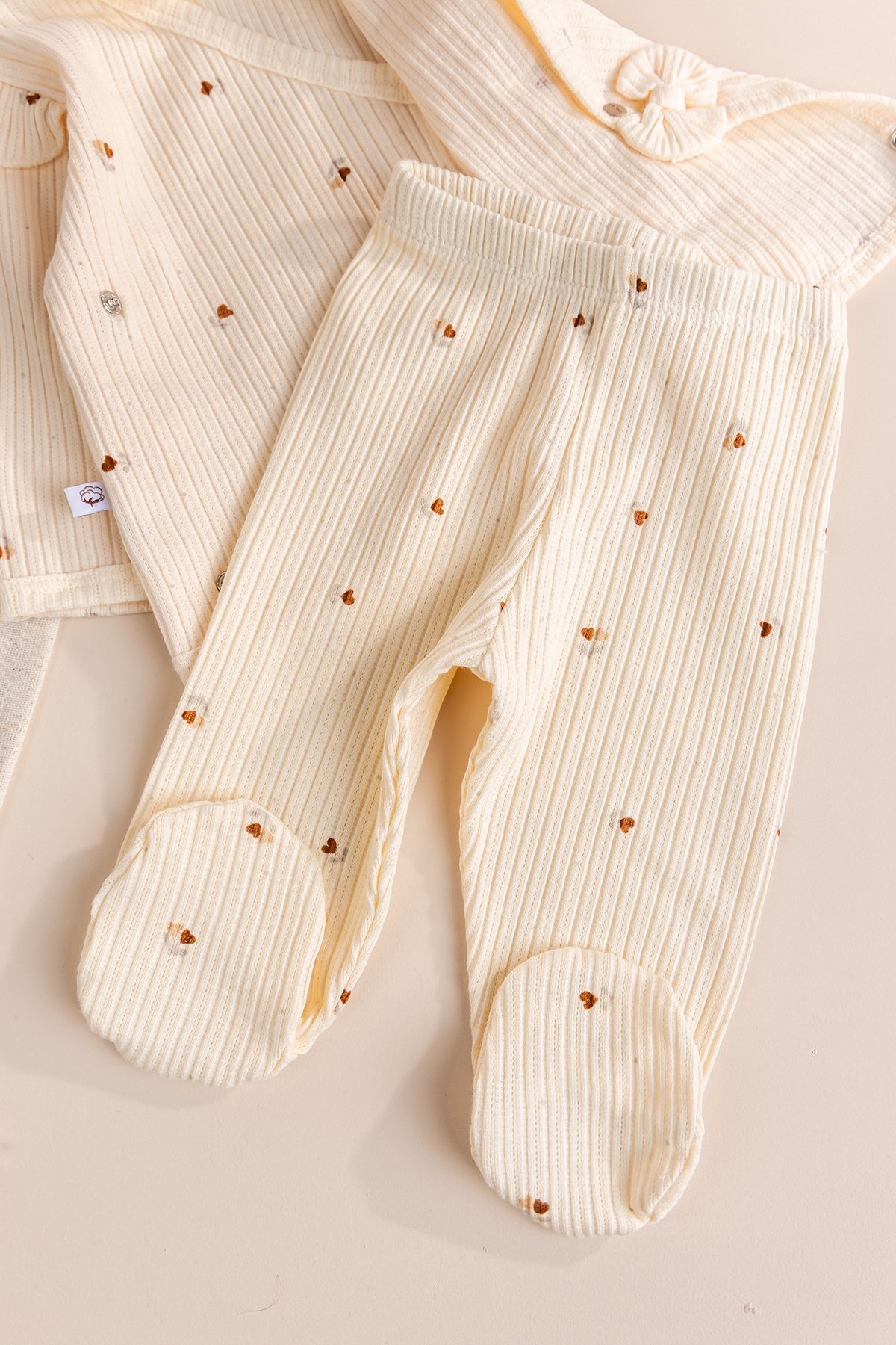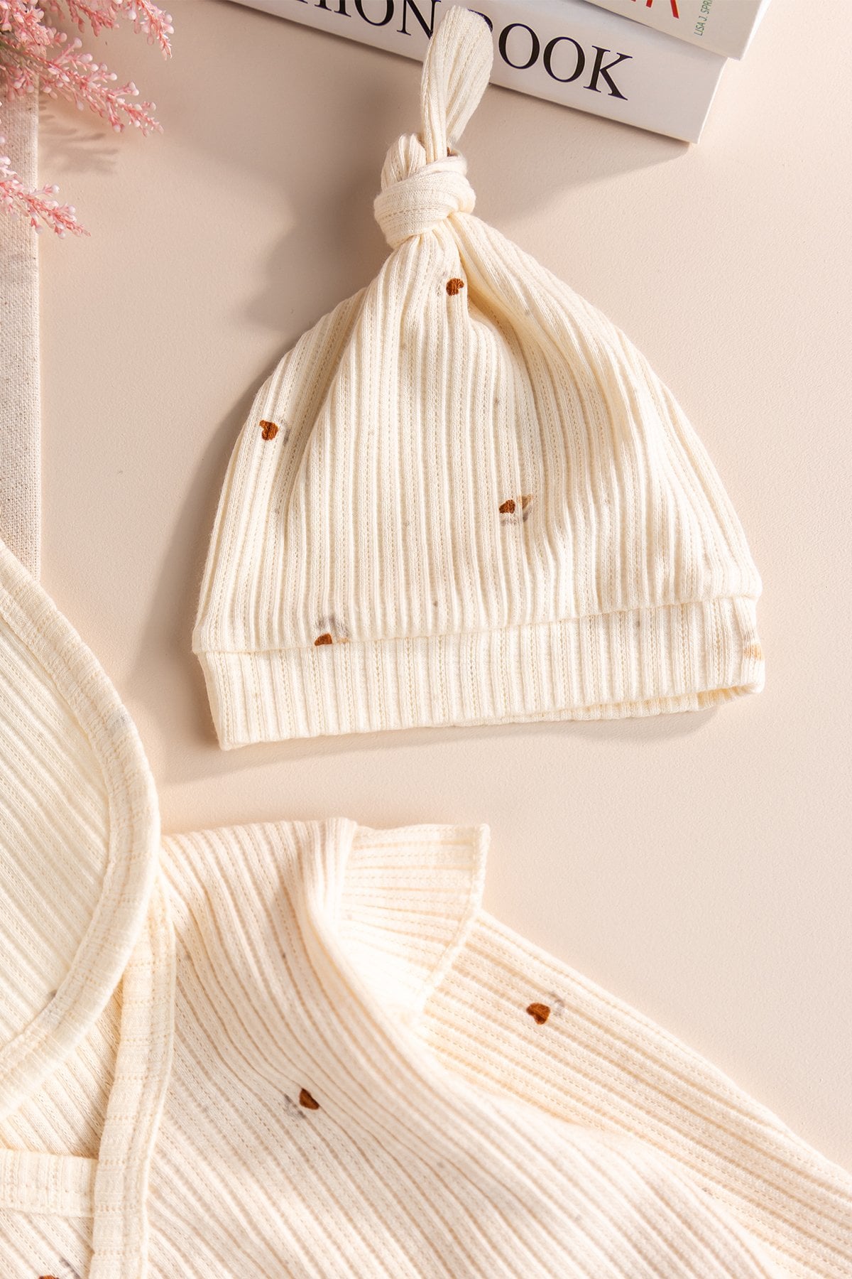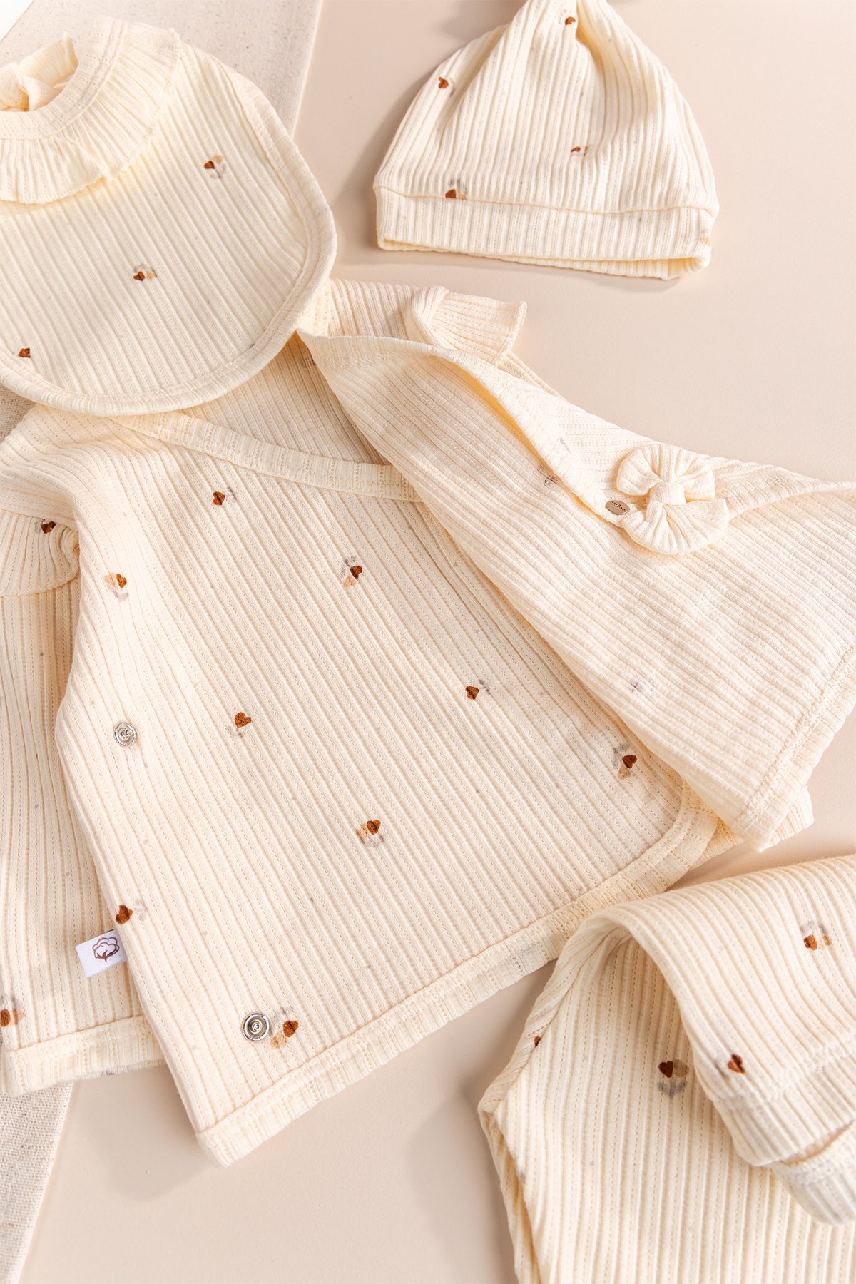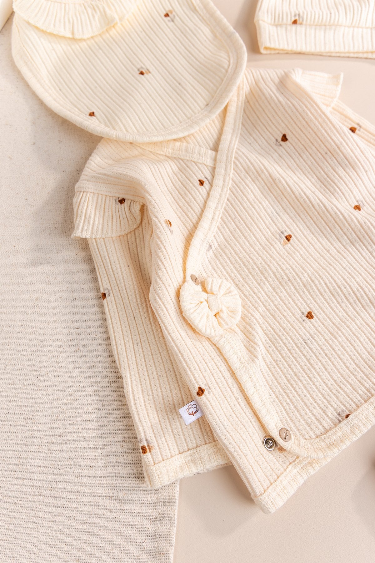 Yenidoğan fotoğraf çekimlerinde harika görünecek bu set, aynı zamanda %100 pamuklu doğal dokusuyla annelerin güvenle tercih edeceği bir üründür.
