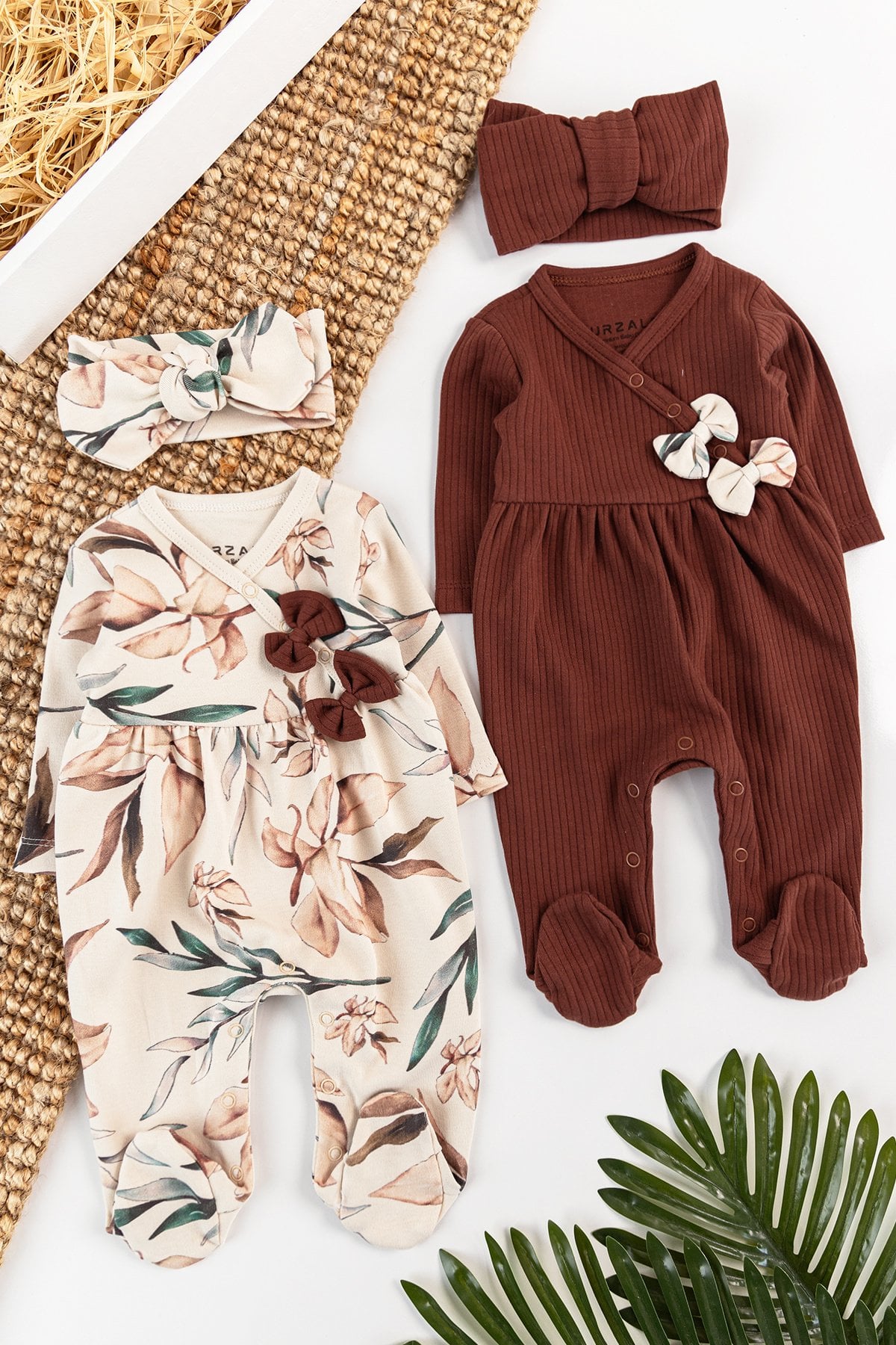 Çiçek Desenli Bandanalı 2'li Uzun Kollu Kız Bebek Tulum Takım