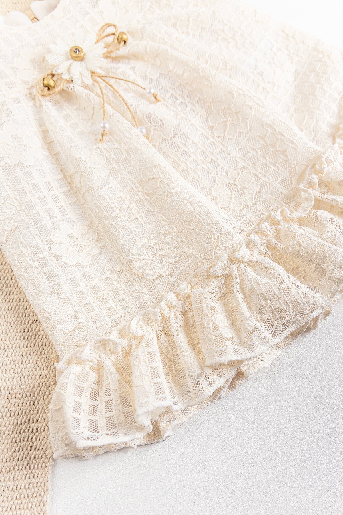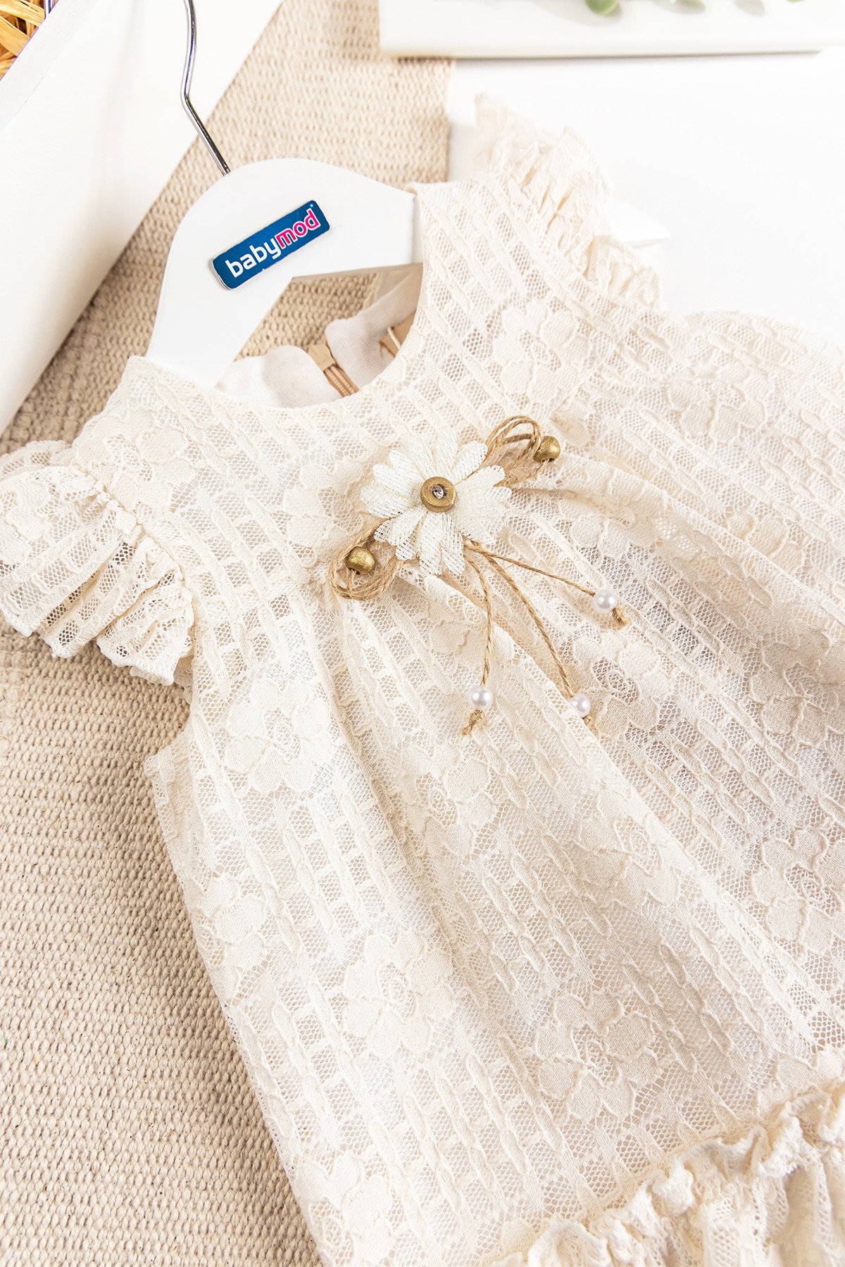 - Bebek elbise kendinden çiçek desenli güpür kumaşa sahiptir.