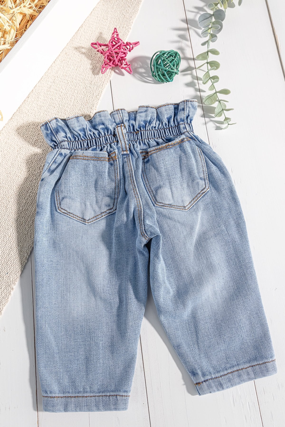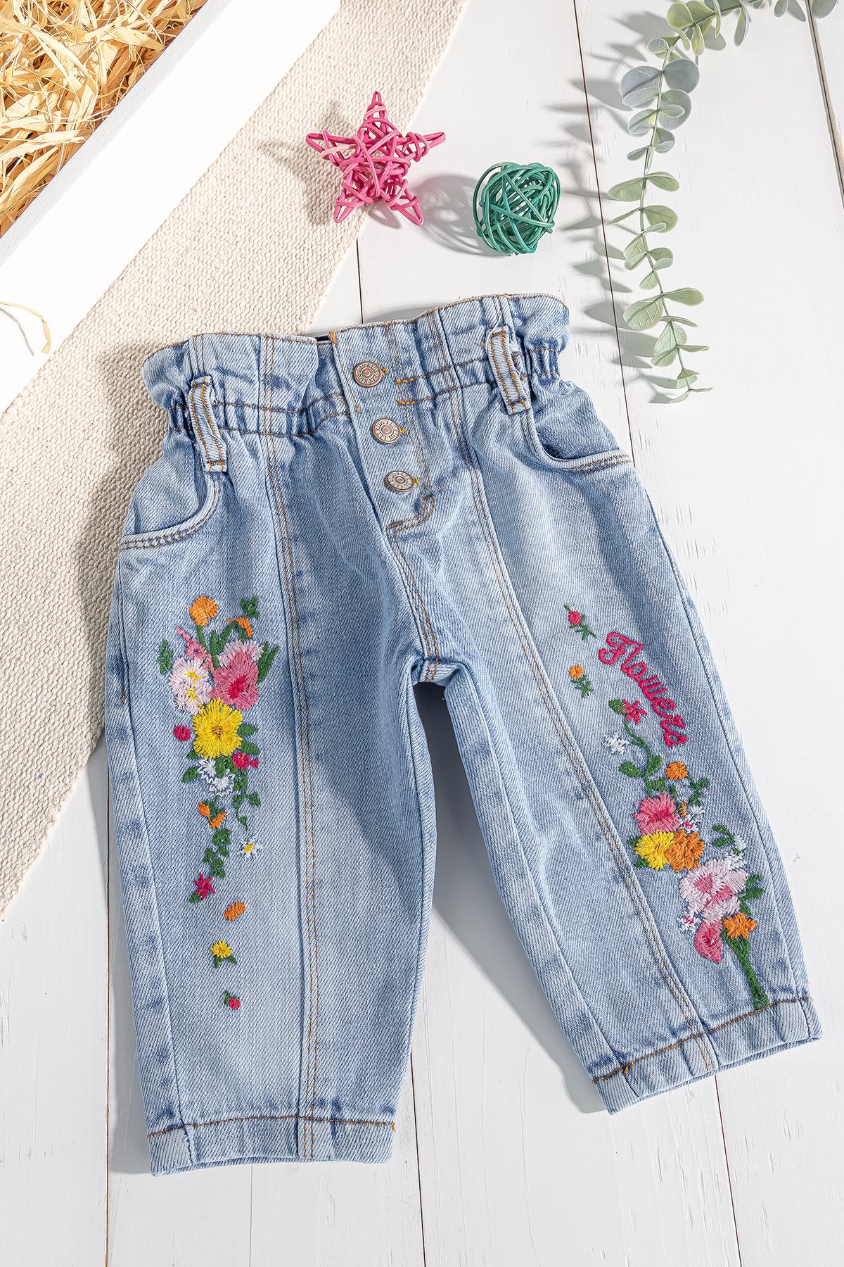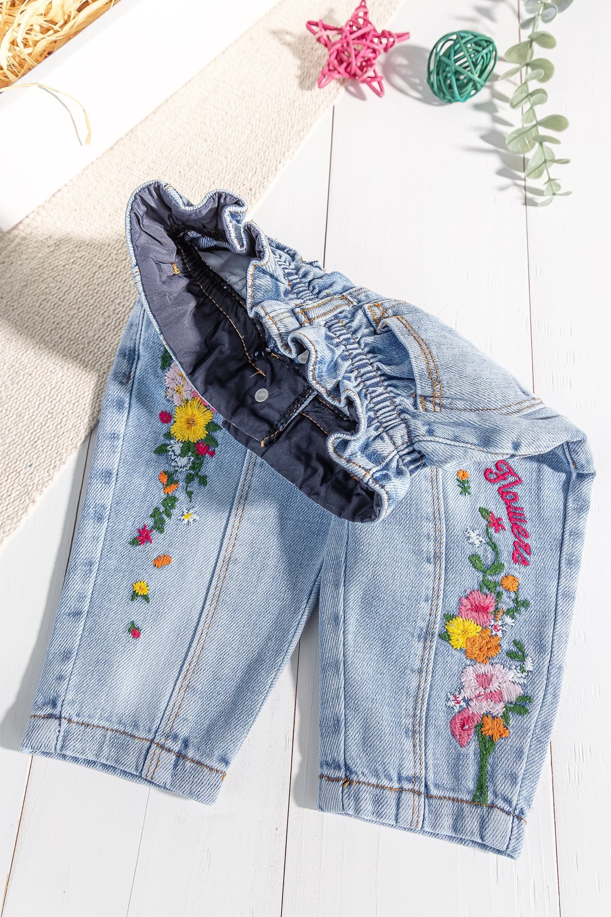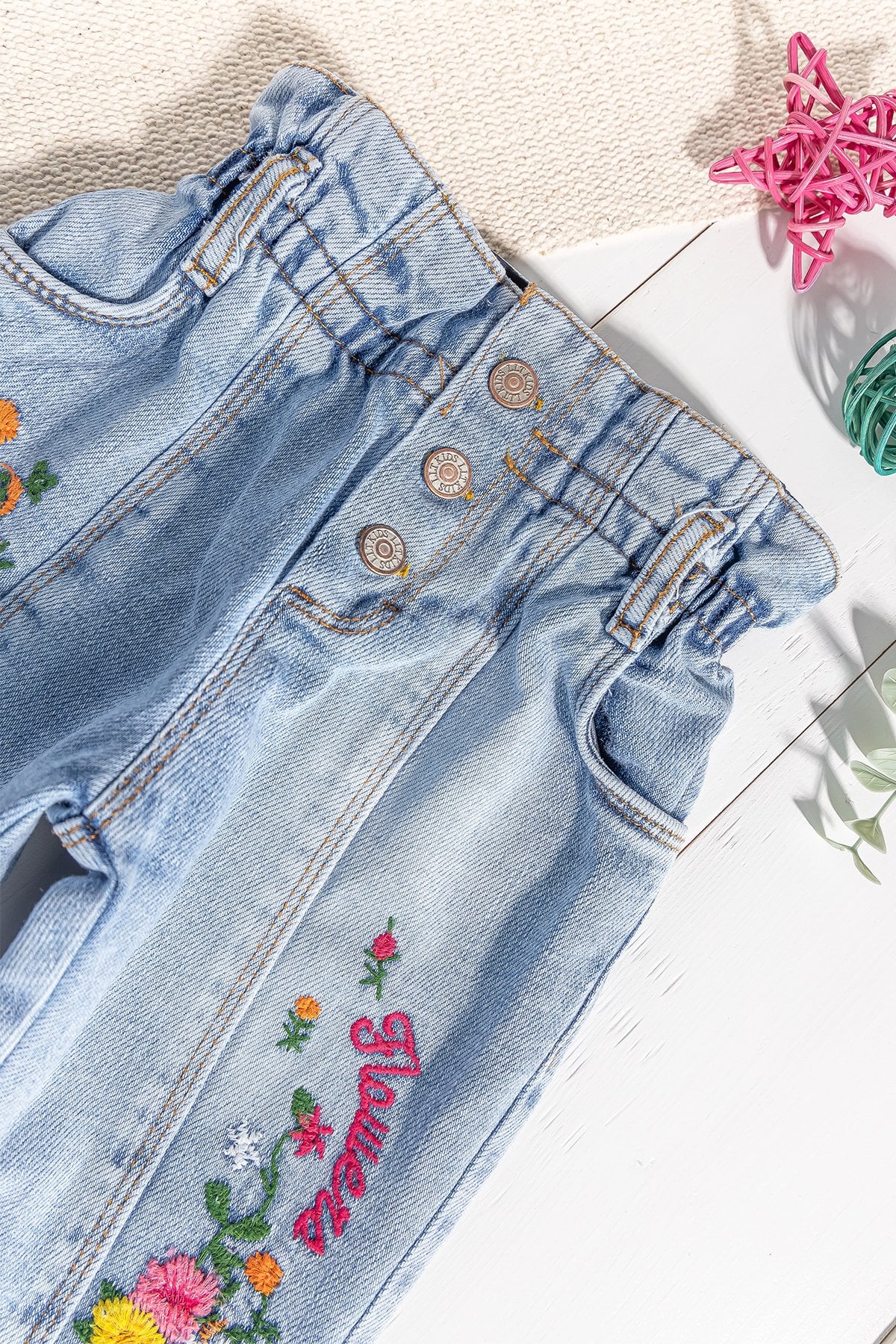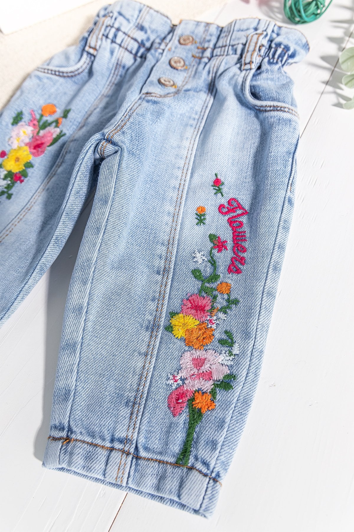 Çiçek İşlemeli Beli Lastikli Kız Bebek Kot Pantolon