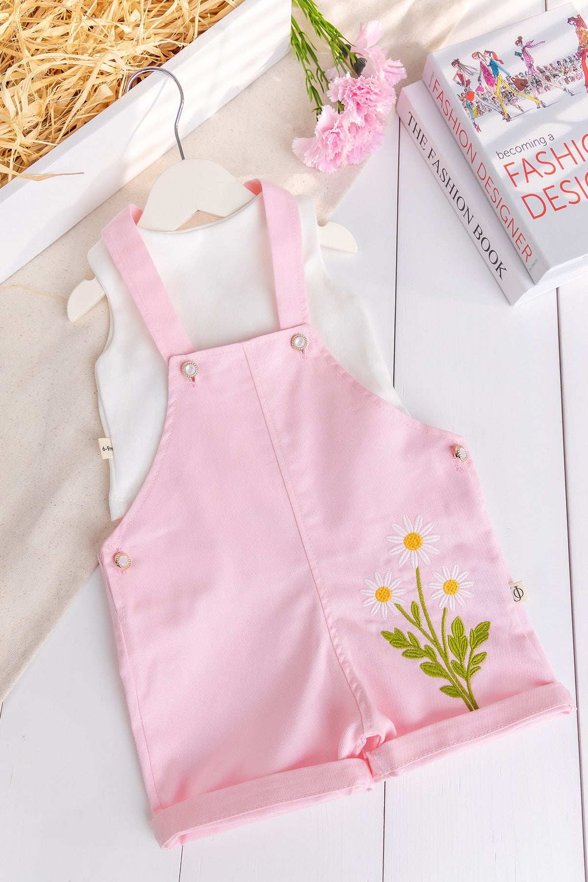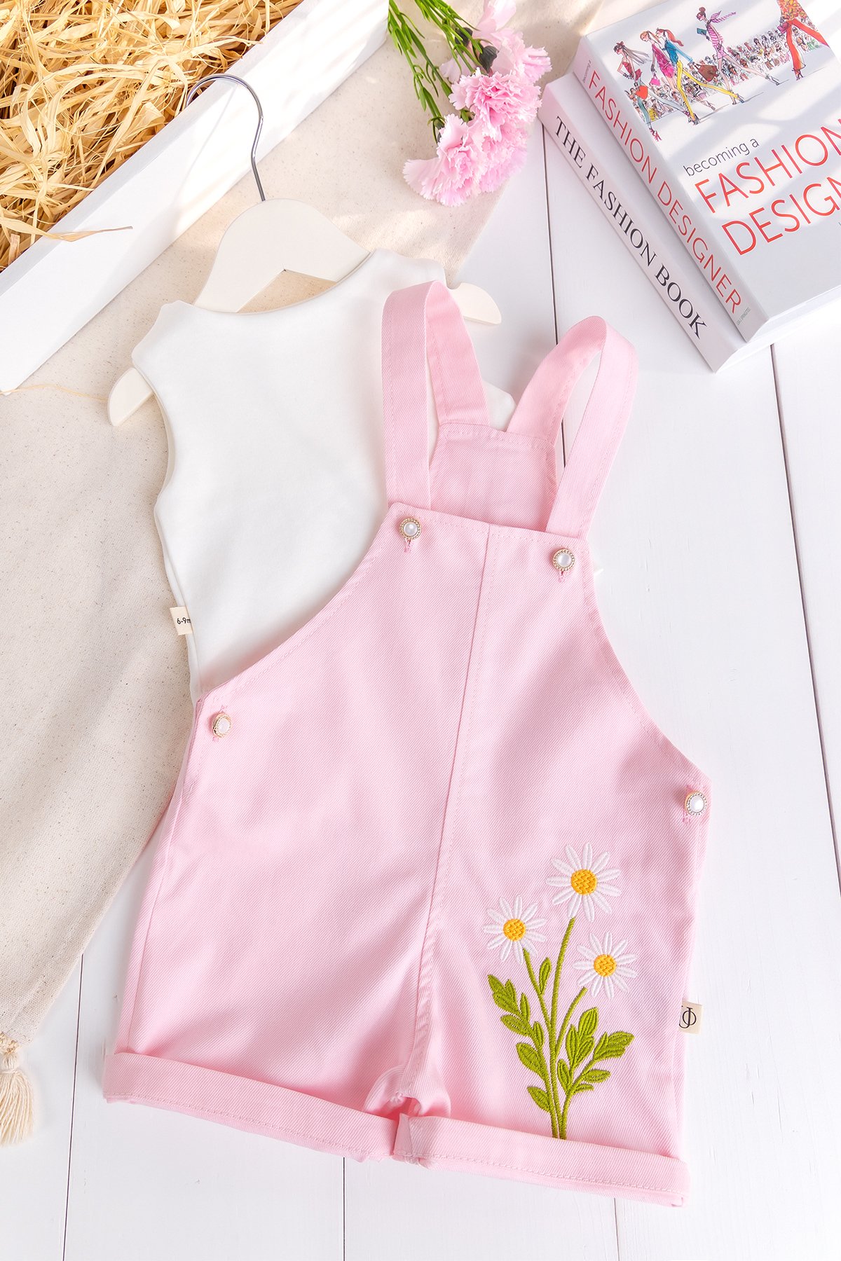 - Bebek salopetin önü çiçek işlemelidir
