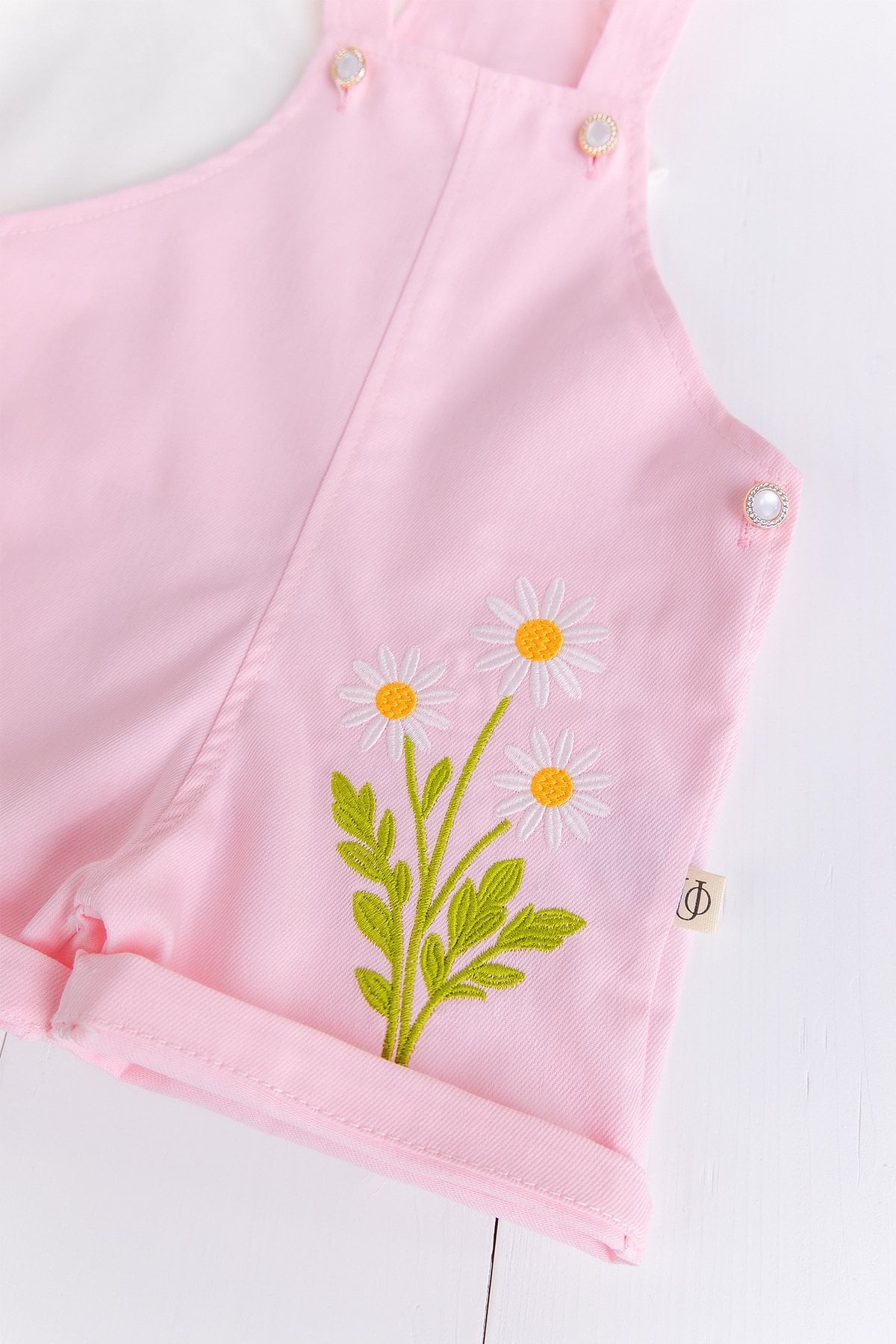 - Salopetin paça kısmına özenle işlenmiş çiçek nakış detayları, tasarıma sevimli, el işçiliği hissiyatı veren şık bir hava katar.