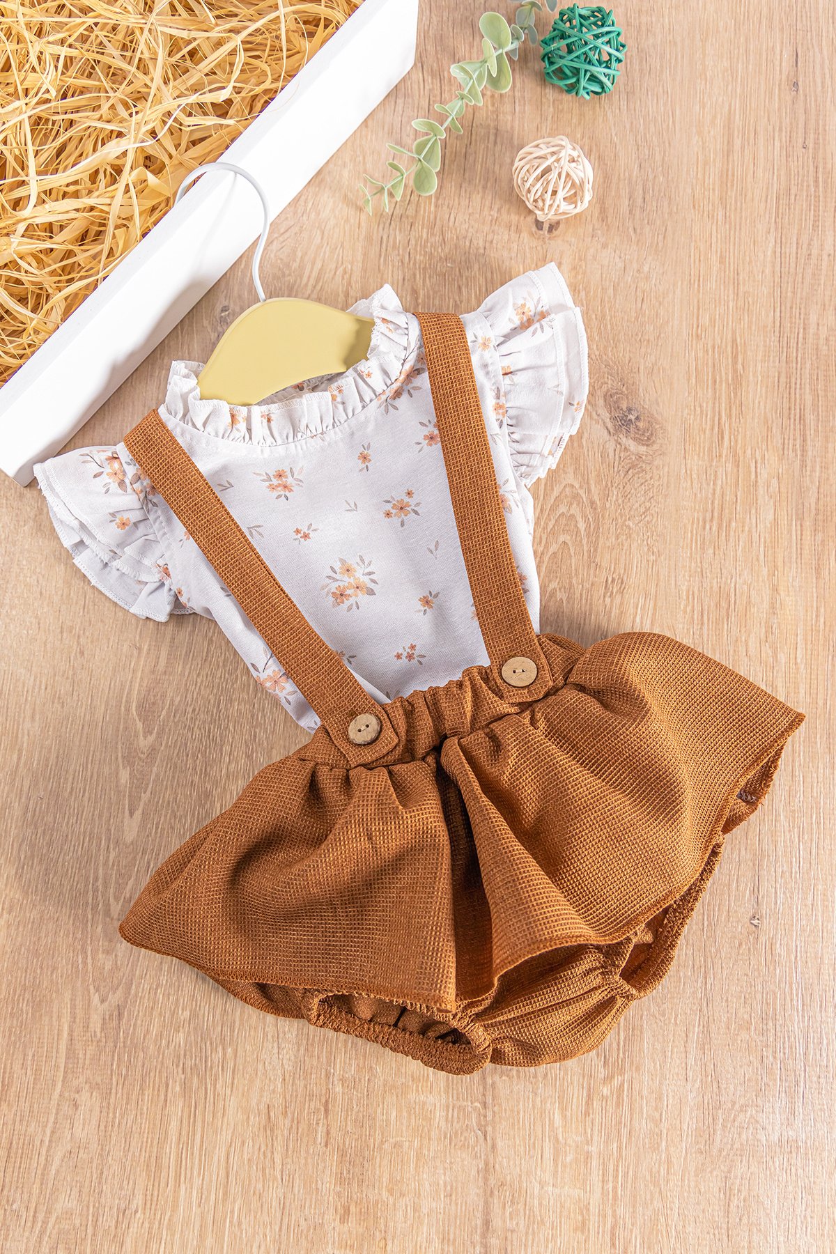 Çiçekli Gömlekli Yazlık Kız Bebek Salopet Elbise Takım KAHVERENGİ - 9-12 AY
