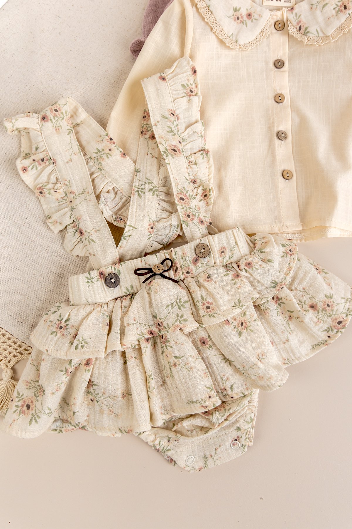 - Kız bebek salopet yumuşak dokulu müslin pamuklu kumaştan üretilmiştir