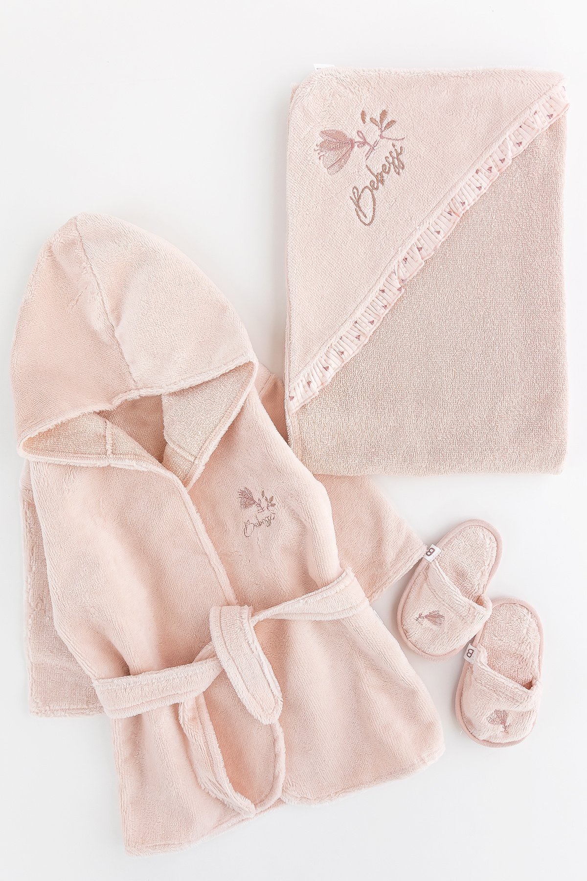 Çiçekli Nakış İşlemeli Fırfırlı 3 Parça Pamuklu Kız Bebek Havlu Bornoz Seti