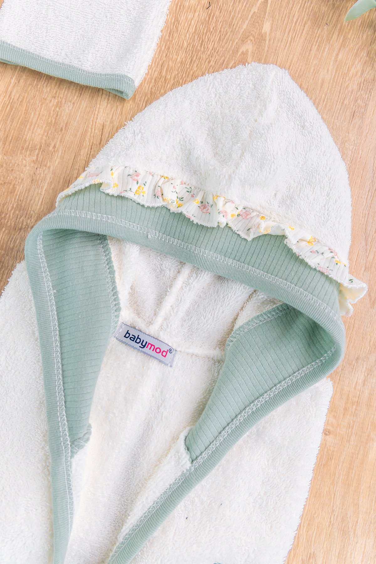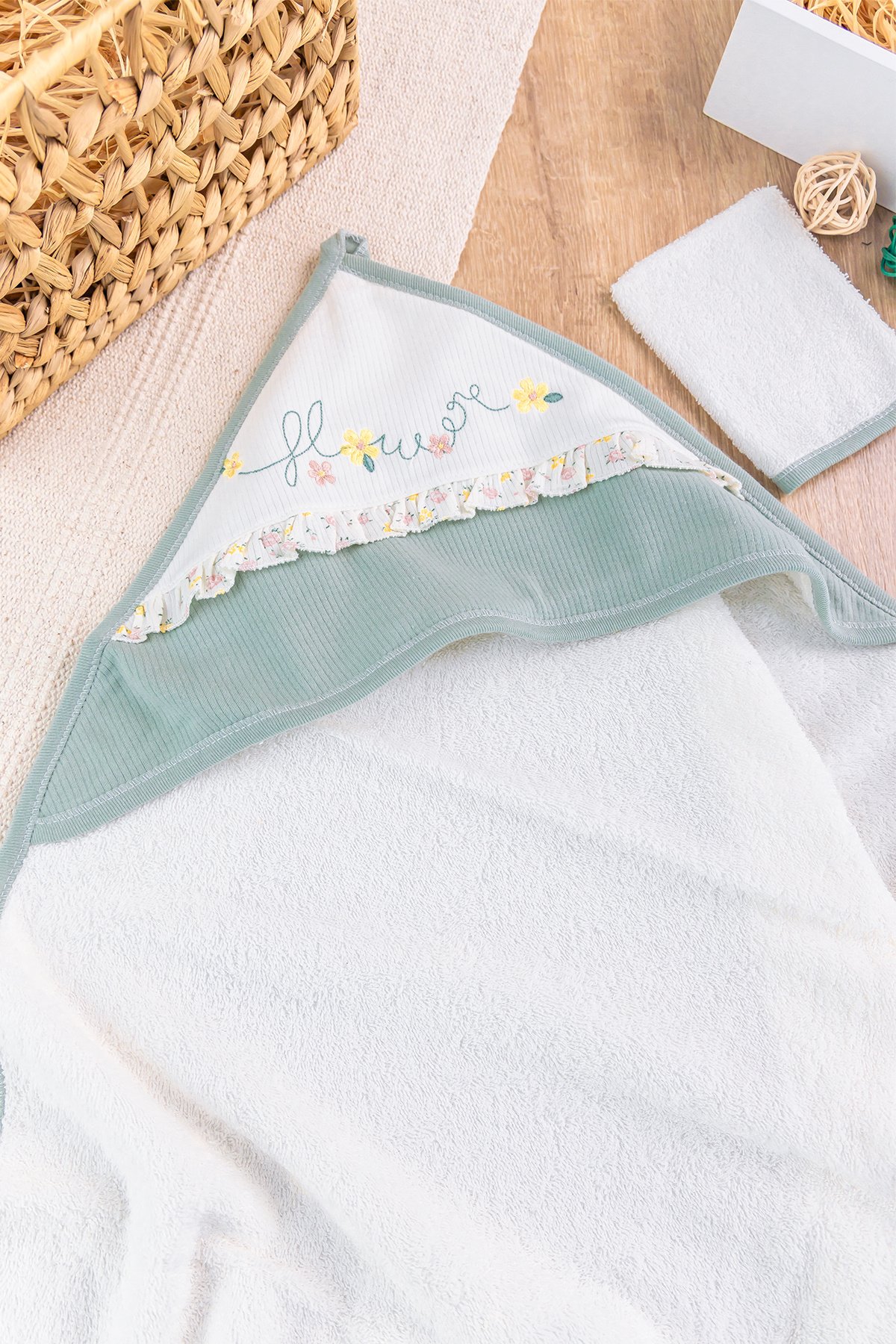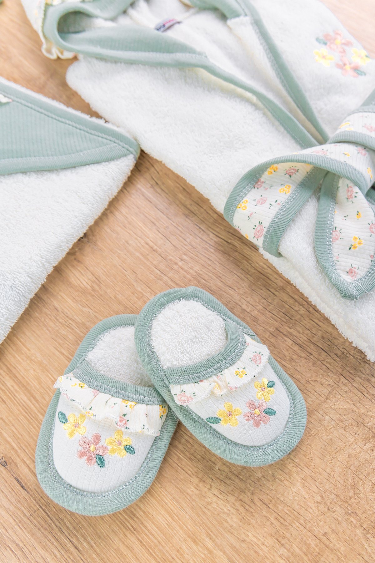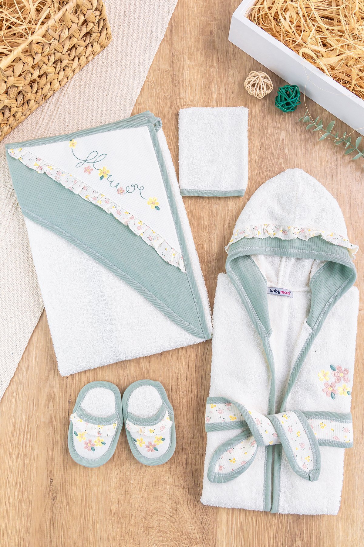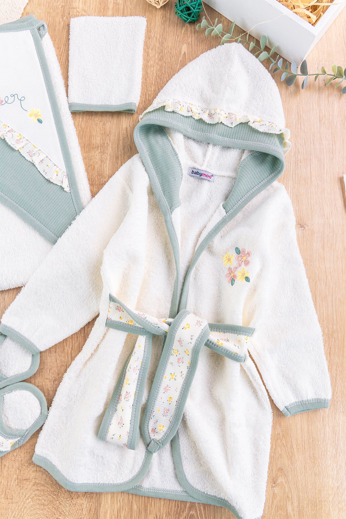 Çiçekli Nakış İşlemeli Fırfırlı 4 Parça Pamuklu Kız Bebek Havlu Bornoz Seti YEŞİL - 0-18 Ay