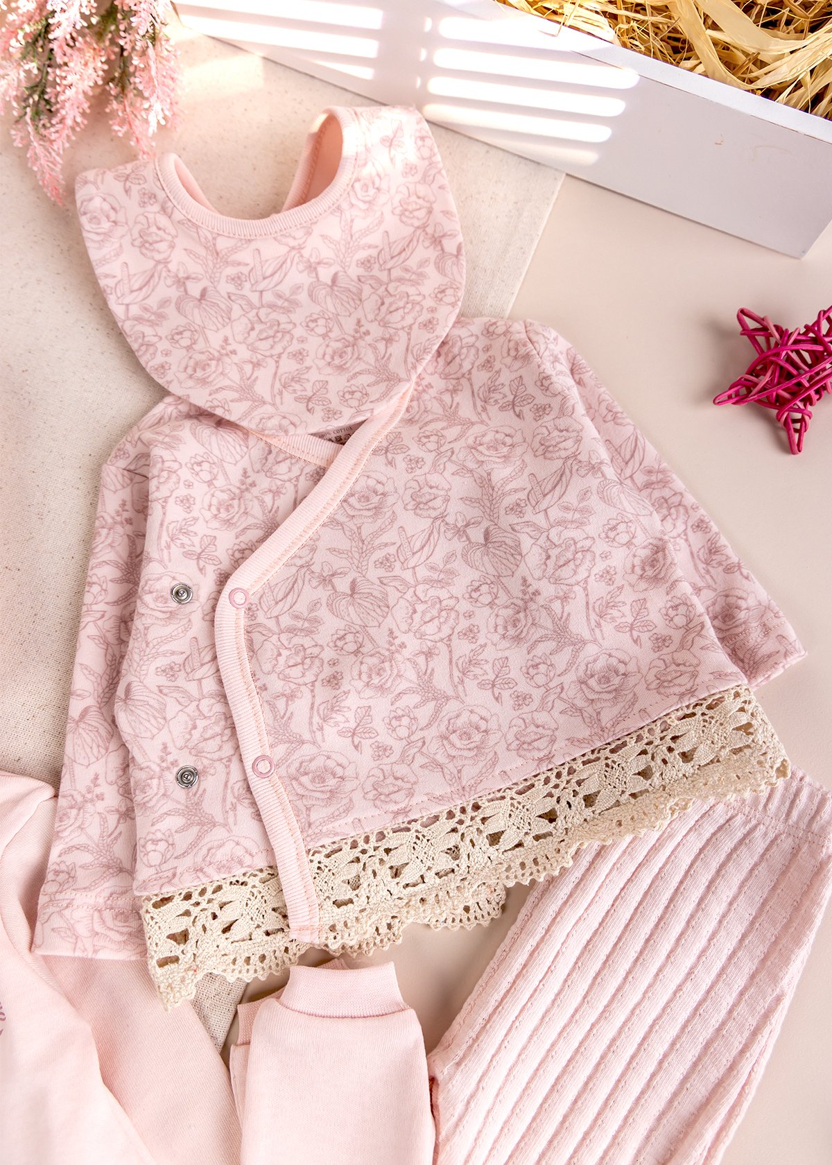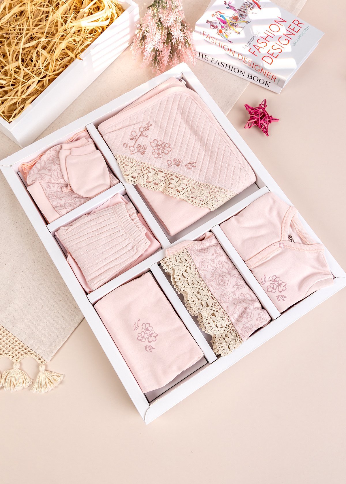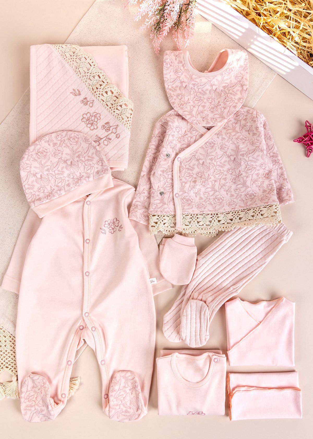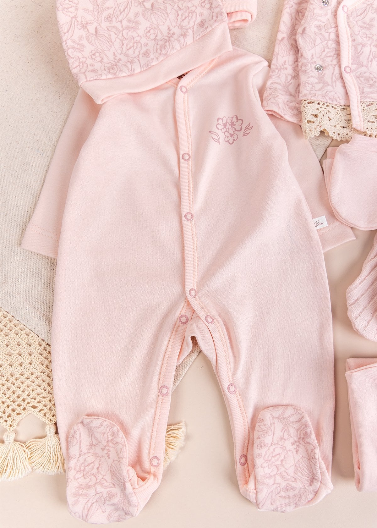 Çiçekli Zarif Dantelli 10 Parça 100% Pamuk Kız Bebek Hastane Çıkışı Yeni Doğan Set