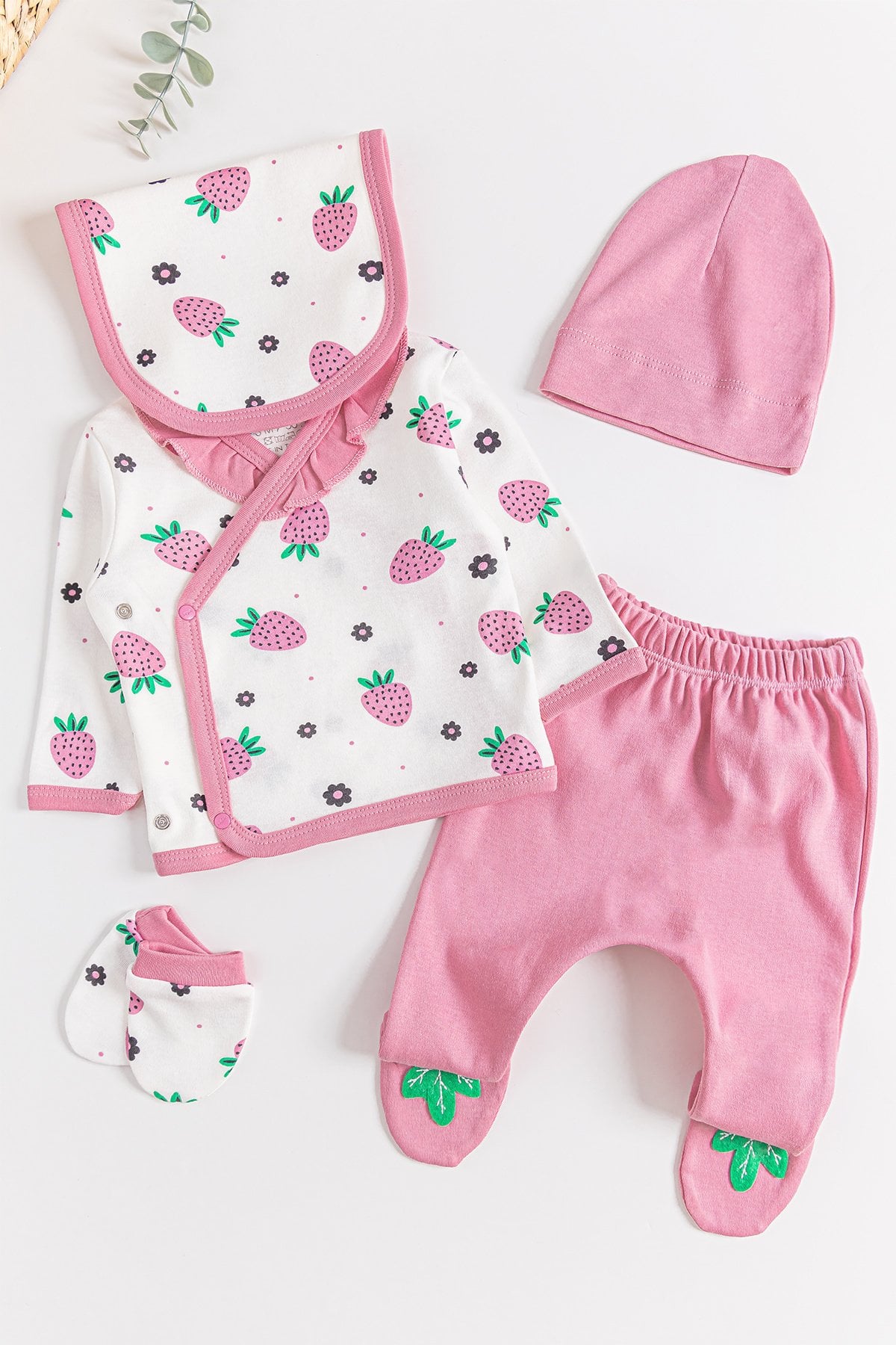 Çilek Baskılı 5 Parça Kız Bebek Hastane Çıkışı Bebek Takımı