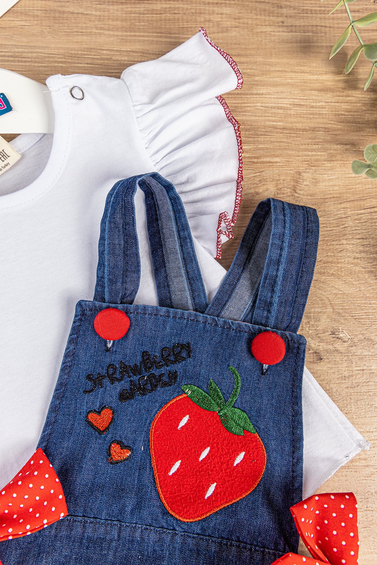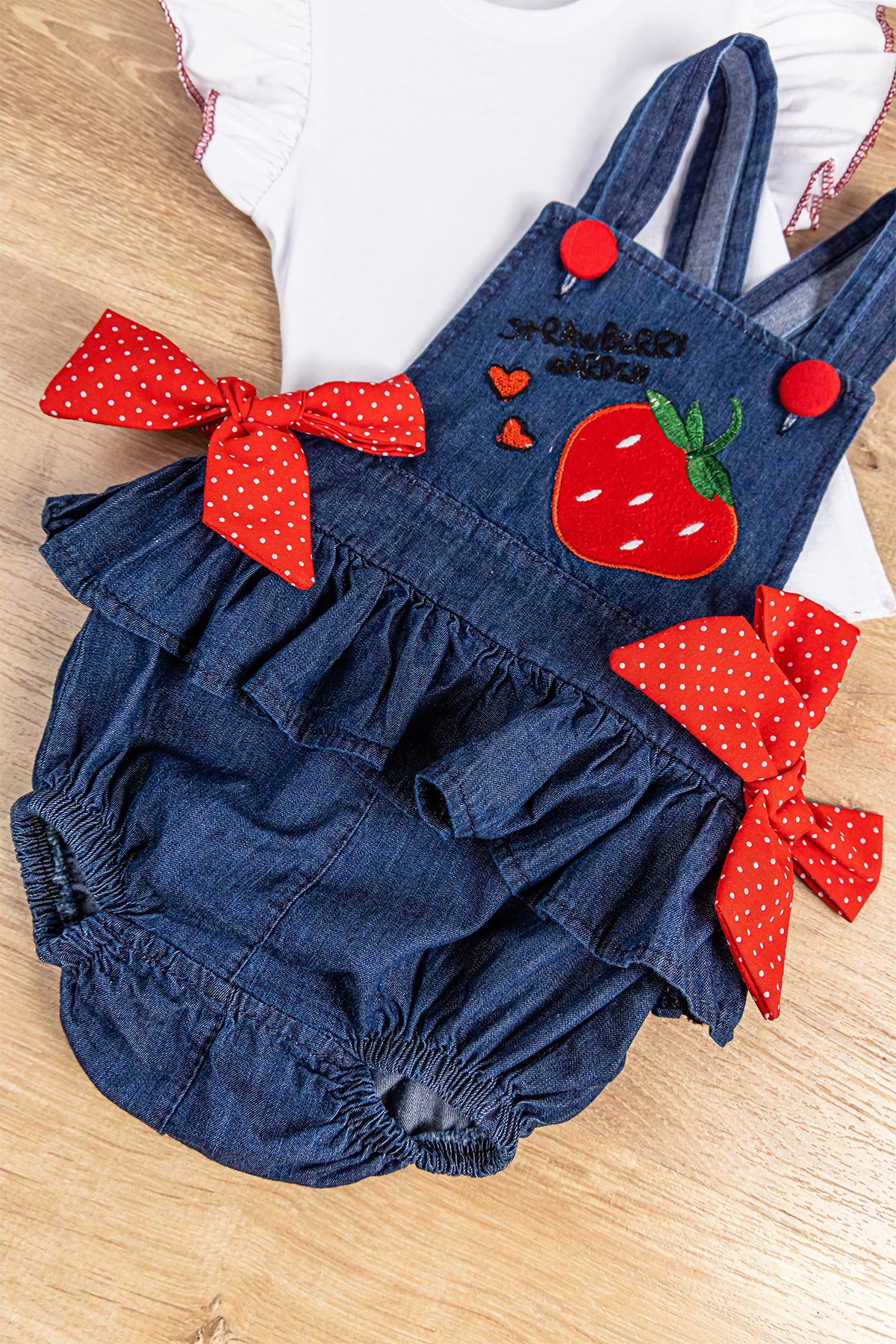 Çilek İşlemeli Yazlık Kız Bebek Tulum Salopet Body Takım