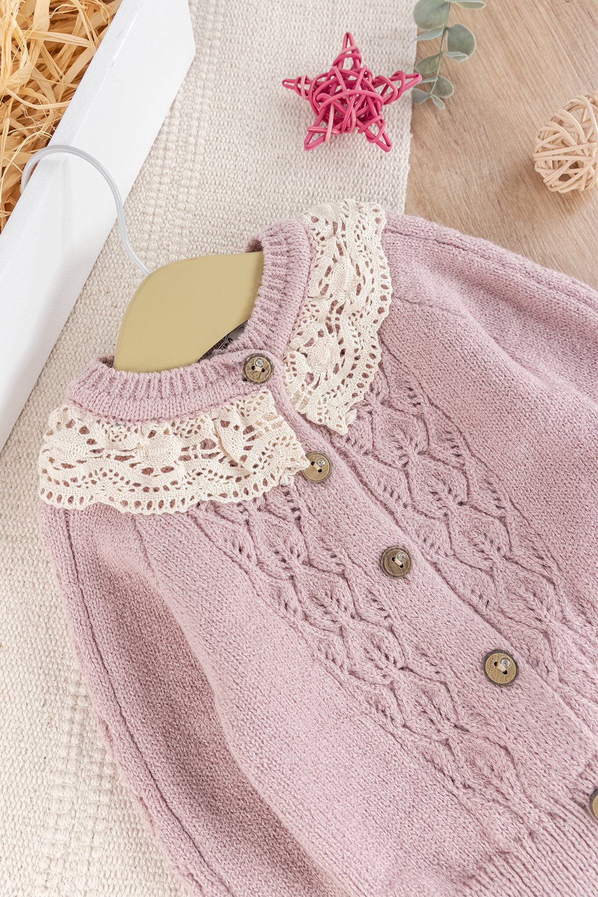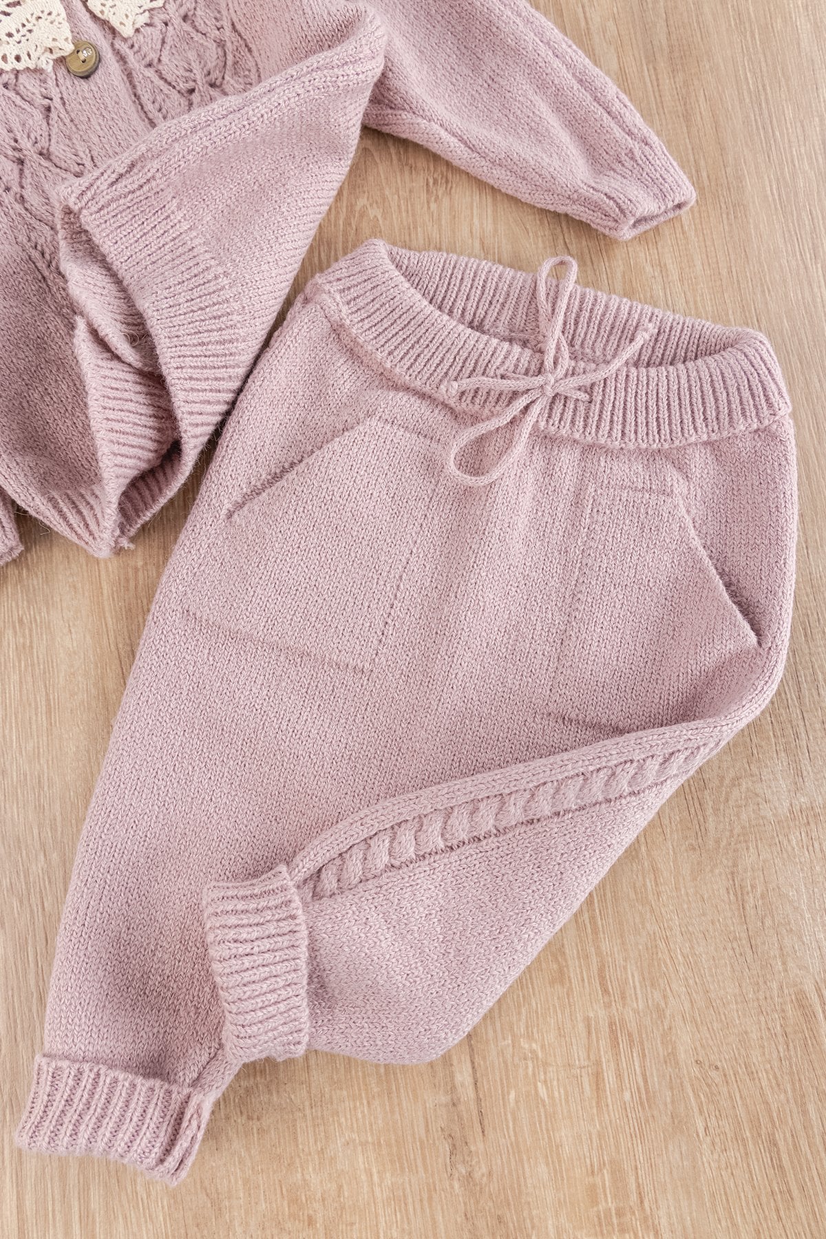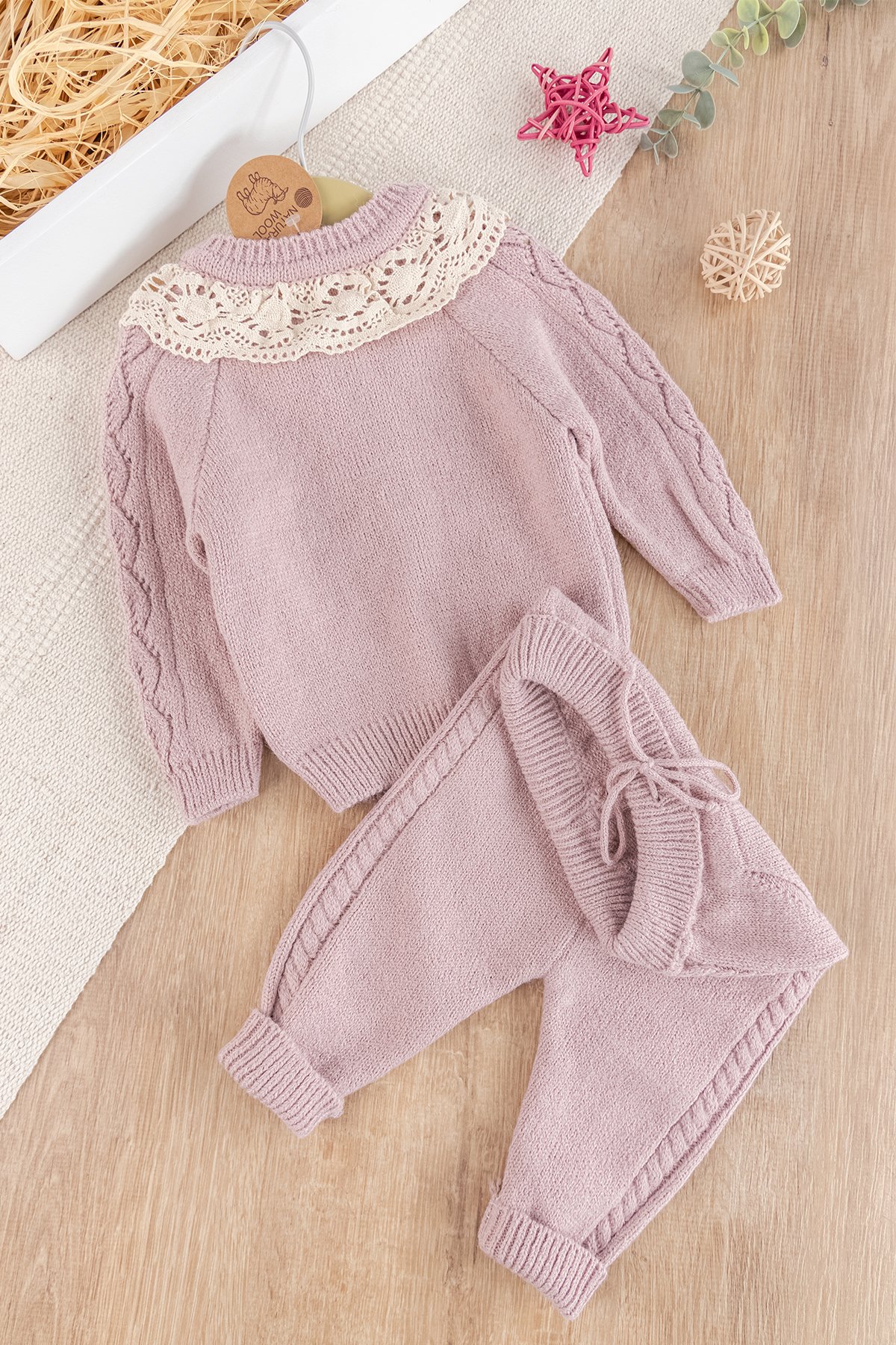 Dantel Yakalı Triko Kız Bebek Hırka Pantolon Takım Triko Bebek Seti Gülkurusu - 3 Ay