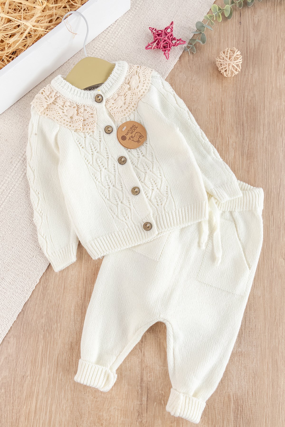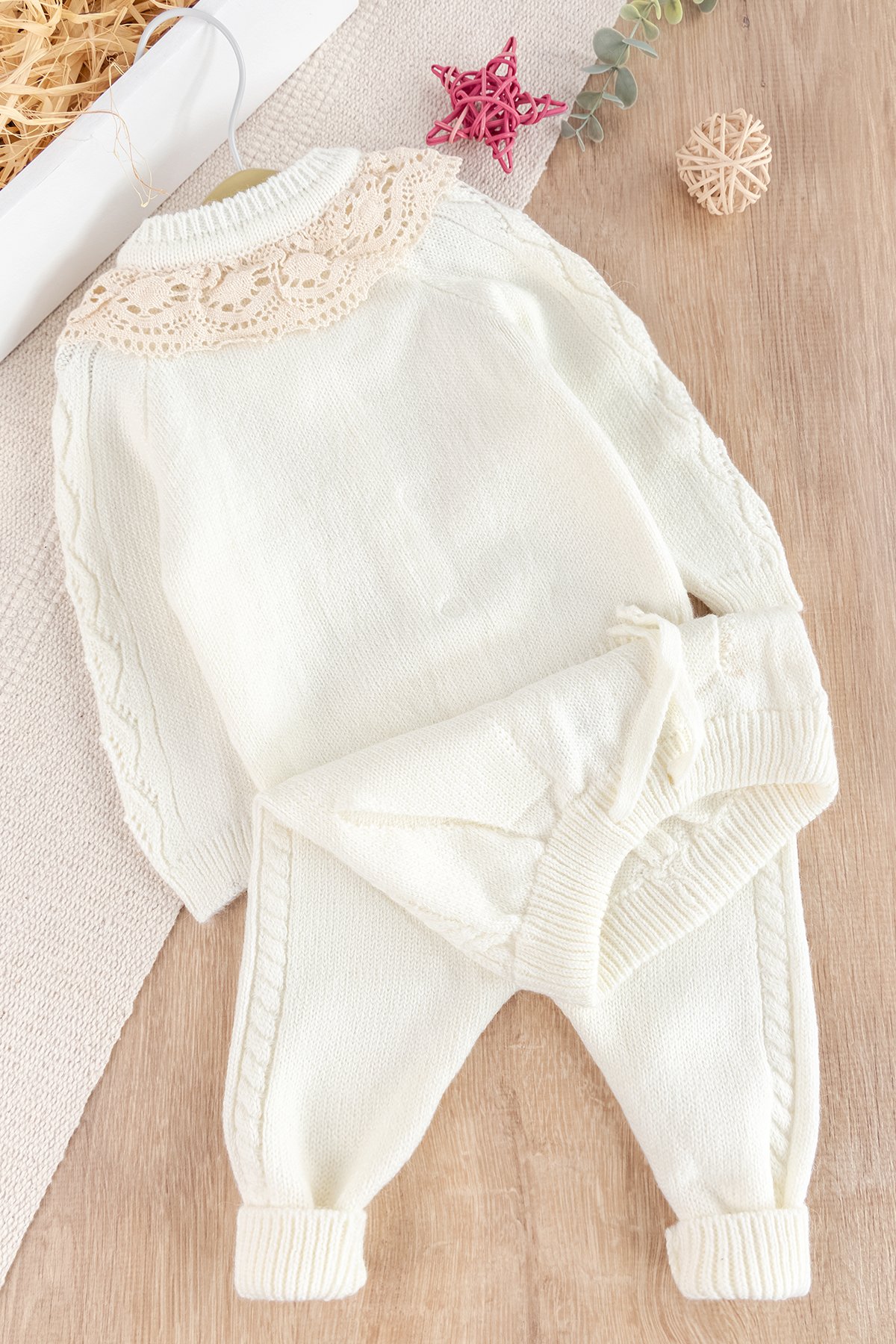 Dantel Yakalı Triko Kız Bebek Hırka Pantolon Takım Triko Bebek Seti