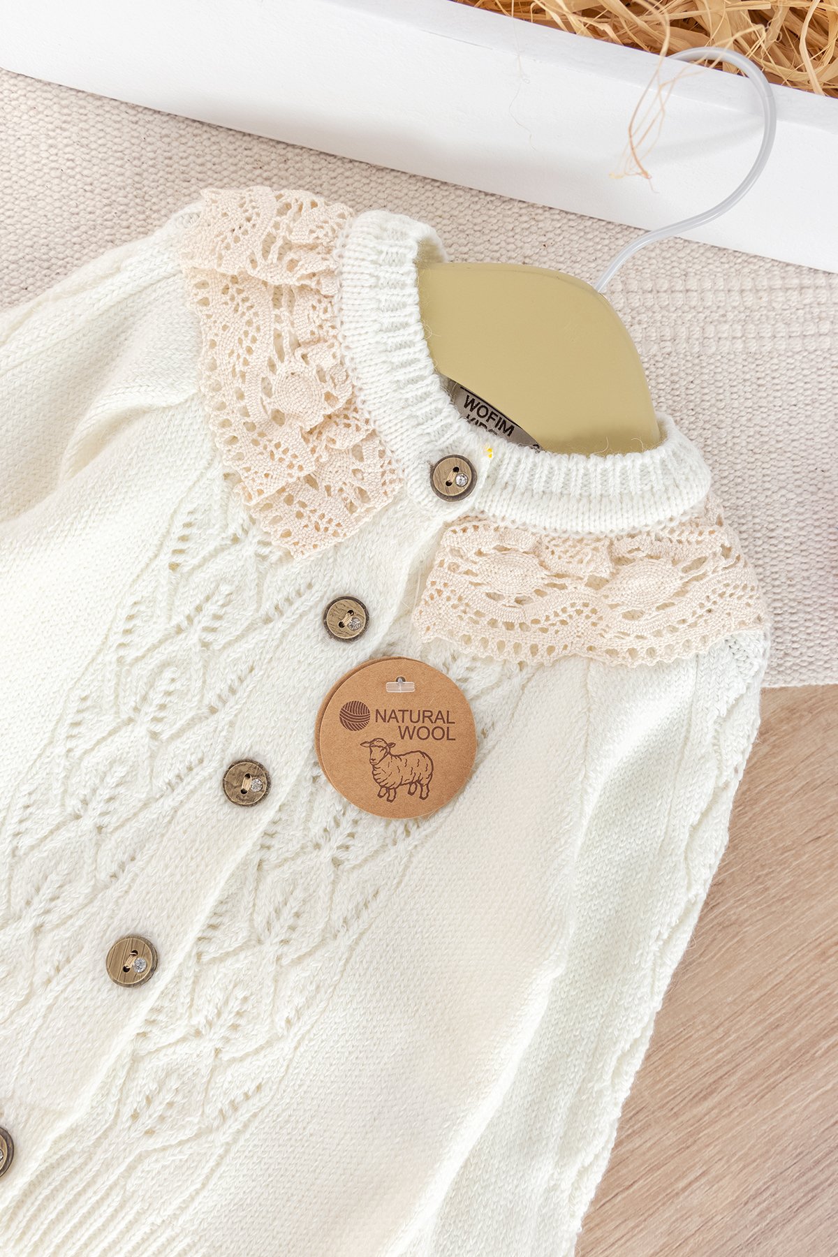 - Bebek takımının hırkası önden düğmelidir.