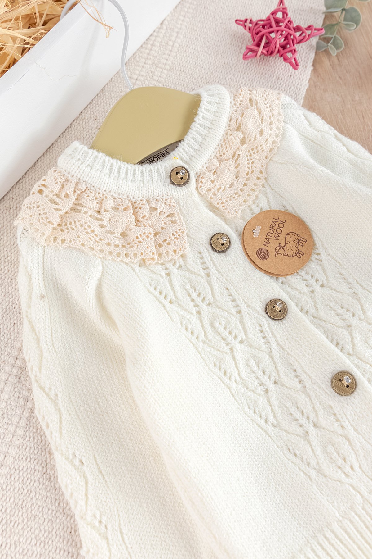 - The cardigan of the baby set is buttoned at the front.
