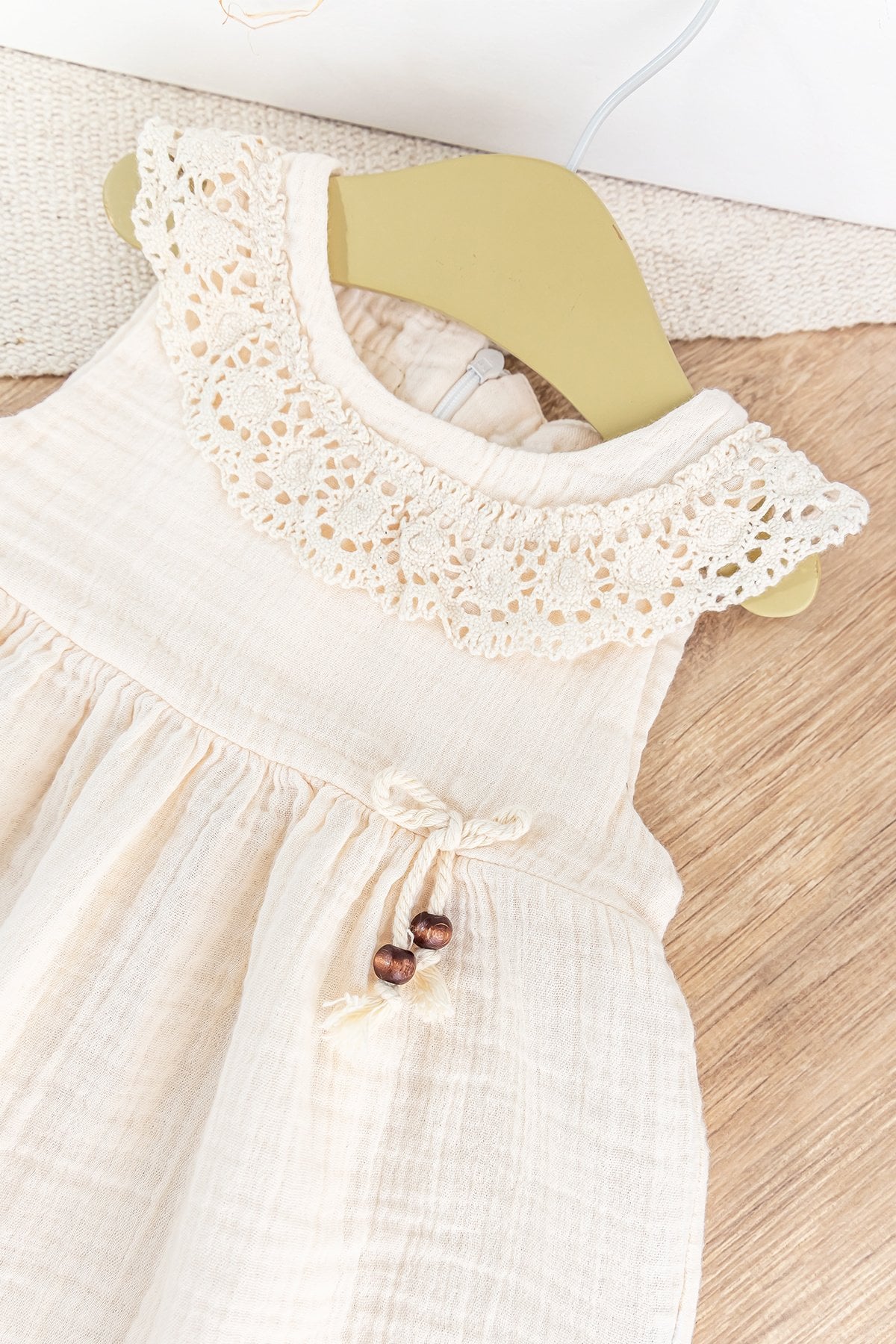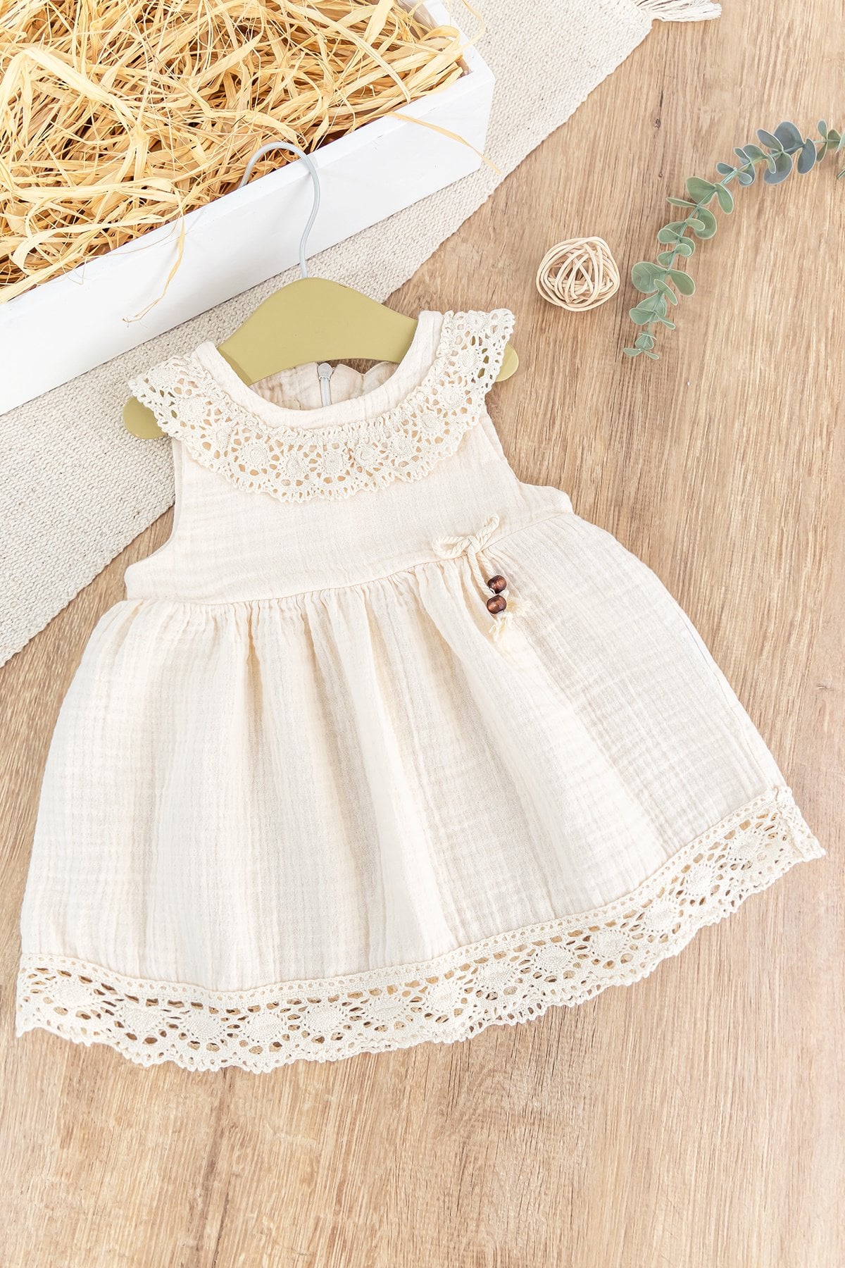 - Bebek elbisenin yakası güpür dantel detaylıdır.