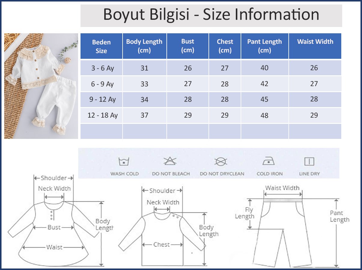 • Bebek takım soft dokulu pamuklu müslin kumaş ile üretilmiştir.
