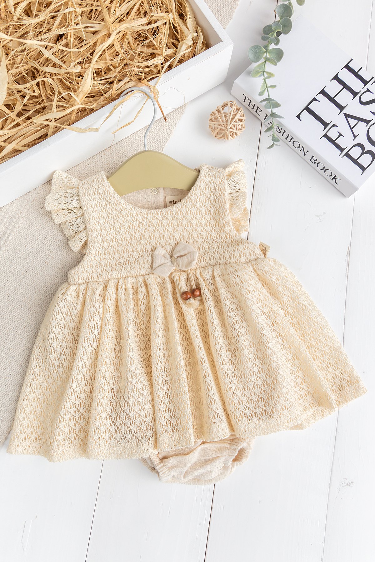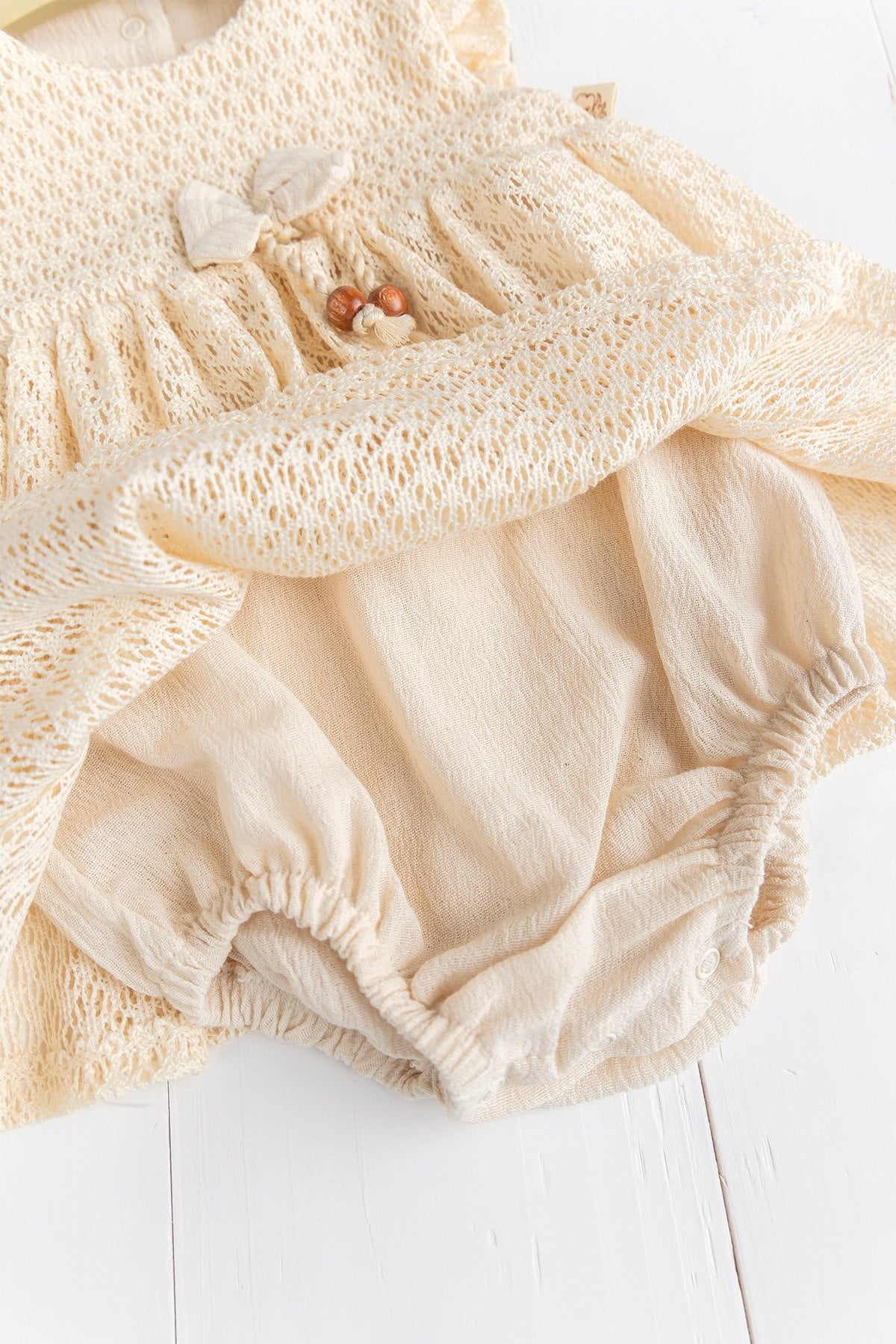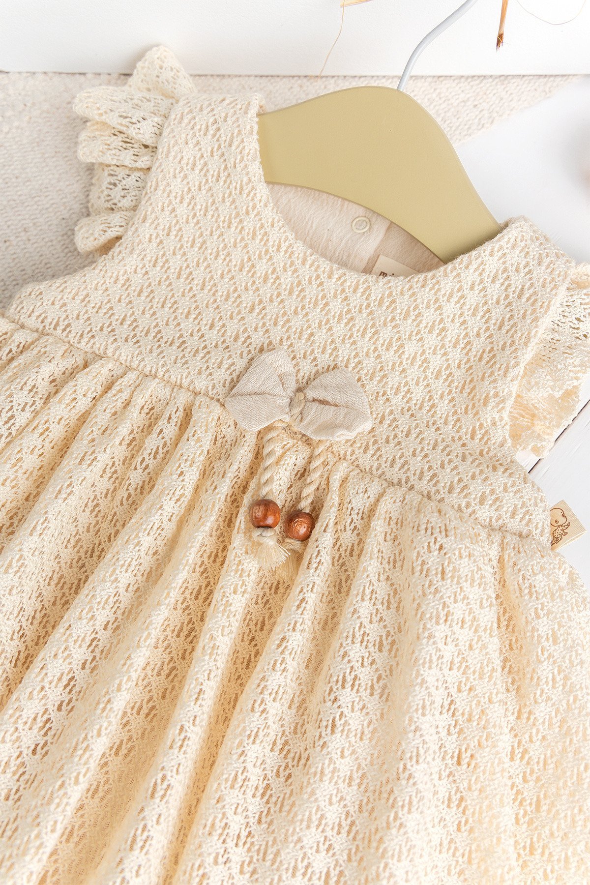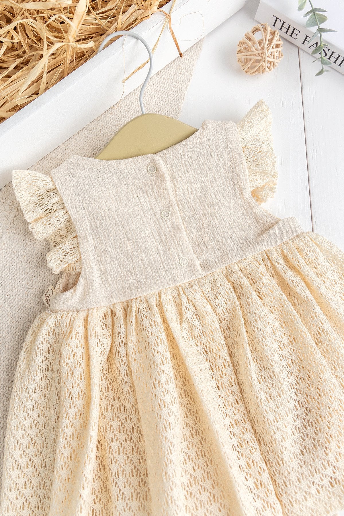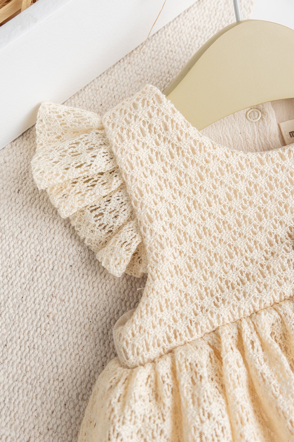 - The shoulders of the baby dress are decorated with ruffles.