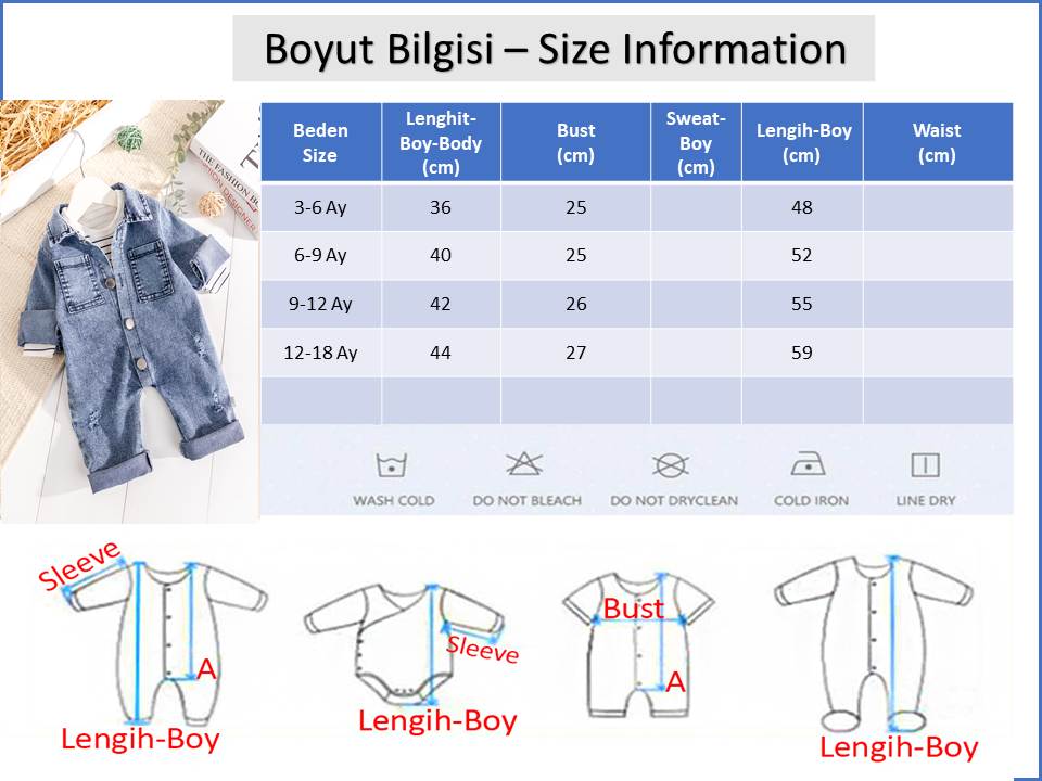 - Erkek bebek tulum yumuşak dokulu esnek denim kumaştan üretilmiştir