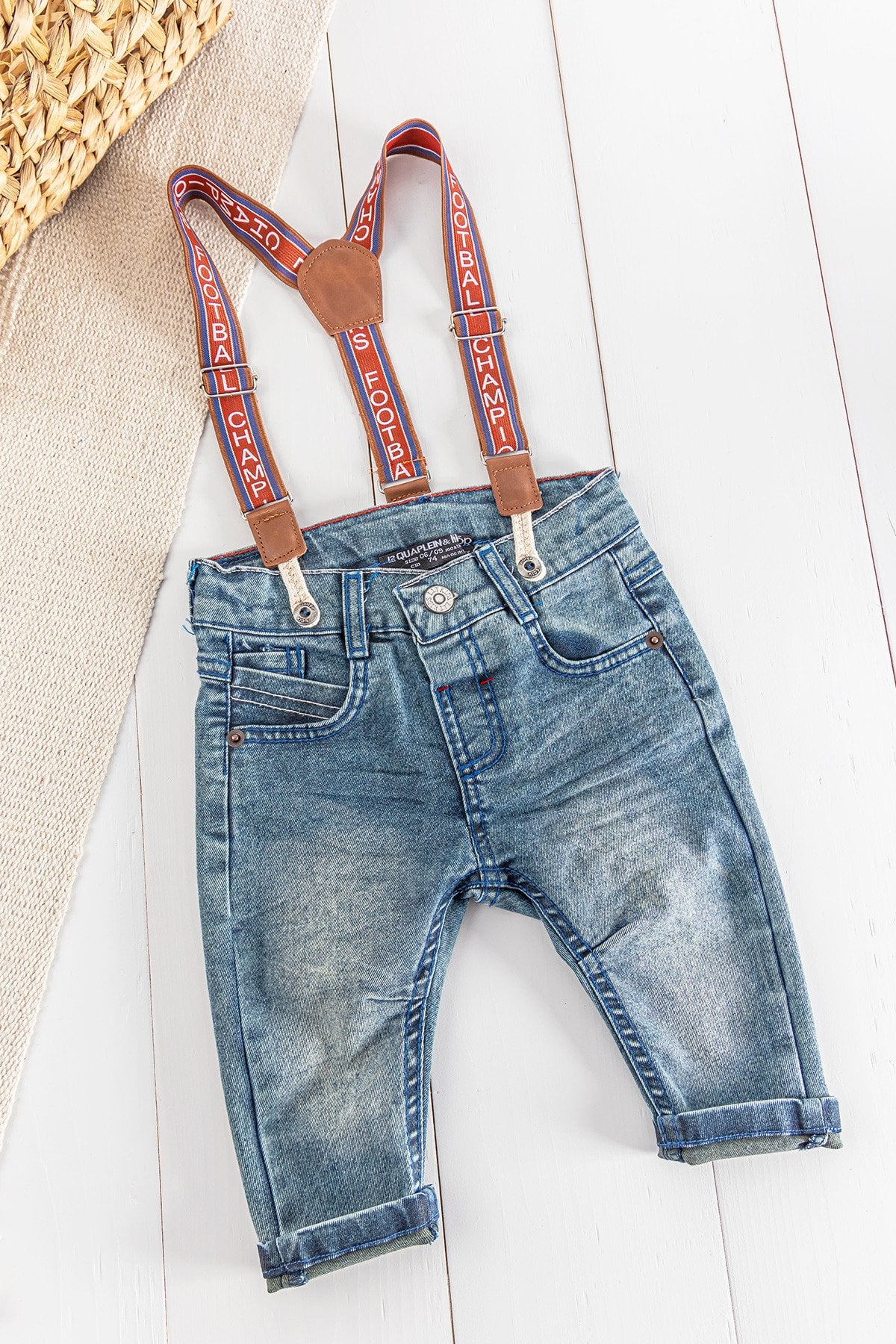 - Baby trousers are model with suspenders.