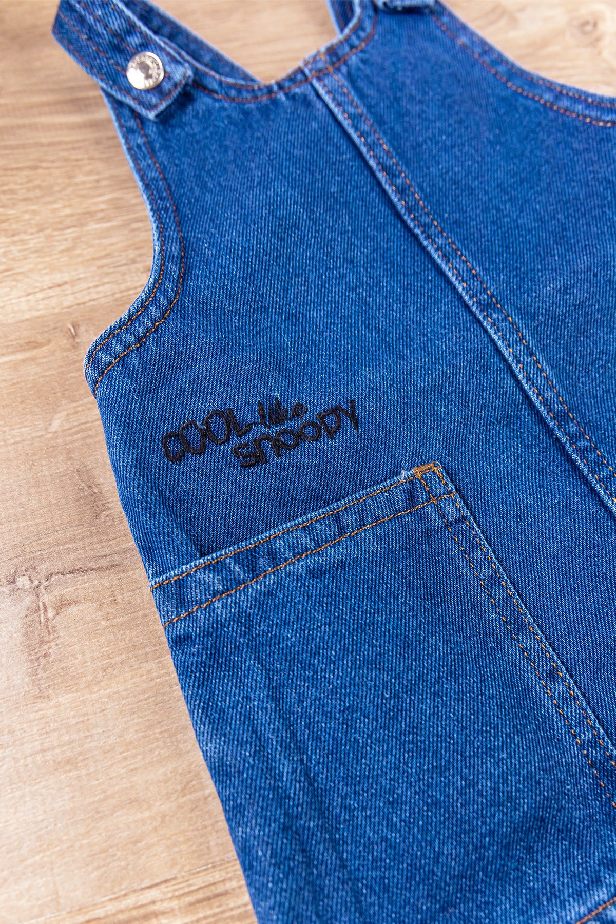 - The straps of the denim dress gilet have snap fasteners.