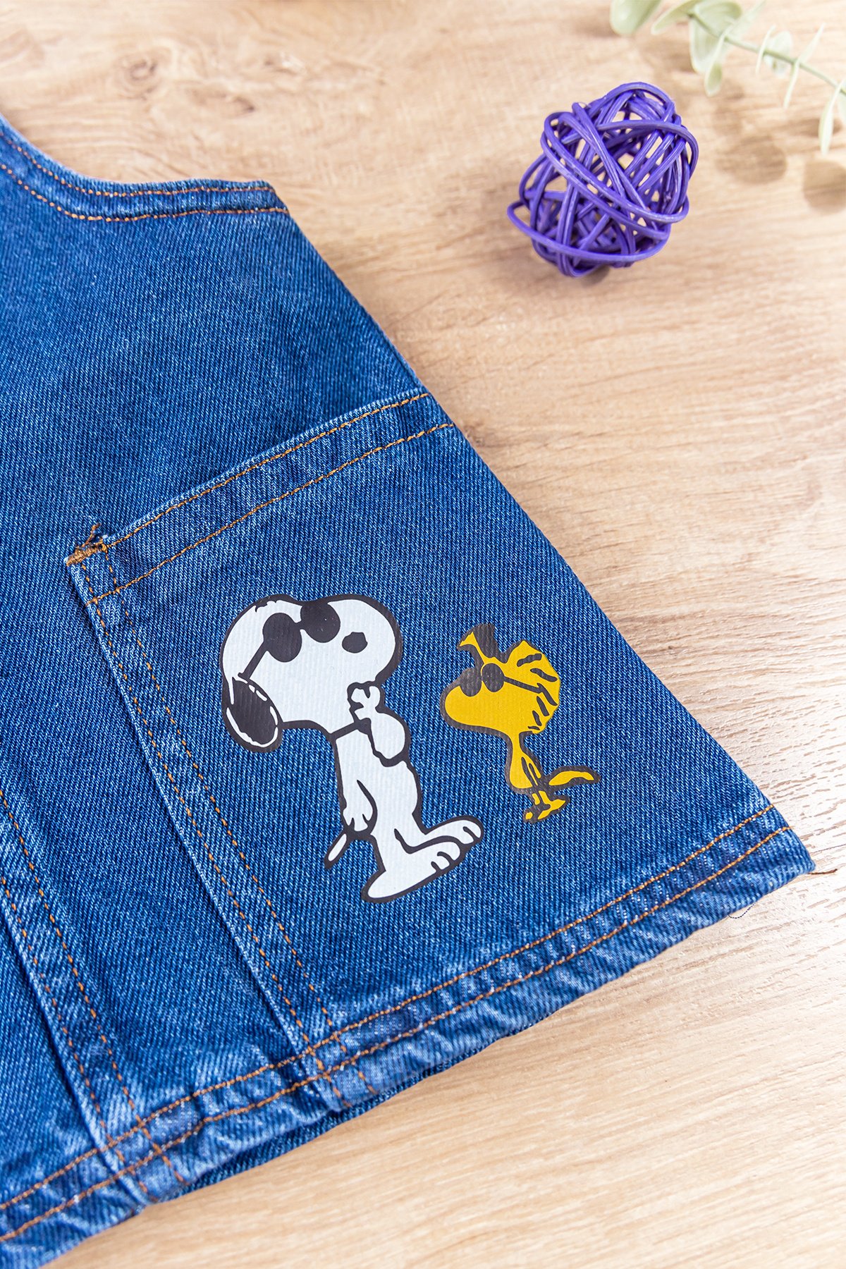 - The pocket of the denim dress is figured.