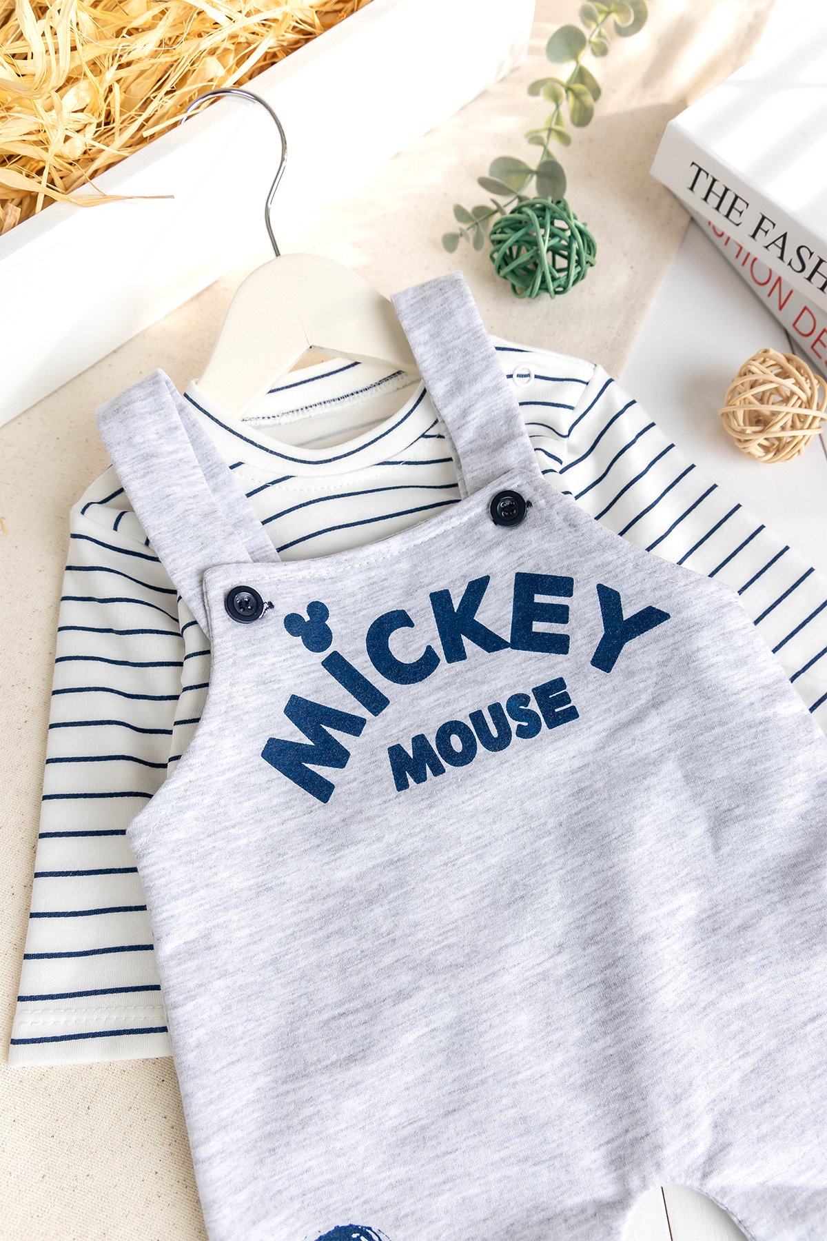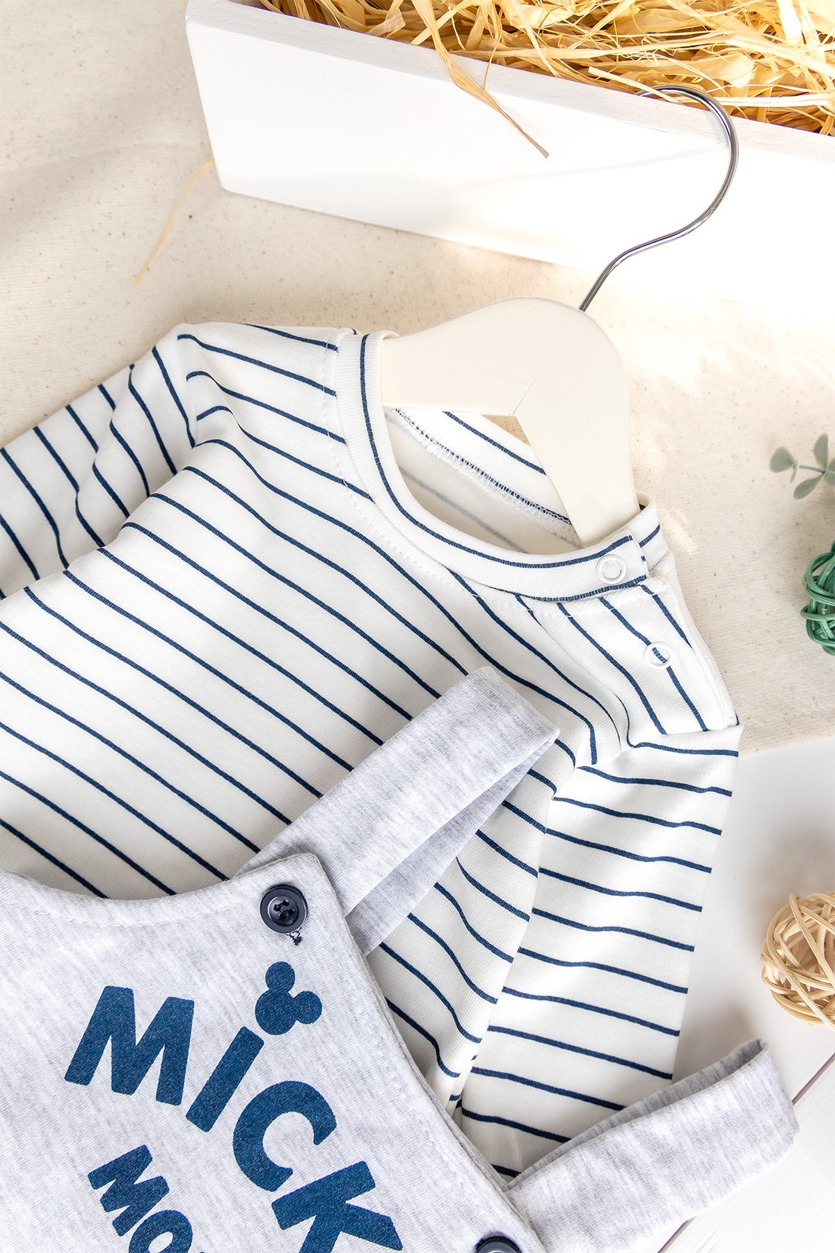 - The straps of the baby overalls are buttoned.