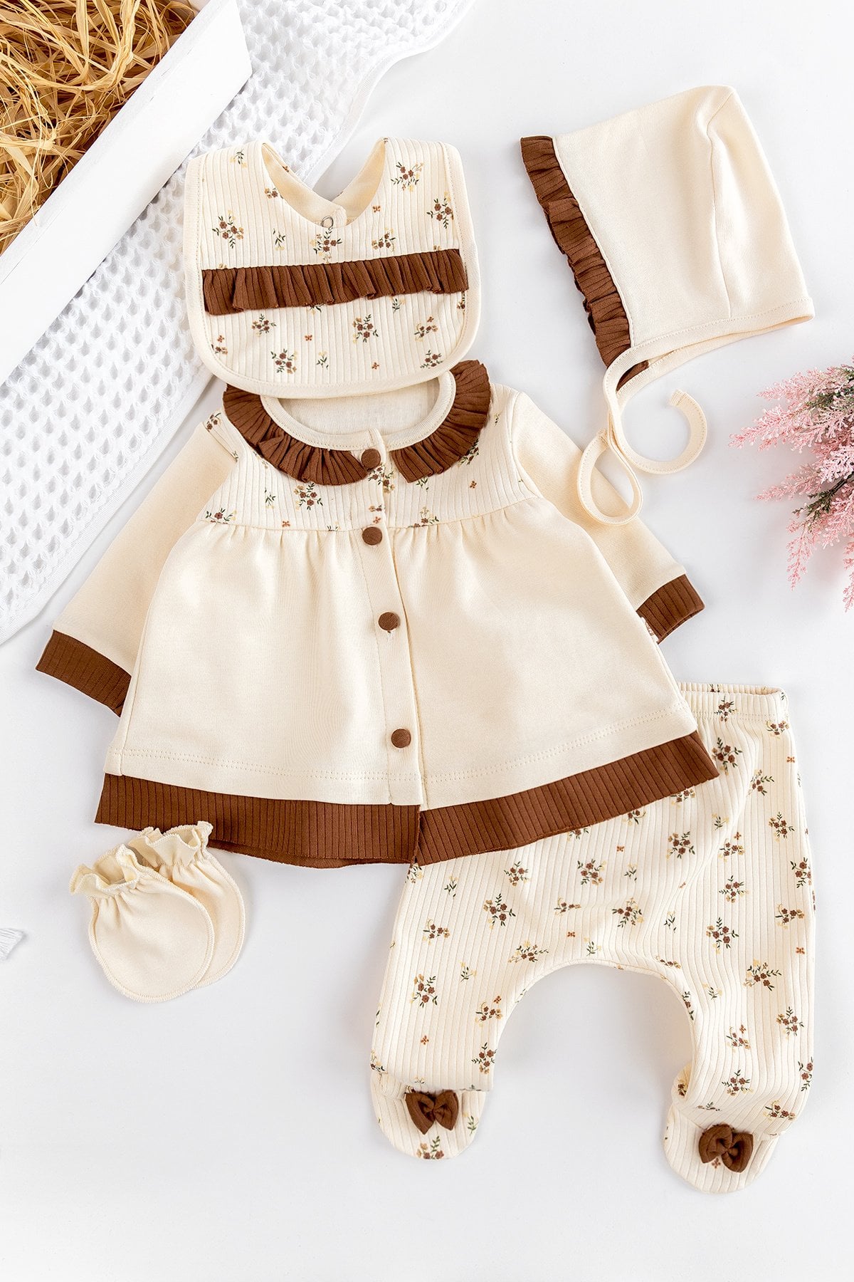 Babymod Ruffle Collar Front Buttoned Flower Baby Girl 5 Piece Hospital Release Baby Set