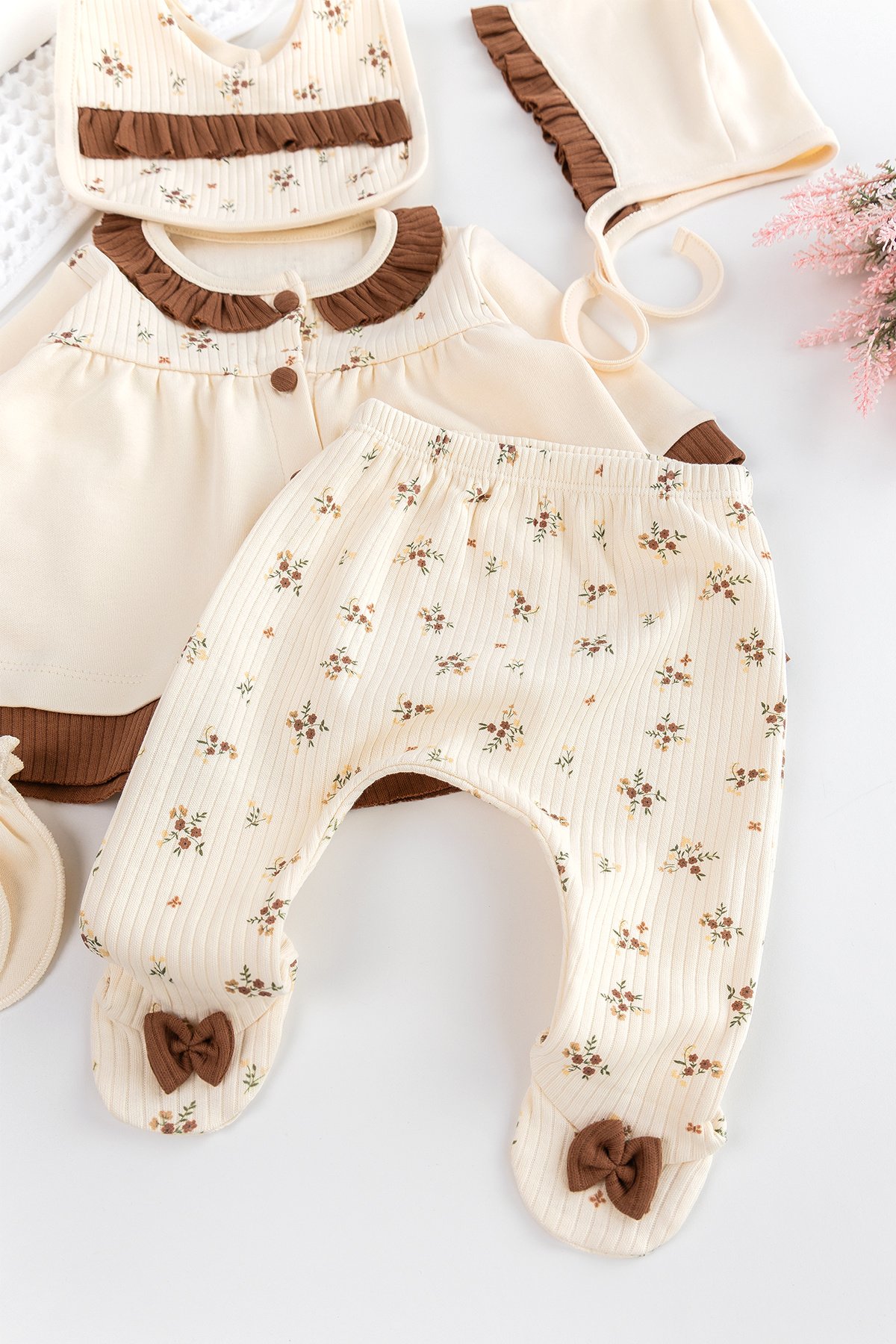 Fırfır Yakalı Önden Düğmeli Çicekli Kız Bebek 5 Parca Hastane Çıkışı Bebek Takımı Kahve - 0-3 AY