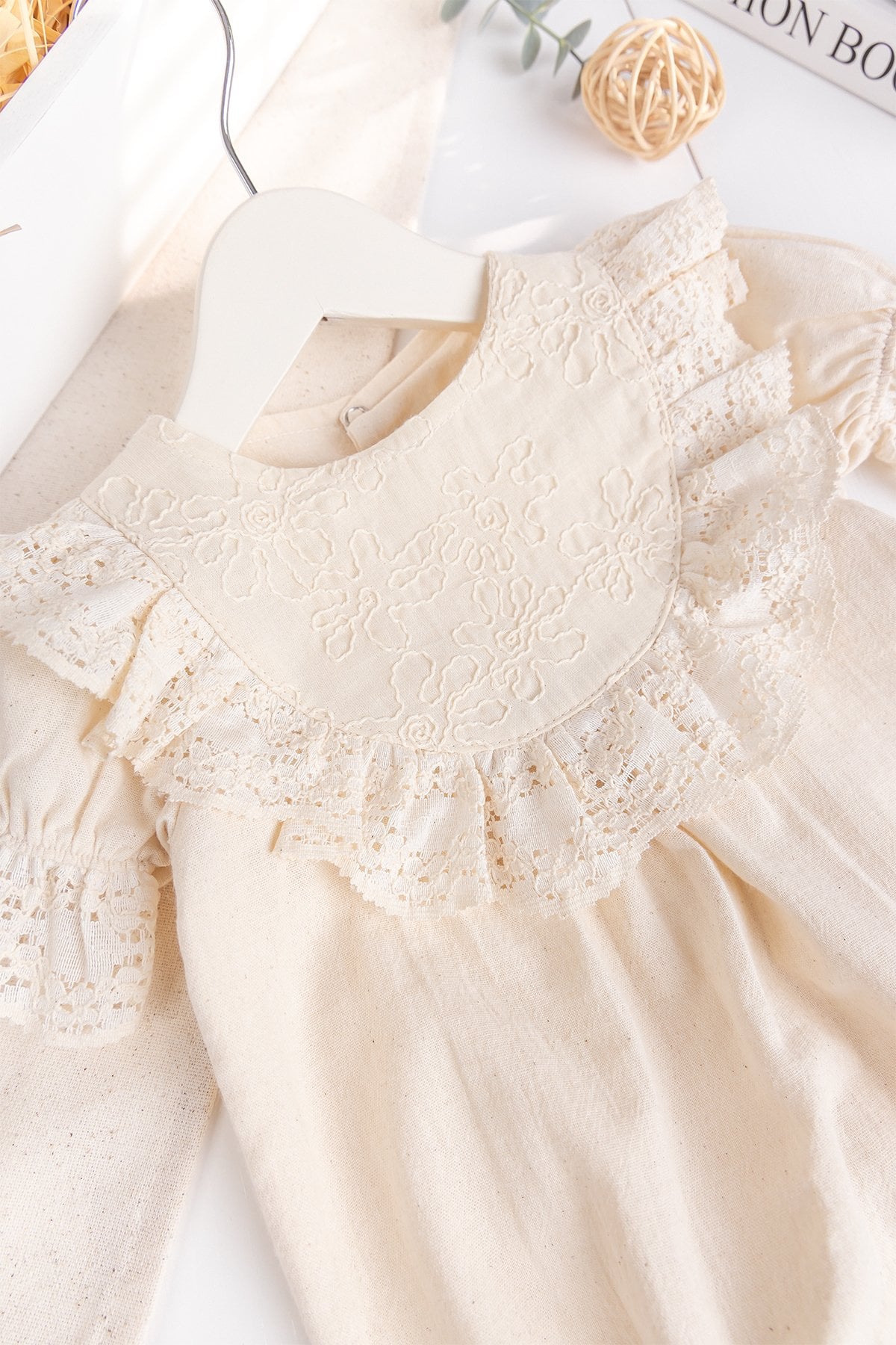 - Kız bebek tulum yumuşak dokulu pamuklu keten kumaştan üretilmiştir