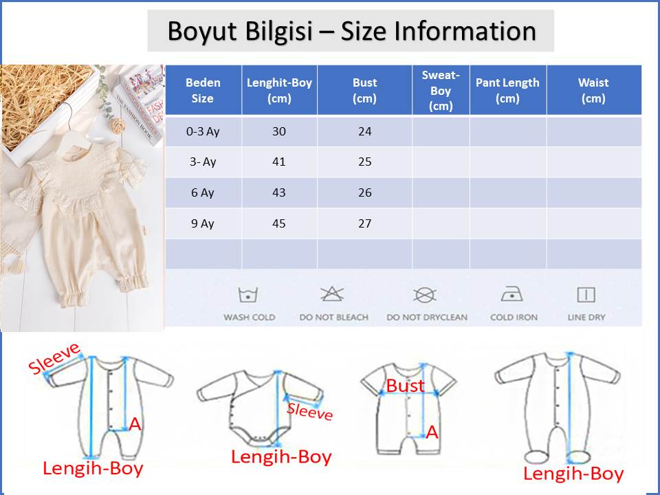 - Kız bebek tulumun yakası ve önü fır fır süslemelidir