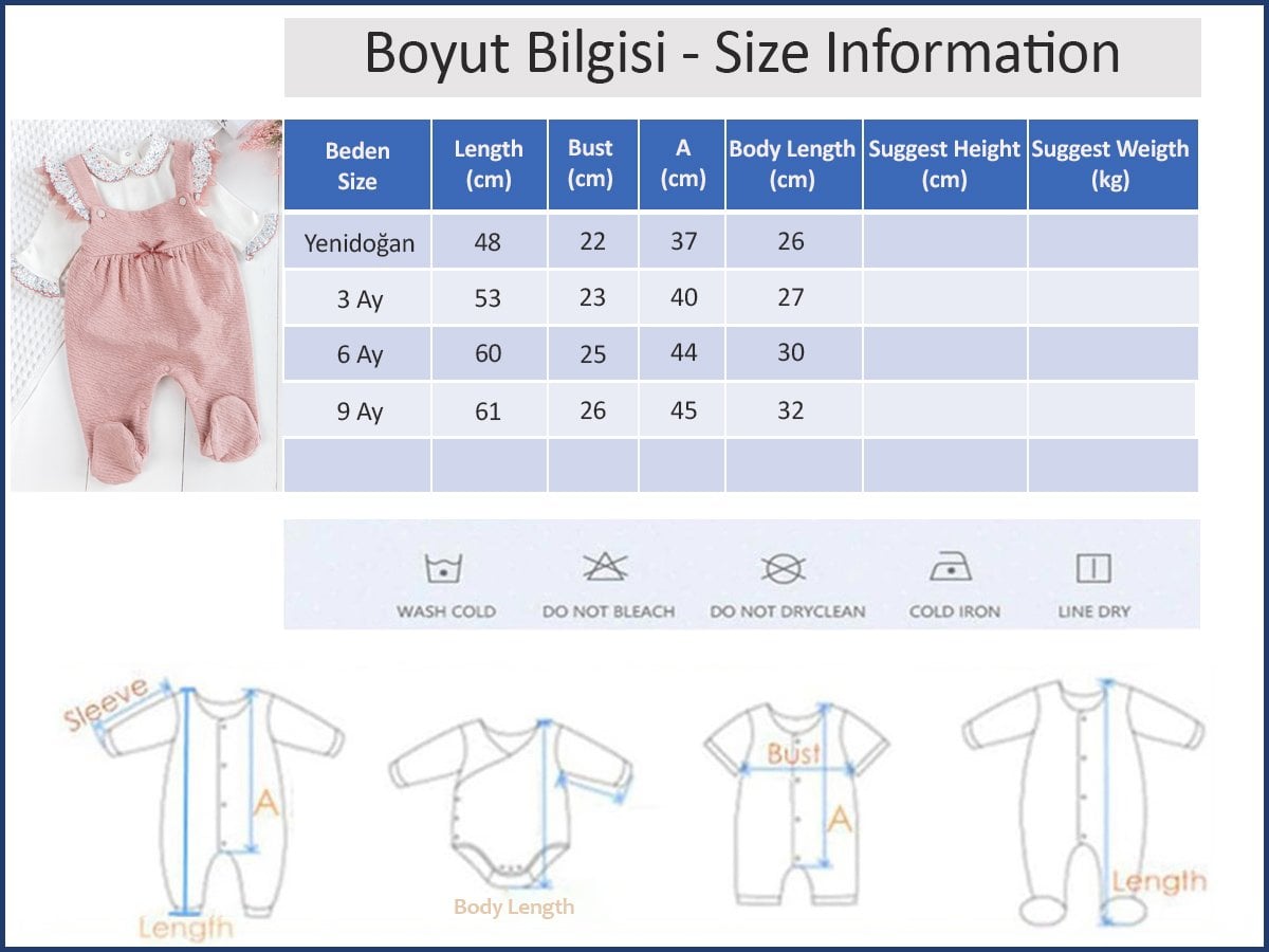 - Bebek tulum salopet soft dokulu pamuklu kendinden dokulu kumaş ile üretilmiştir.