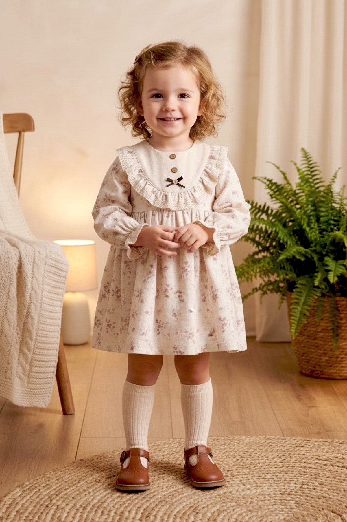 - Fırfır Detayları: Koldaki ve yakadaki zarif fırfırlar elbiseye tatlı bir hareket ve şıklık katar.
