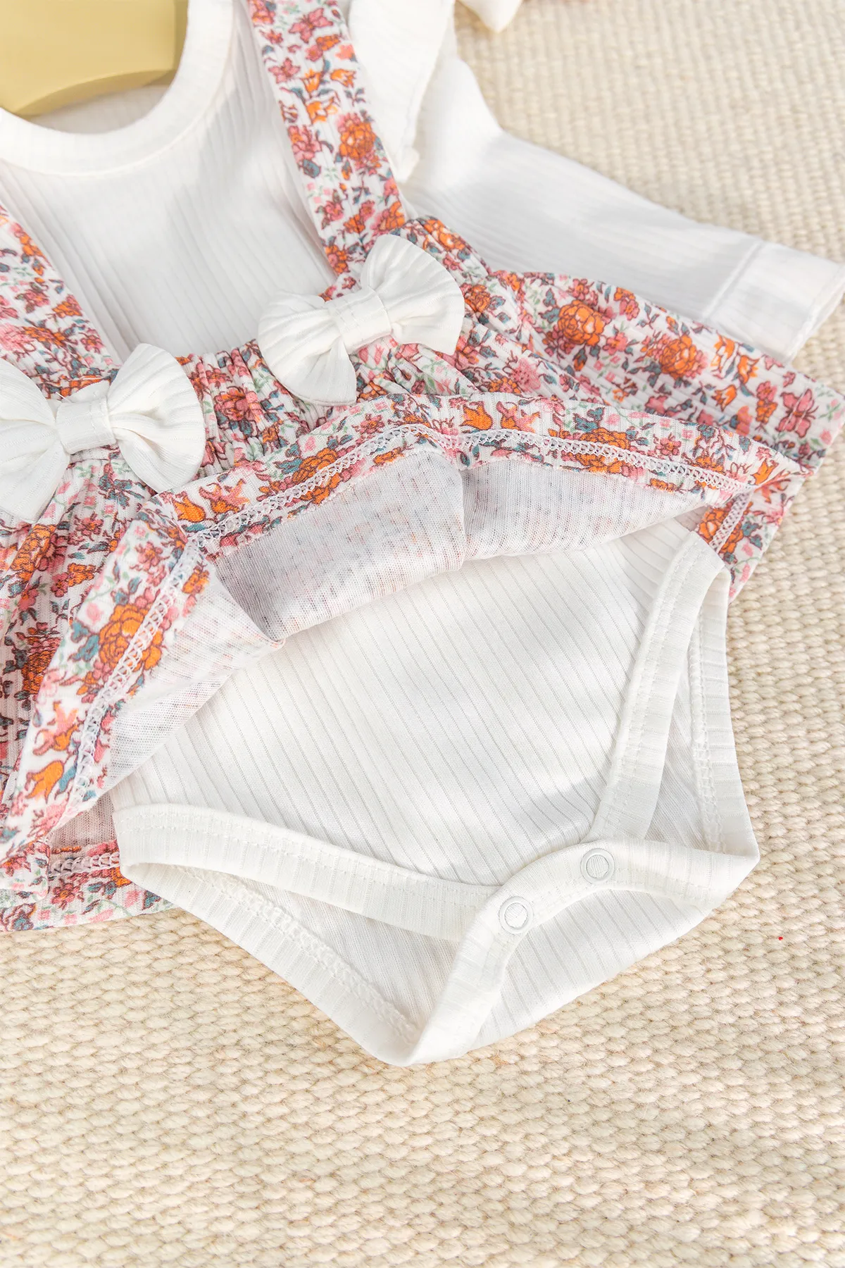 - The front of the baby dress is decorated with bows.