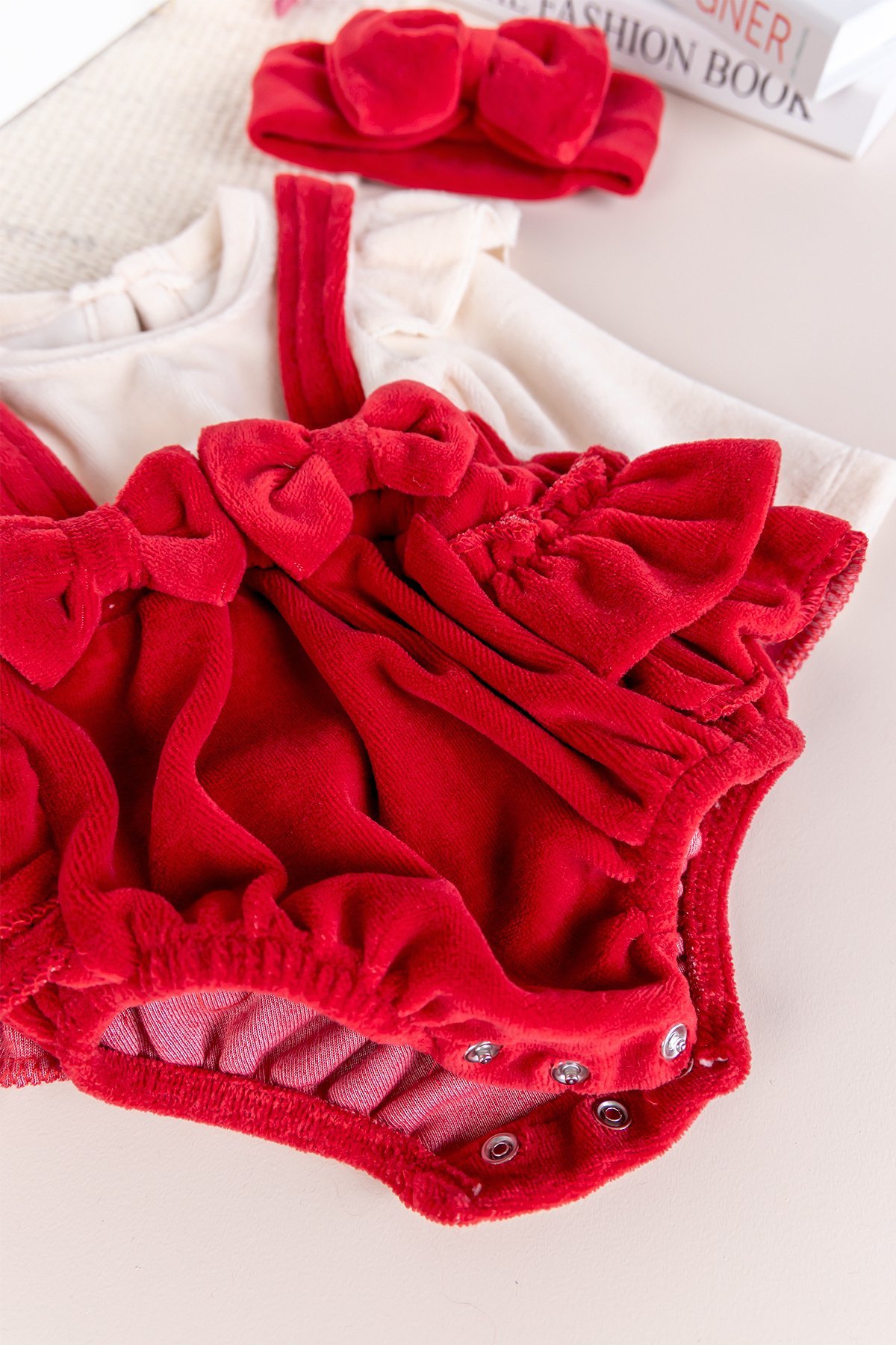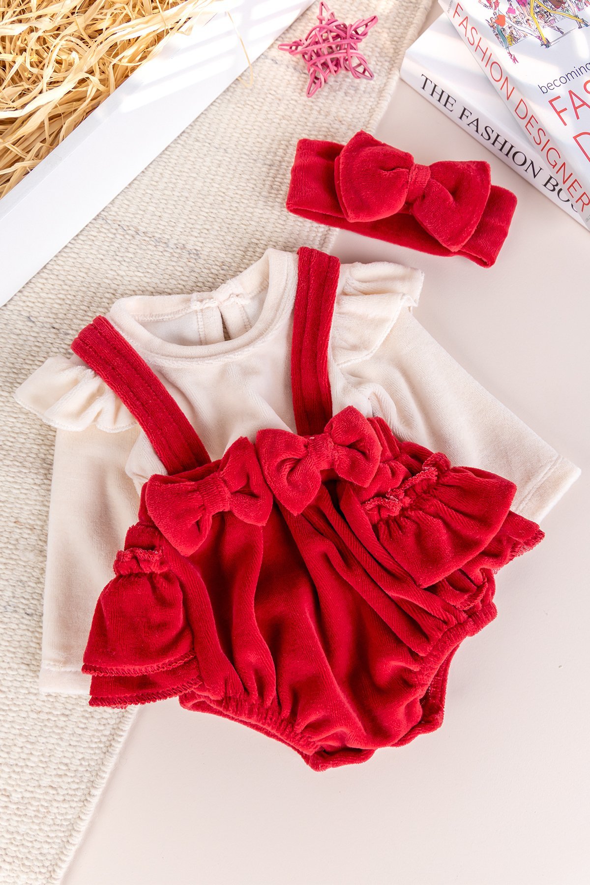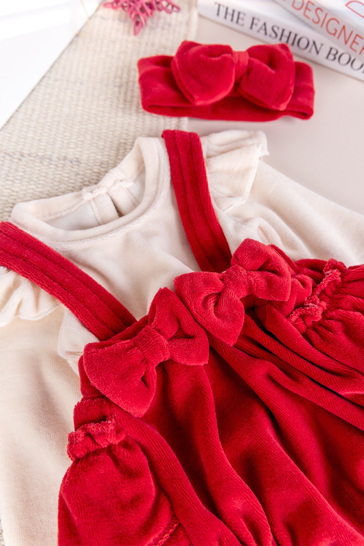 Fiyonklu Bandanalı Kadife Kız Bebek Tulum Salopet Bebek Elbise