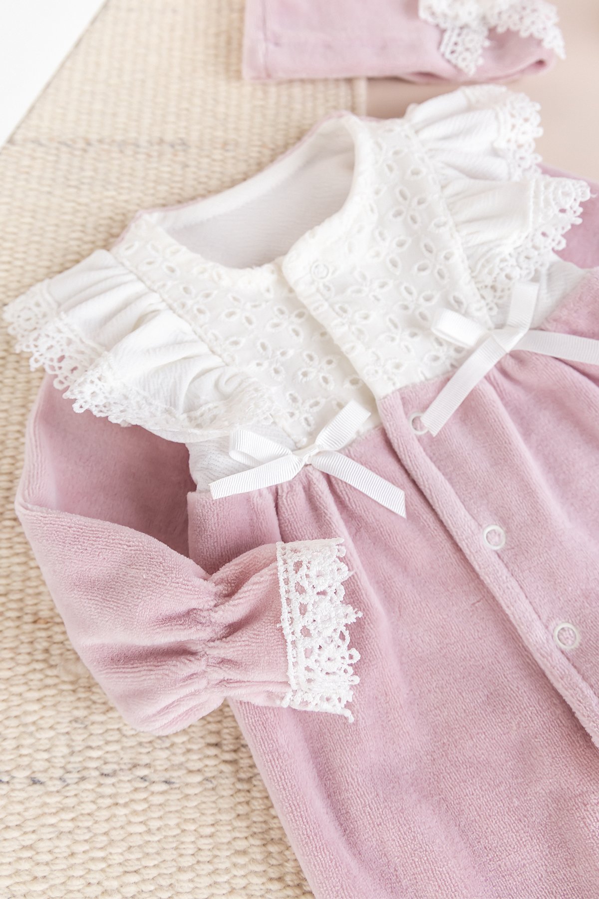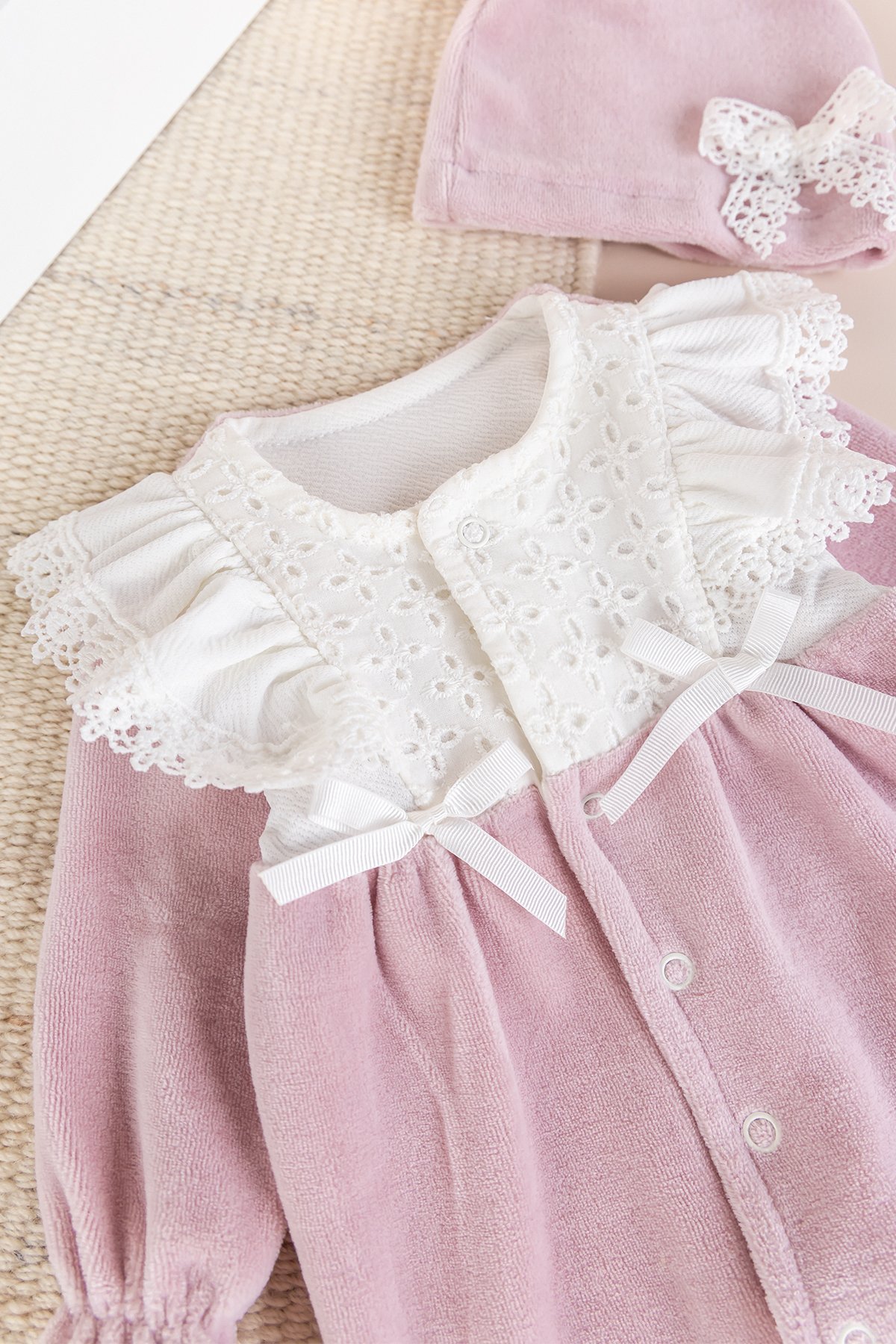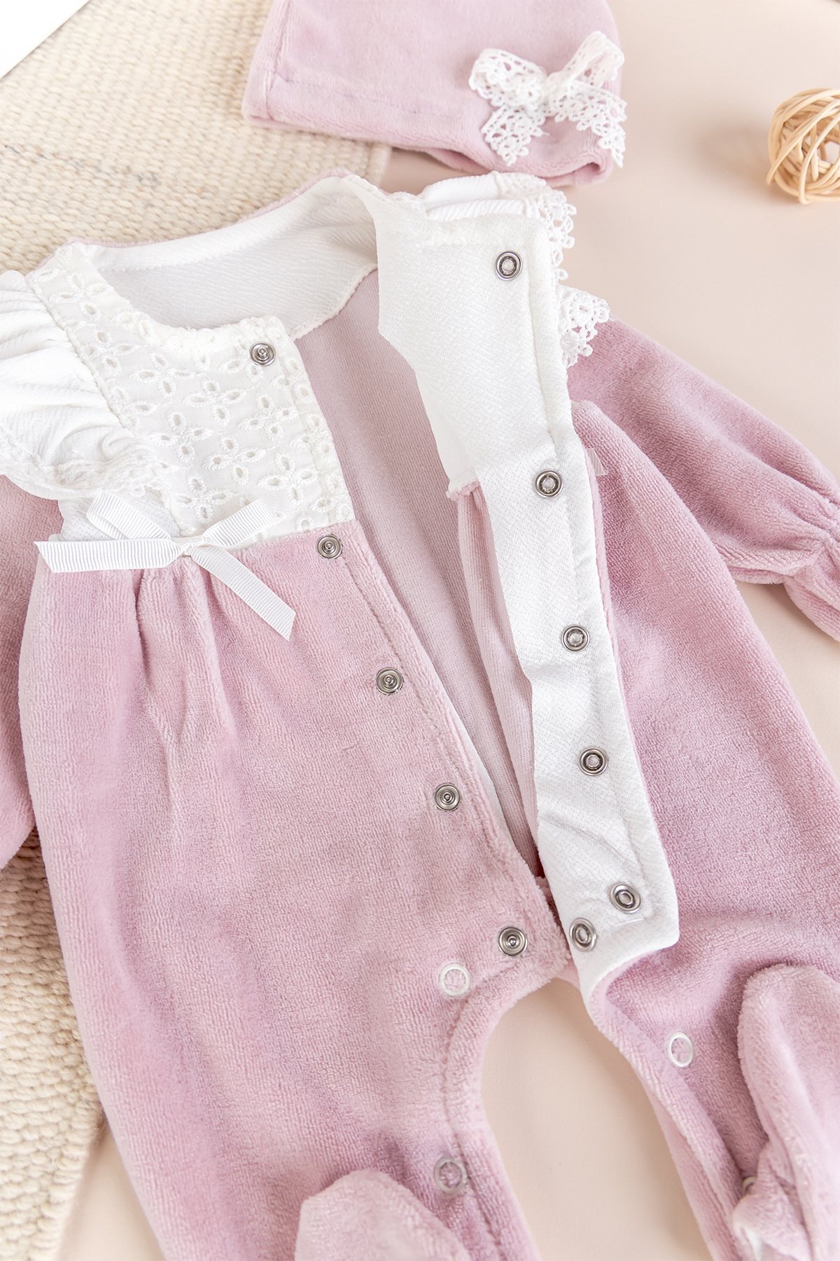 - Kız bebek tulum yumuşak dokulu pamuklu kadife kumaştan üretilmiştir