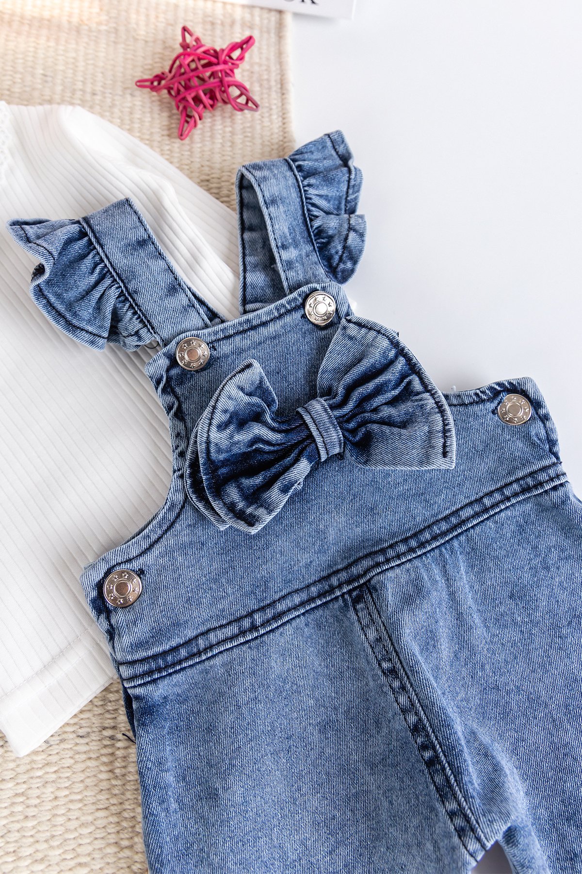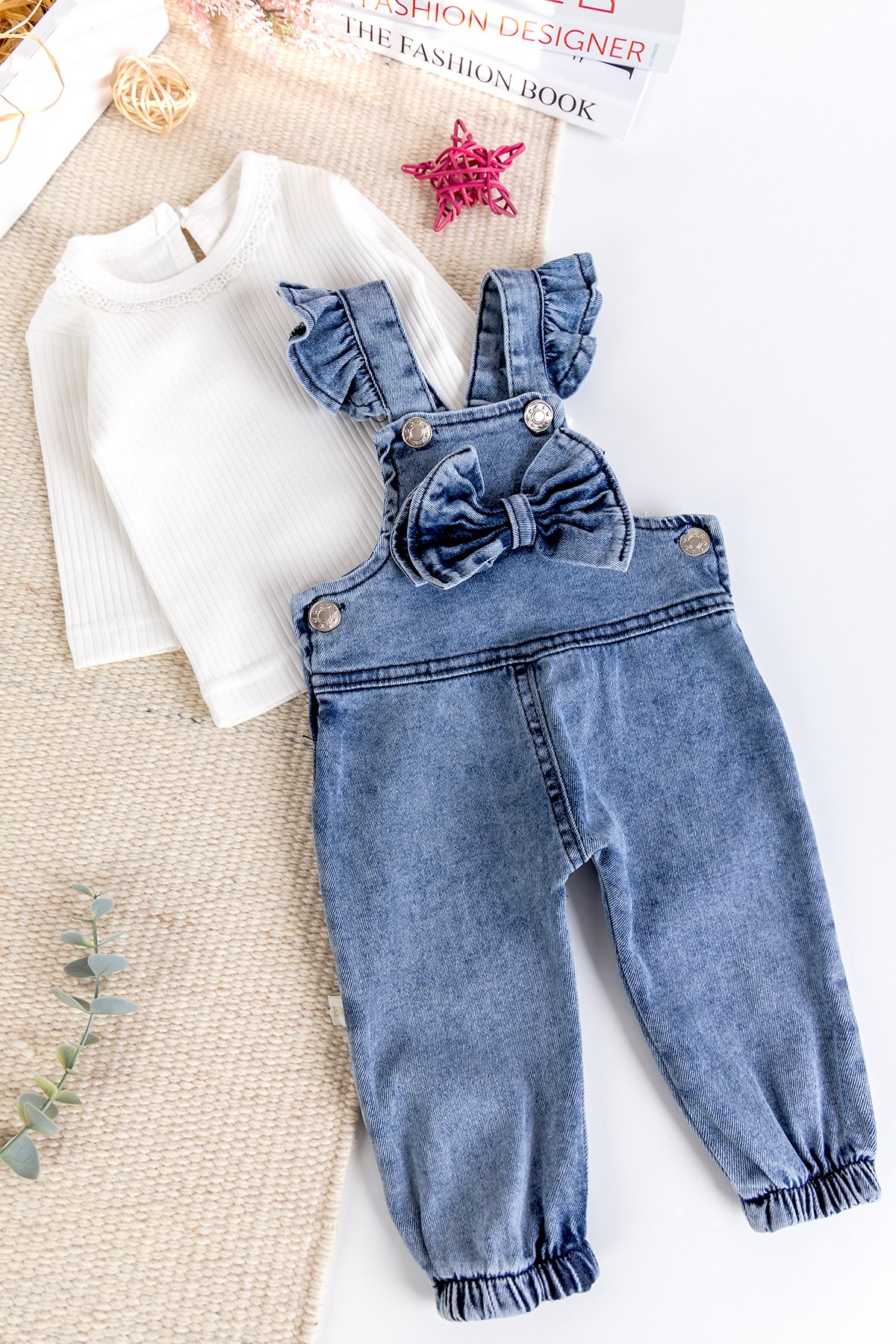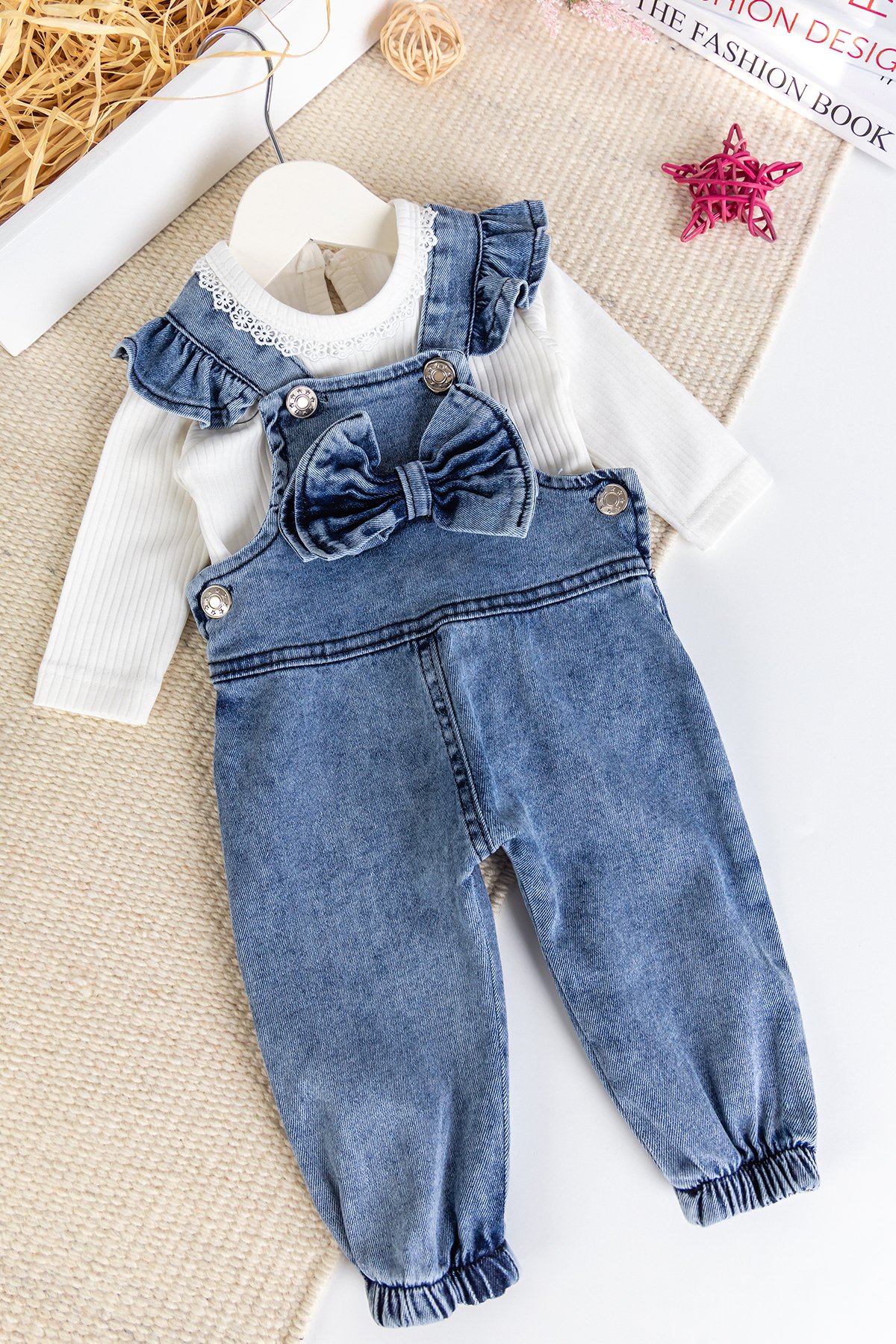 Fiyonklu Kız Bebek Kot Salopet Tulum Set