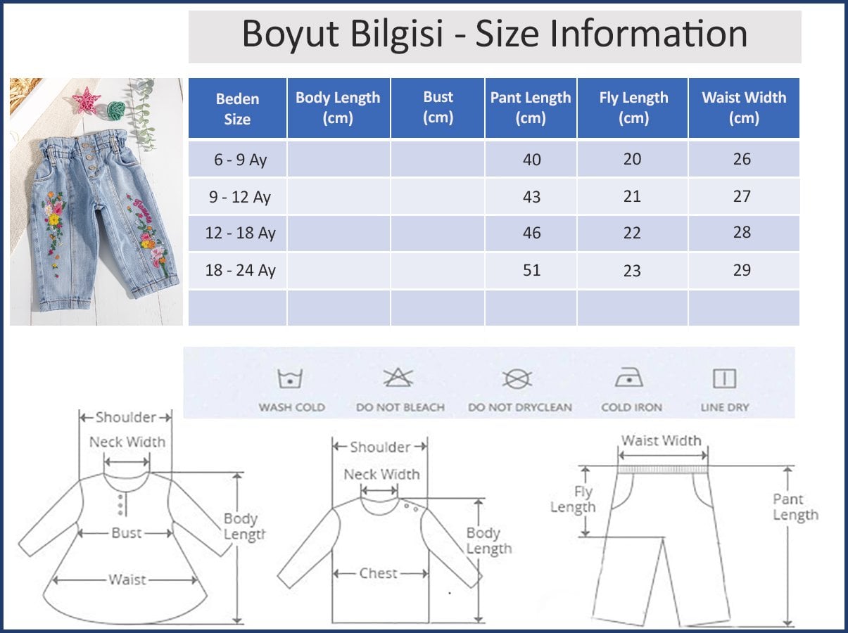 - Bebek pantolonun kalıbı standarttır ,kullandığınız bedeni terçih edebilirsiniz.