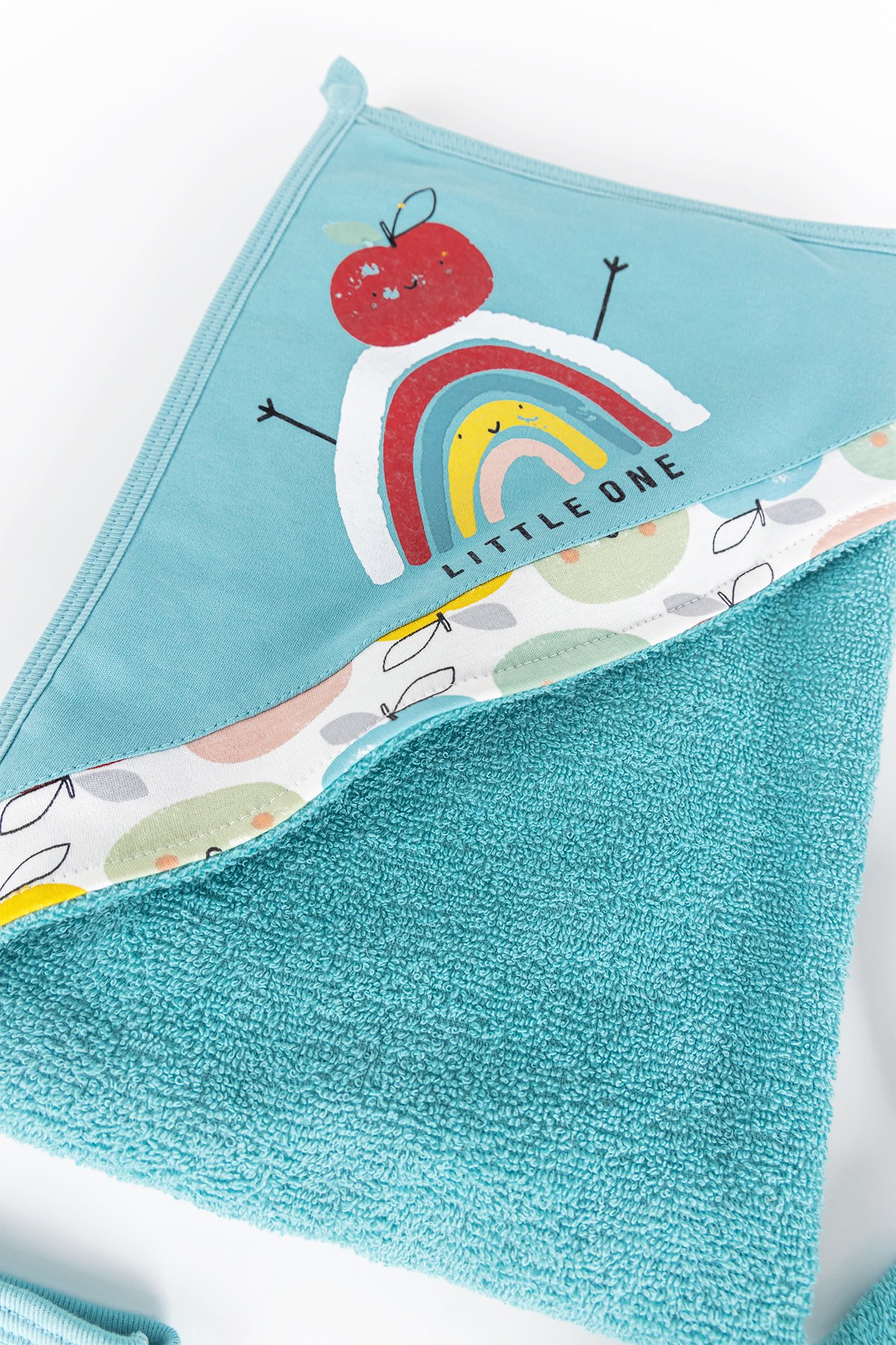 - The head of the baby towel is rainbow figured.
