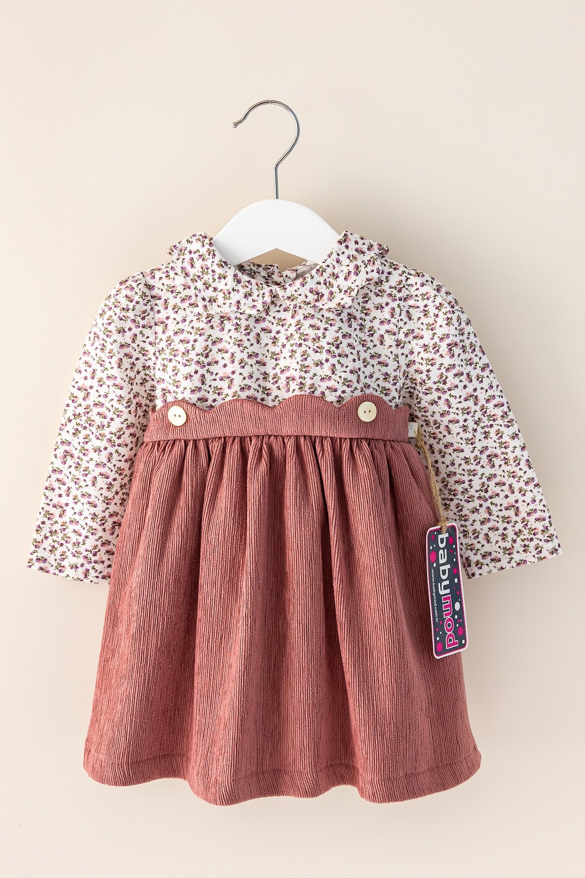 - Elbisenin yakası bebe yakalı gömlek detaylıdır.