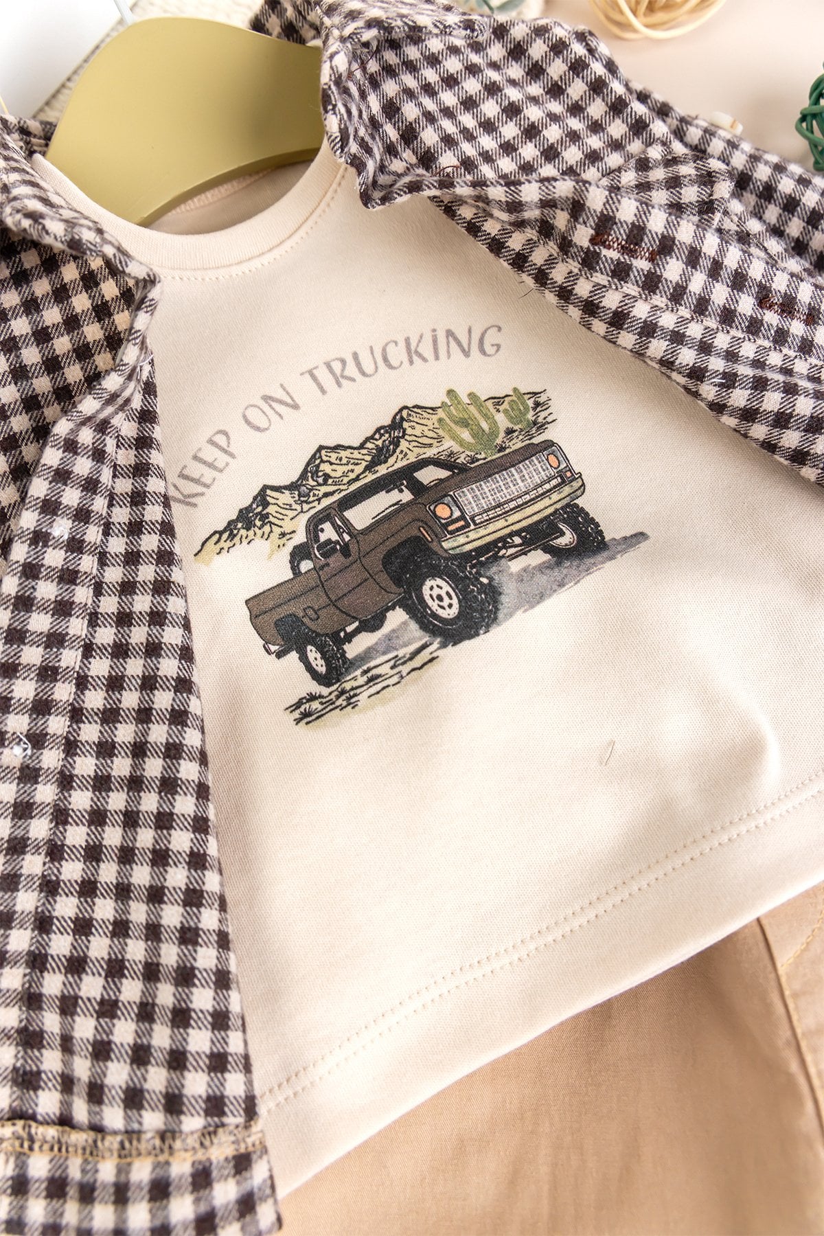 - Takım; gömlek, pantolon ve koordineli ekstra parça sweat olmak üzere üç parçadan oluşur. Gömlek kısmı klasik gömlek yaka detaylı olup, pantolon ise lastikli bel tasarımıyla kolay giydirme imkanı tanır.